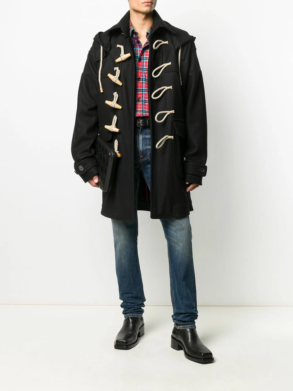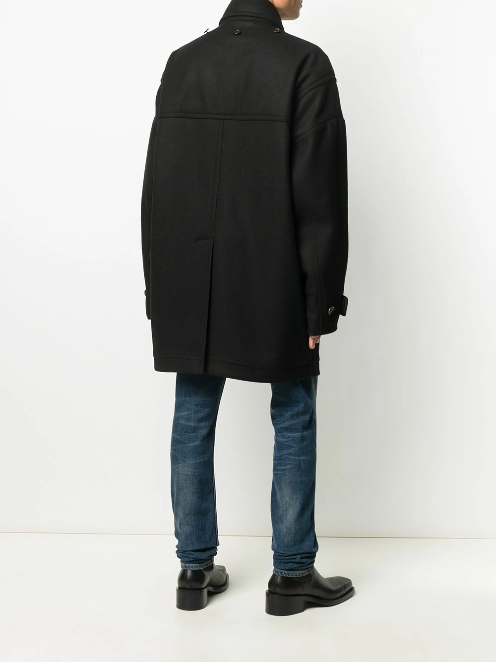 Capuche à lien de resserrage, fermeture duffle-coat sur le devant, manches longues, deux poches plaquées avant, fente arrière. Couleur : noir. Matière : laine vierge.