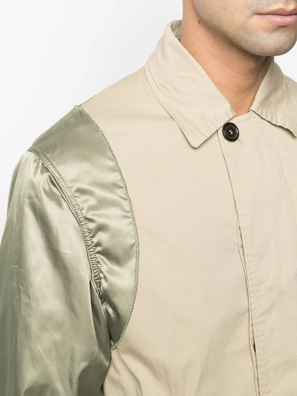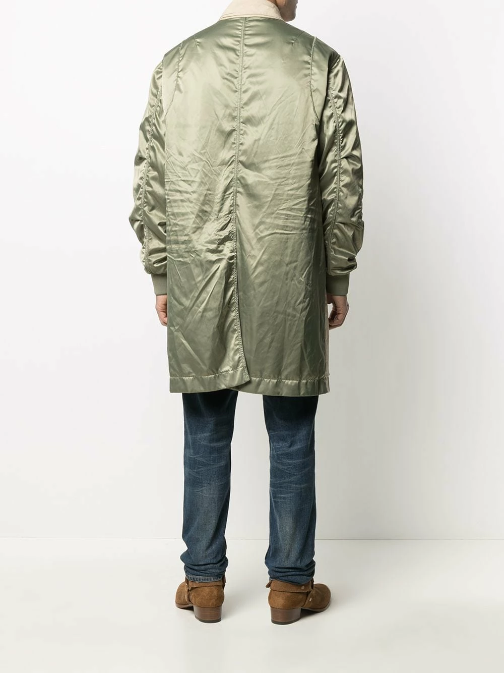 Col classique, boutonnière dissimulée sur le devant, manches longues, deux poches latérales passepoilées, coupe mi-longue.