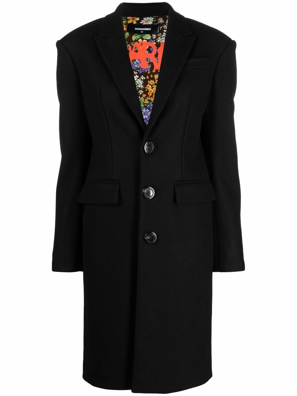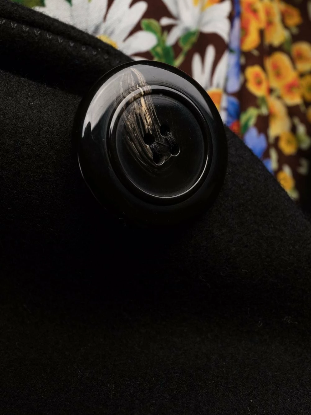 Design en maille, revers pointus, boutonnière sur le devant, manches longues, poignets boutonnés, poche passepoilée sur la poitrine, deux poches latérales à rabat, coupe mi-longue, fente arrière centrale. Couleur : noir.