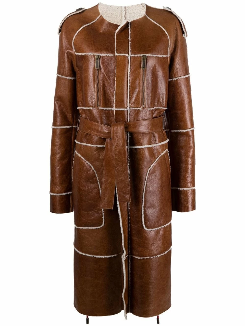 Design à empiècements, épaulettes, encolure ronde, fermeture zippée devant, taille ceinturée, manches longues, poches à fermeture zippée devant, deux poches latérales fendues, coupe mi-longue, doublure en mouton retourné.