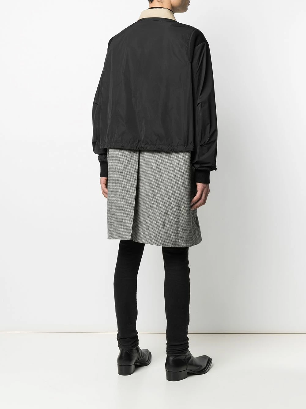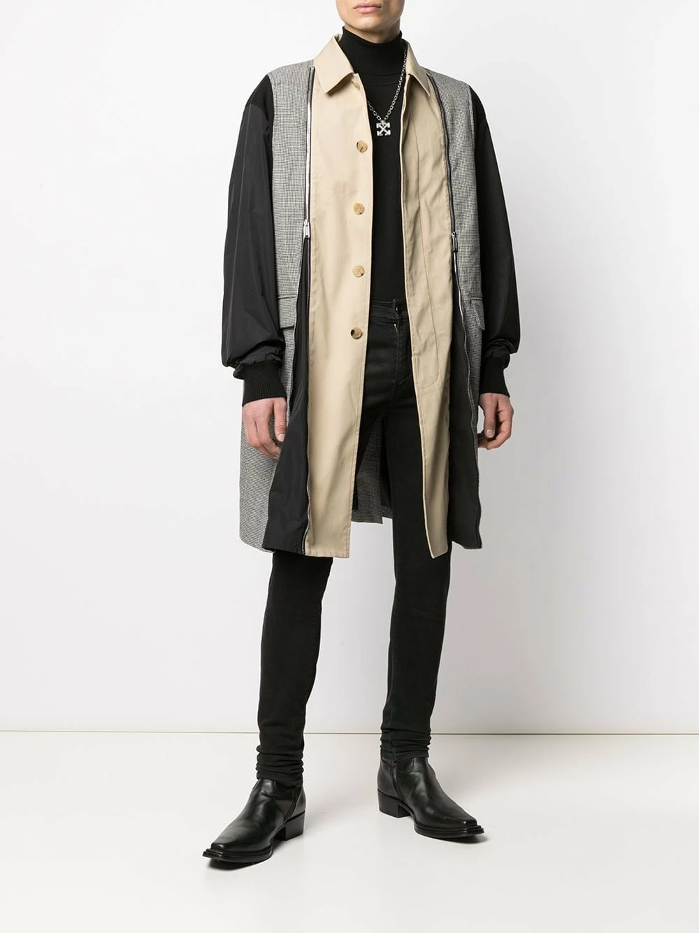Design patchwork, imprimé à carreaux, col classique, manches longues, poignets nervurés, boutonnière dissimulée sur le devant, deux poches latérales à rabat, fente arrière.