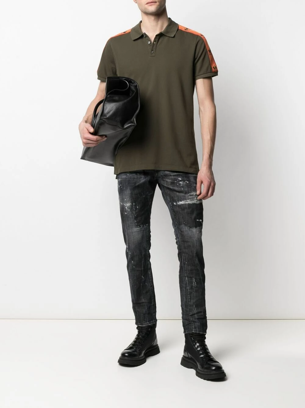 Finition à bande logo, col polo, patte de boutonnage sur le devant, manches courtes, ourlet plus long au dos. Couleur : vert. Matière : coton.