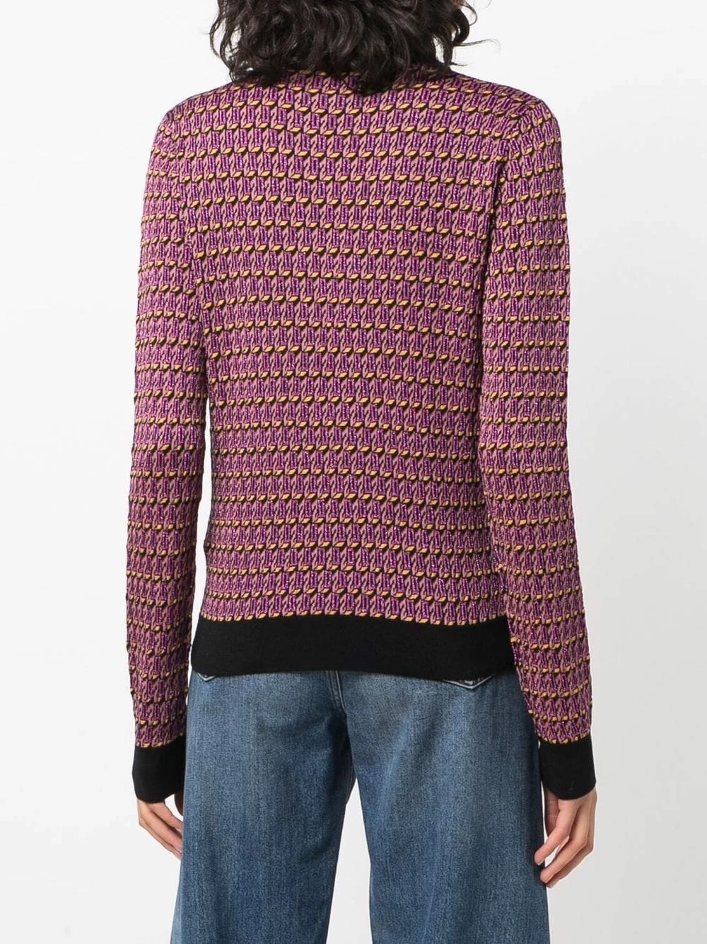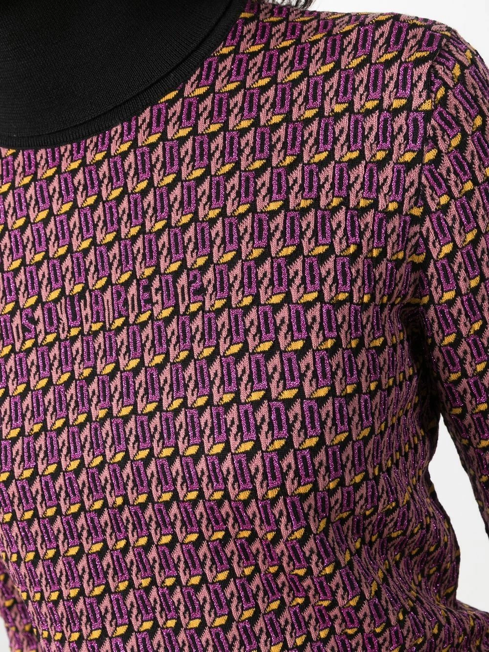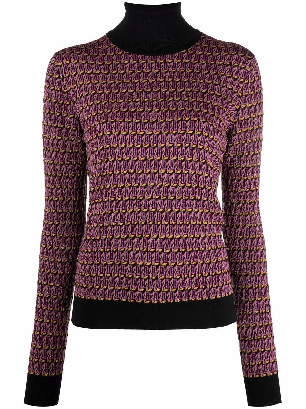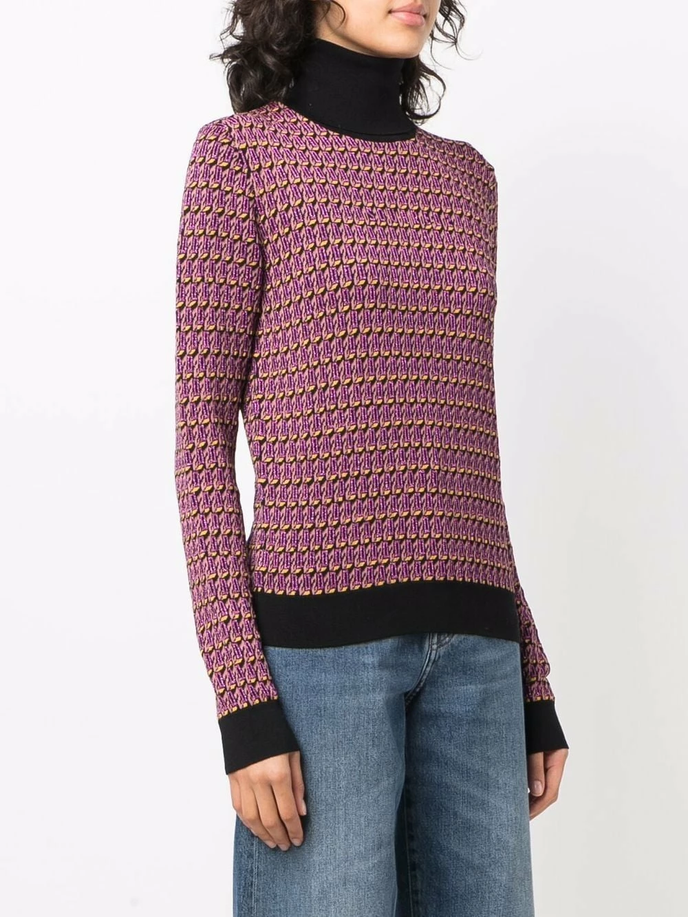 Tissage métallisé, maille intarsia, col roulé, manches longues, poignets nervurés, ourlet nervuré.