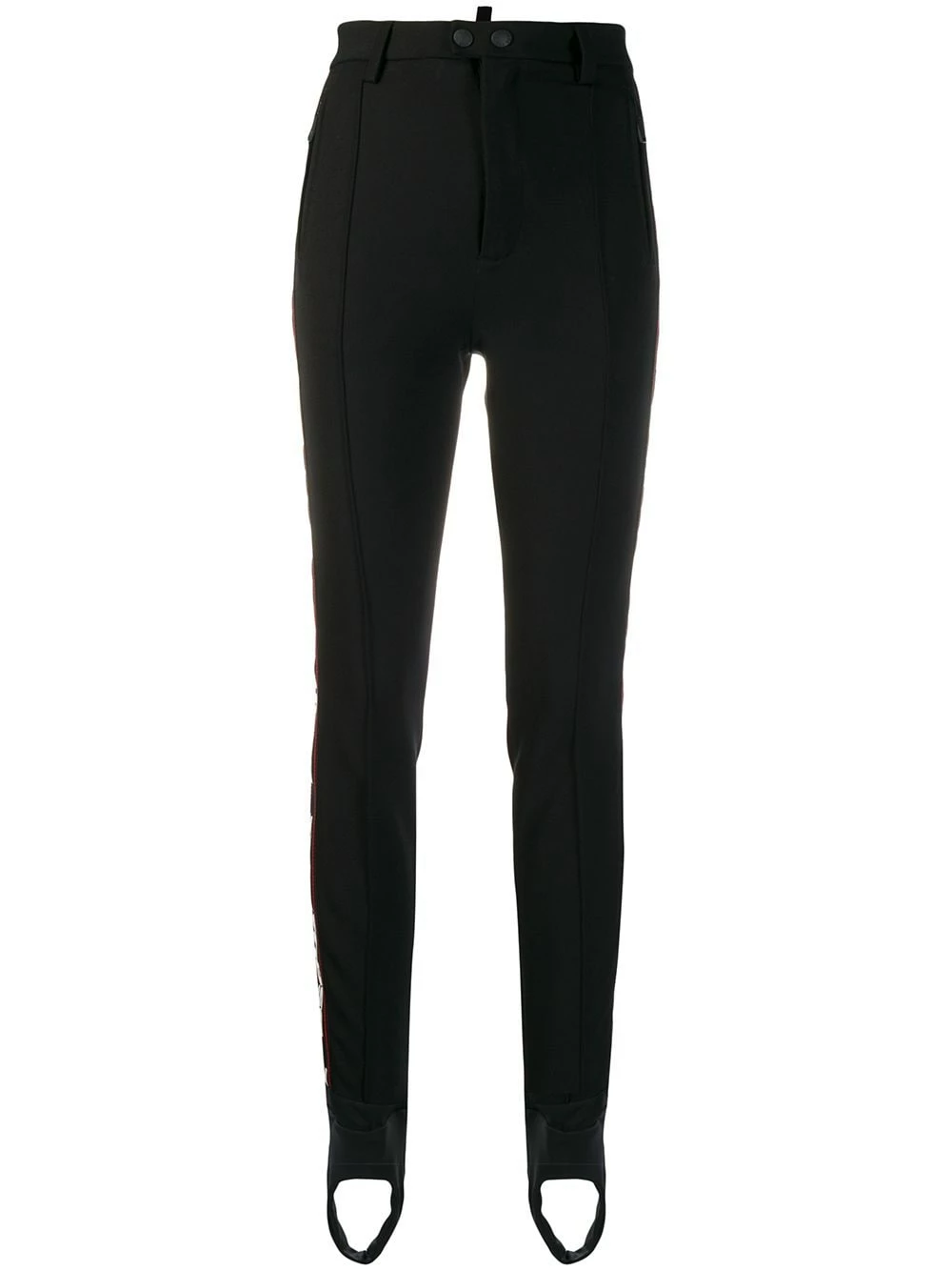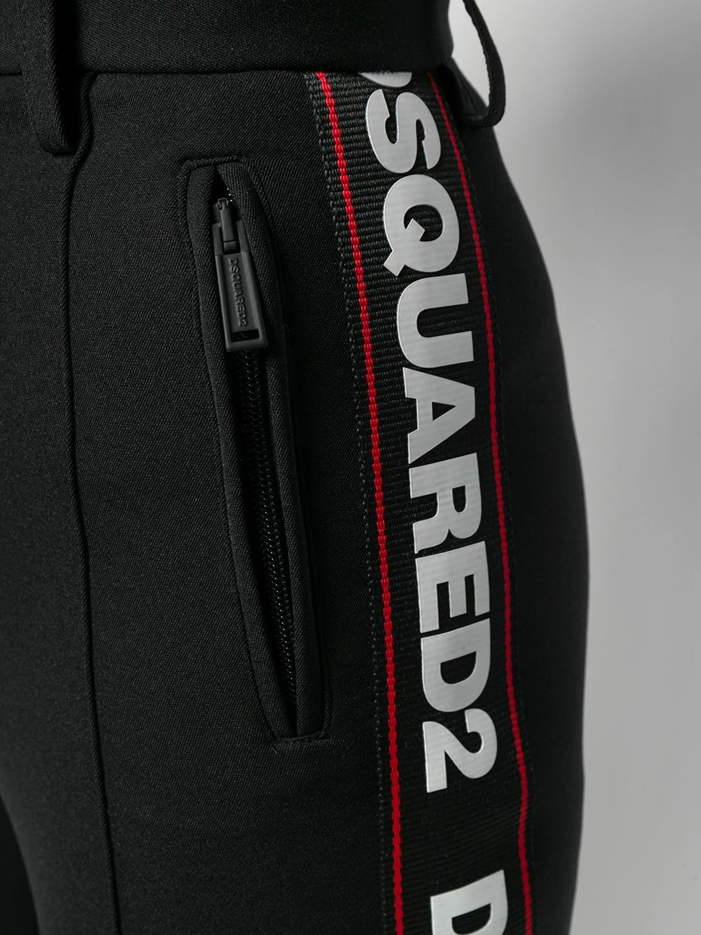Pantalon à bandes logo Dsquared2 avec bouton et zip, passants de ceinture, poches latérales zippées et coupe skinny. Couleur : noir.