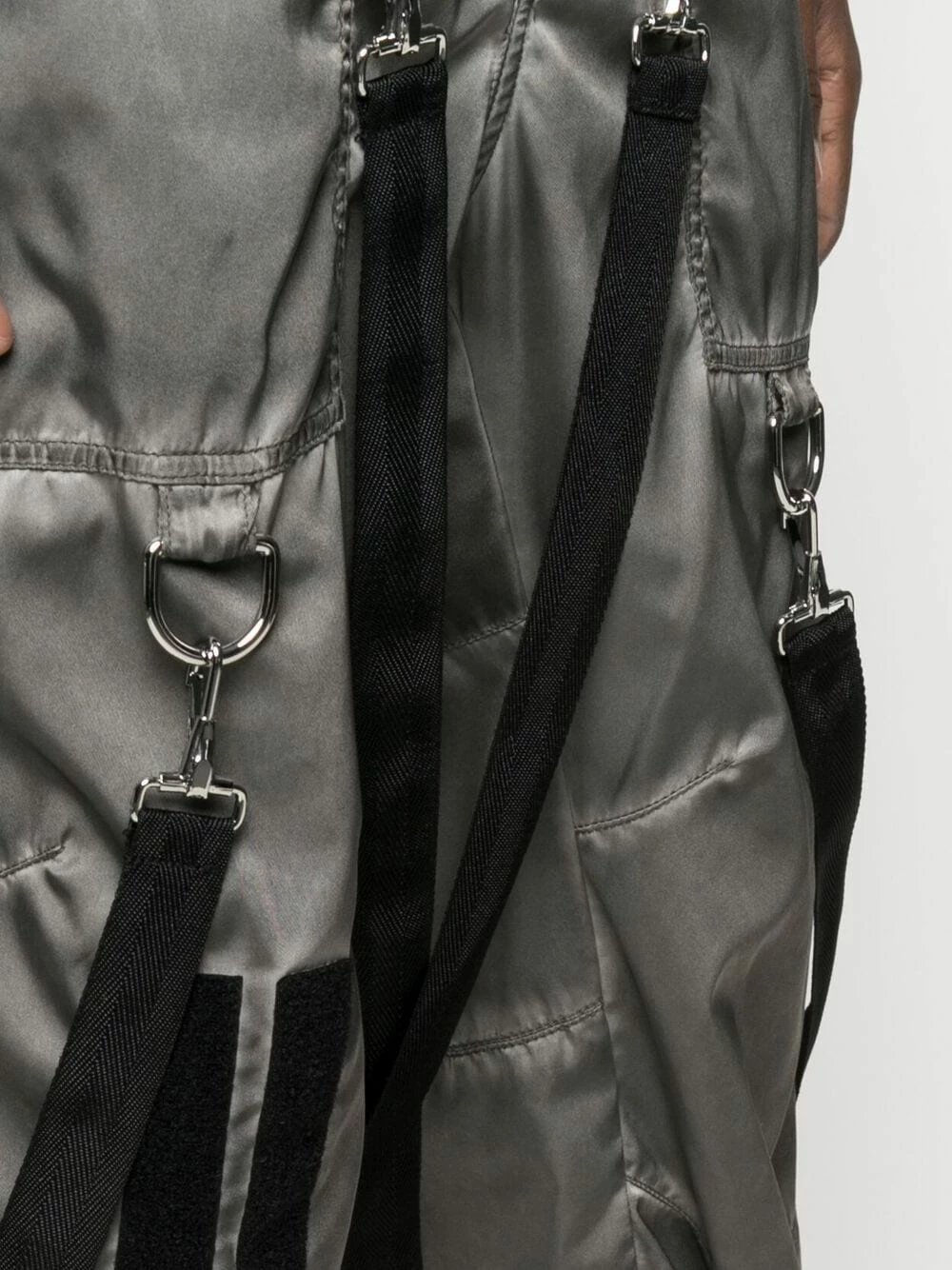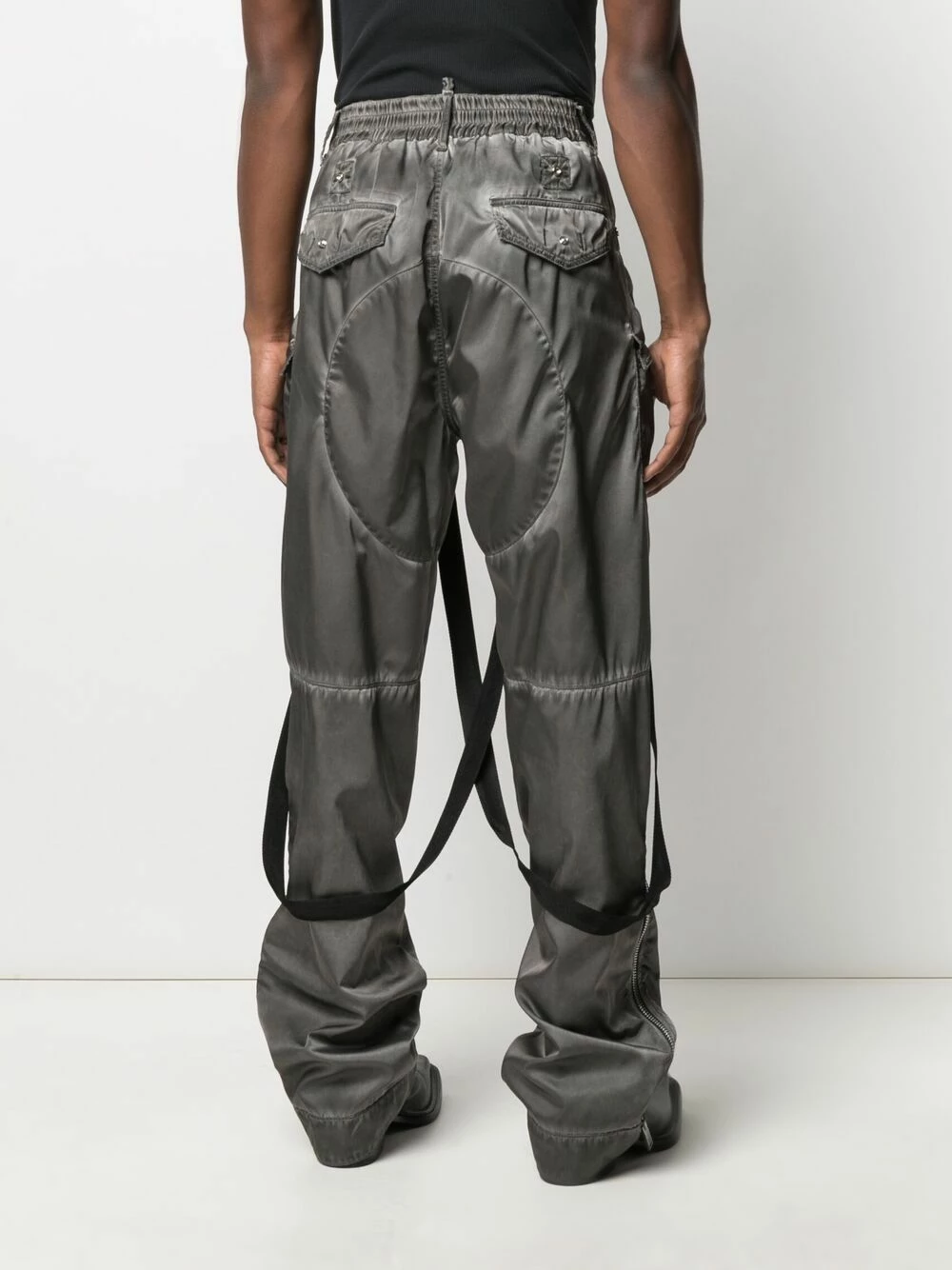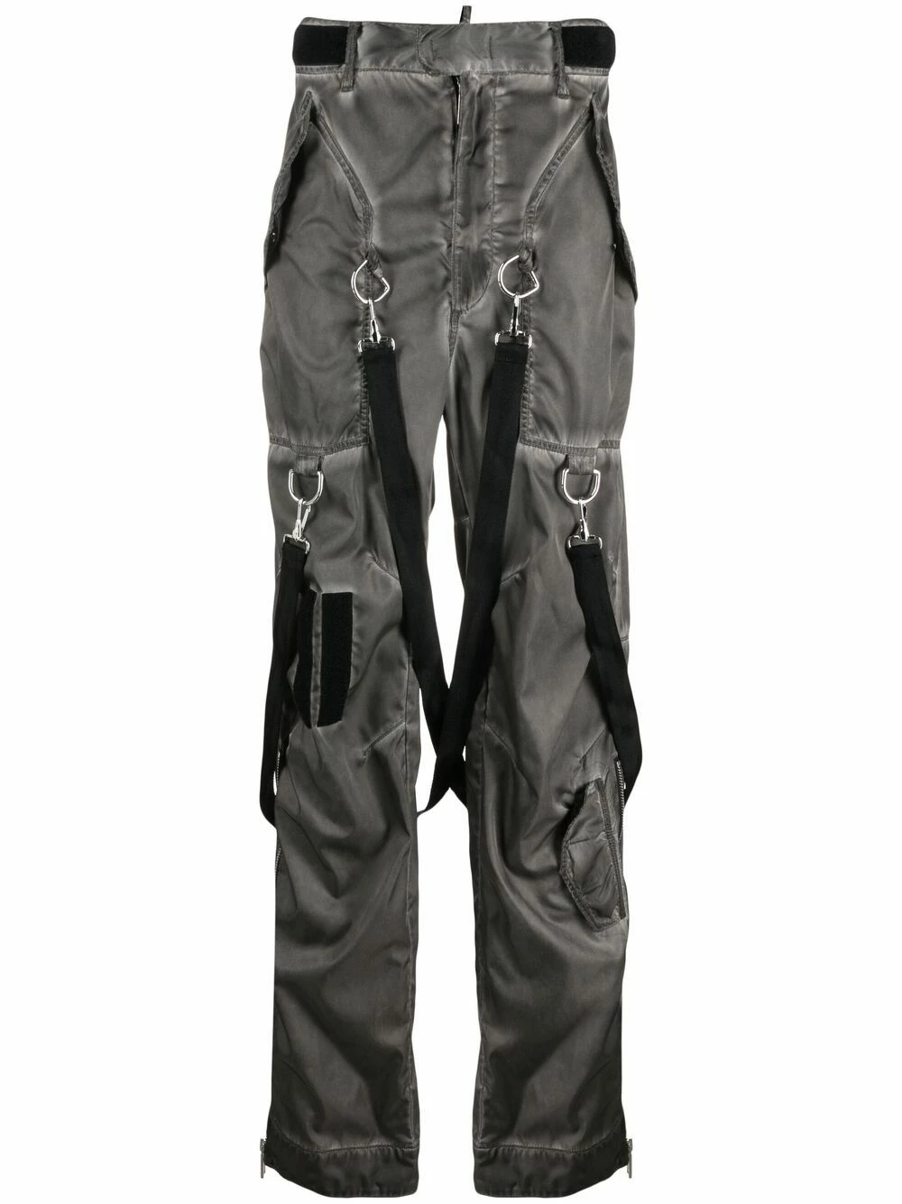 Ceinture élastique, taille mi-haute, passants de ceinture, coutures ton sur ton, fermeture dissimulée sur le devant, poches latérales à rabat, ornements argentés, poches arrière à rabat, poches cargo multiples, fermeture zippée sur le côté, effet délavé, détails de brides. Matière : coton.