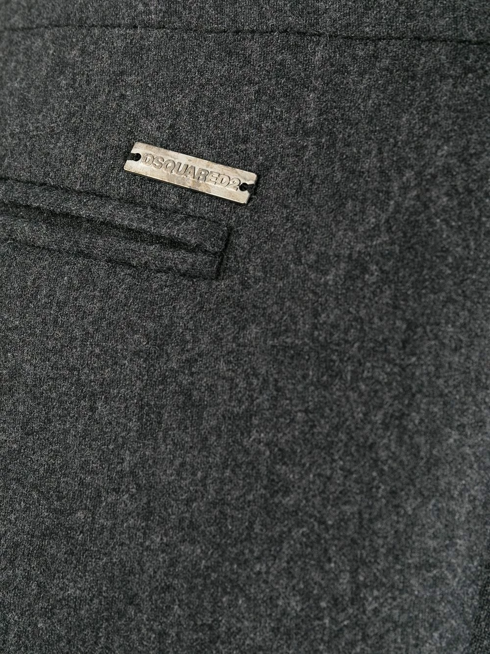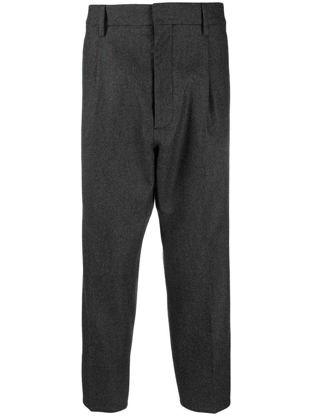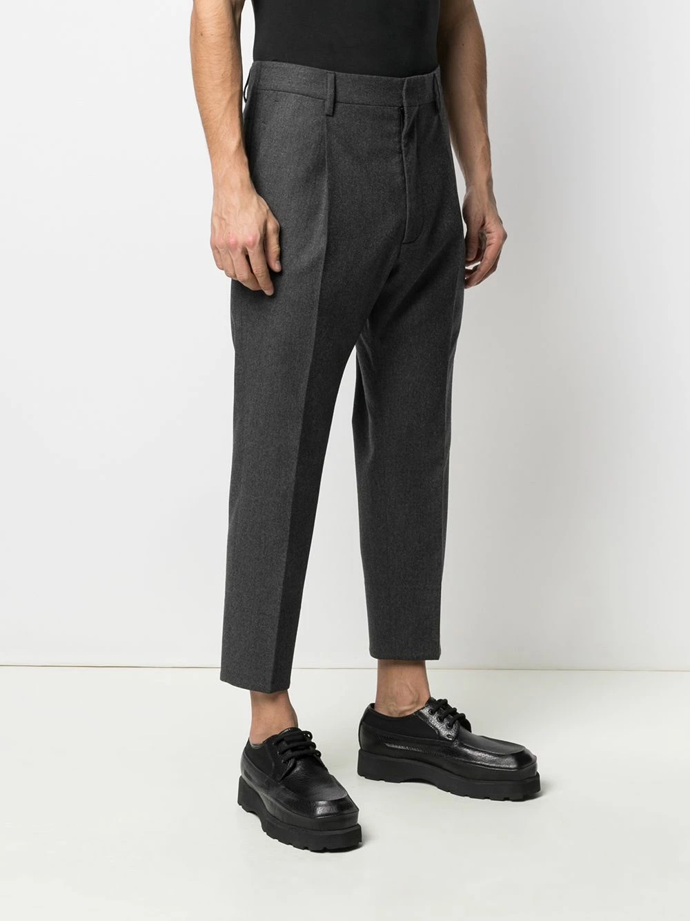 Boutonnière dissimulée sur le devant, passants de ceinture, deux poches latérales passepoilées, longueur crop. Couleur : Gris.