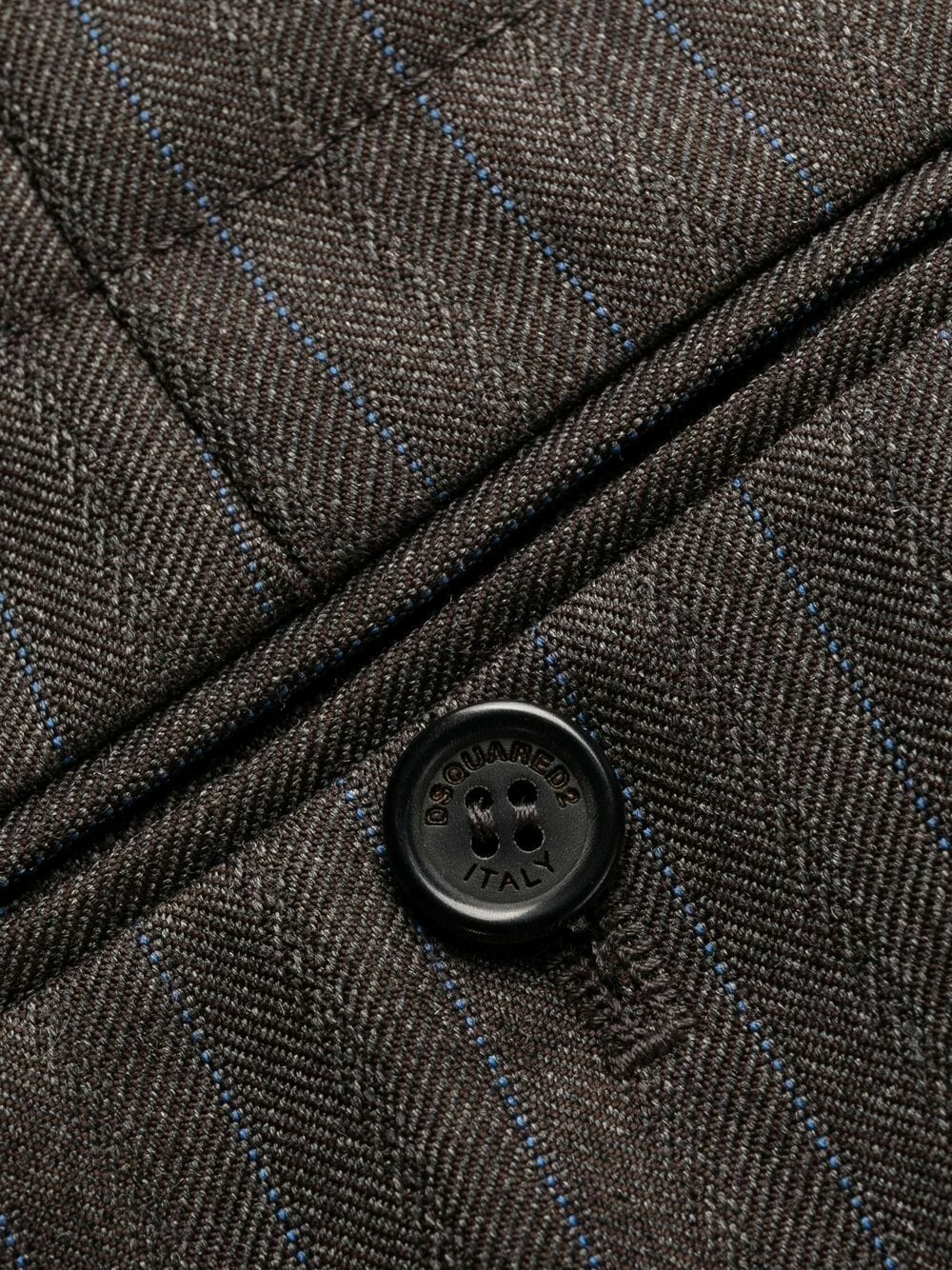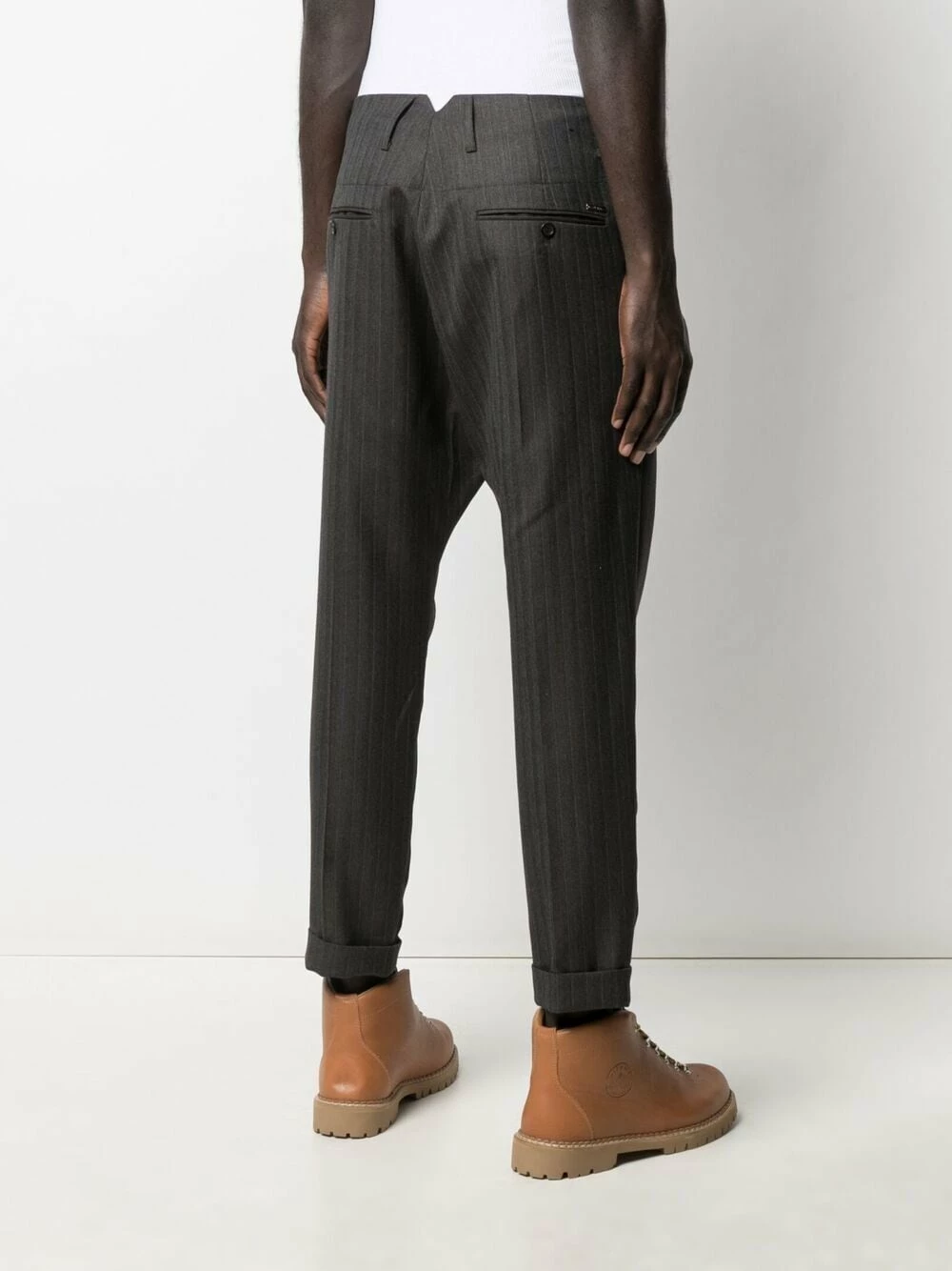 Fines rayures, passants de ceinture, fermeture dissimulée sur le devant, détails de plis, empiècements contrastants, deux poches latérales fendues, poches arrière passepoilées, longueur crop. Matière : laine vierge.