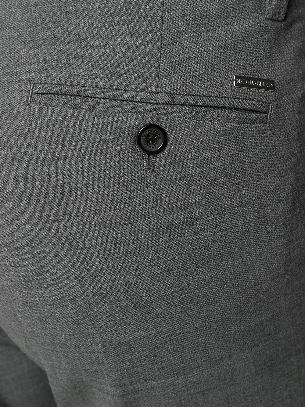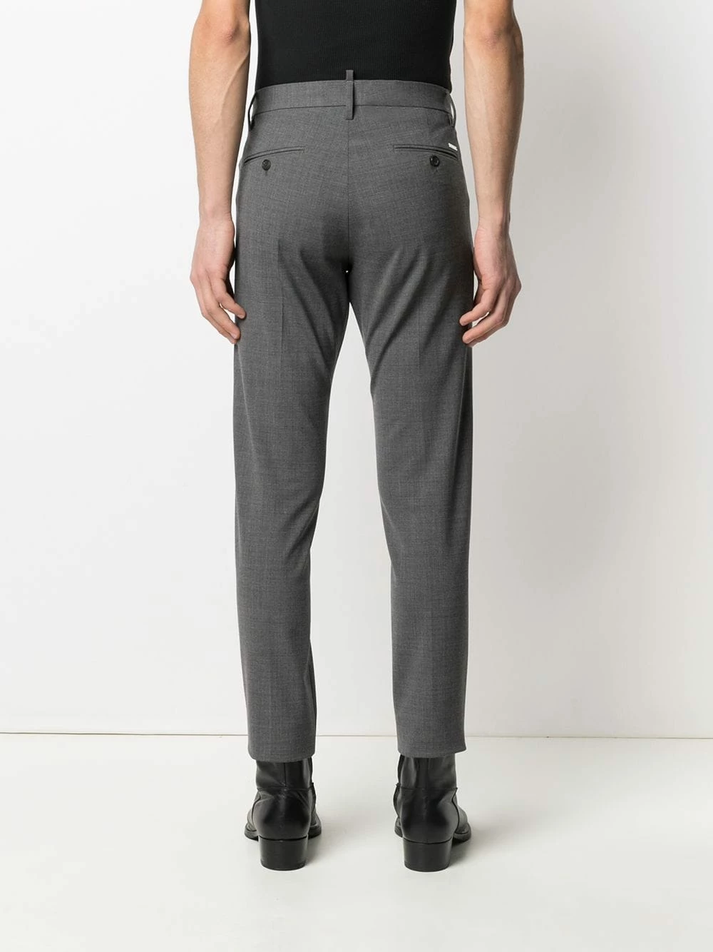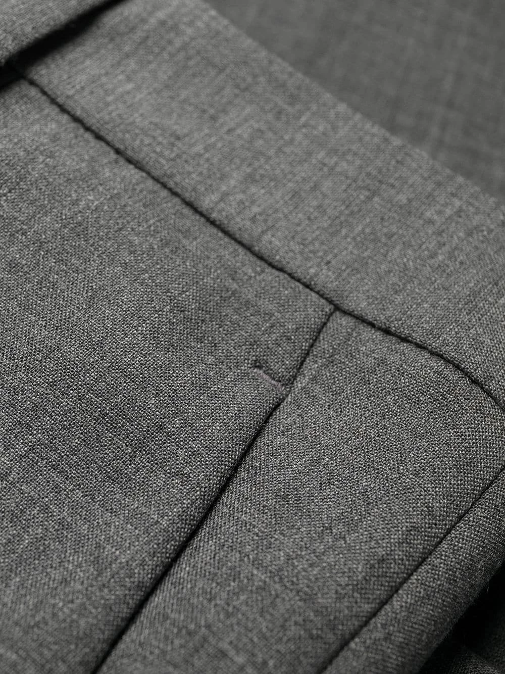 Passants de ceinture, fermeture dissimulée sur le devant, poches plaquées latérales, coutures ton sur ton, poches arrière passepoilées, coupe fuselée, coupe classique. Couleur : gris.