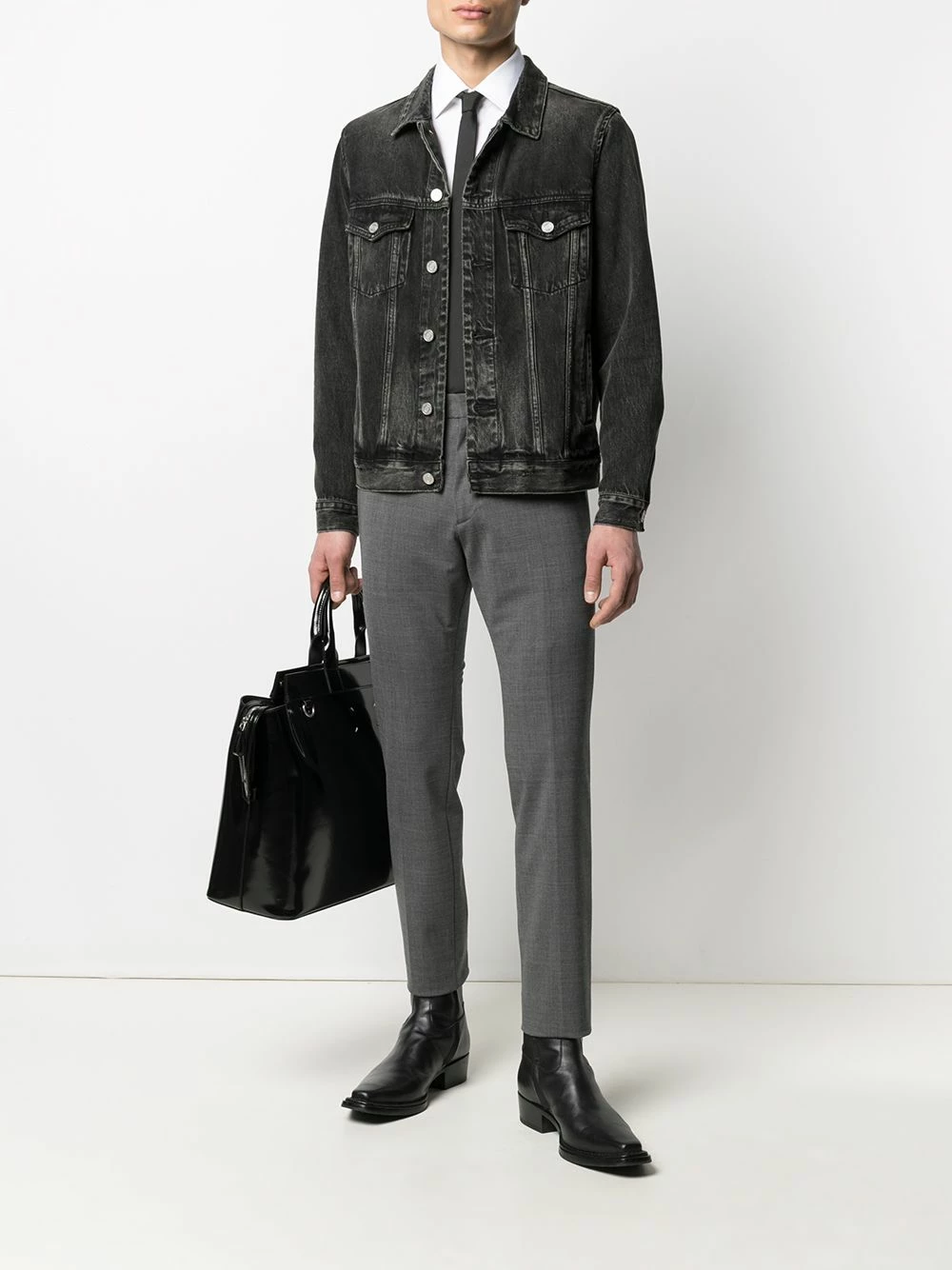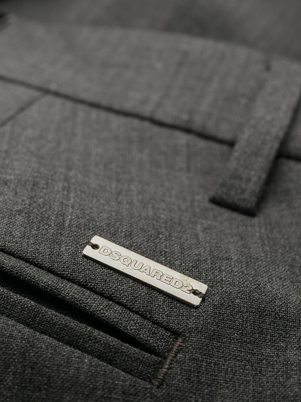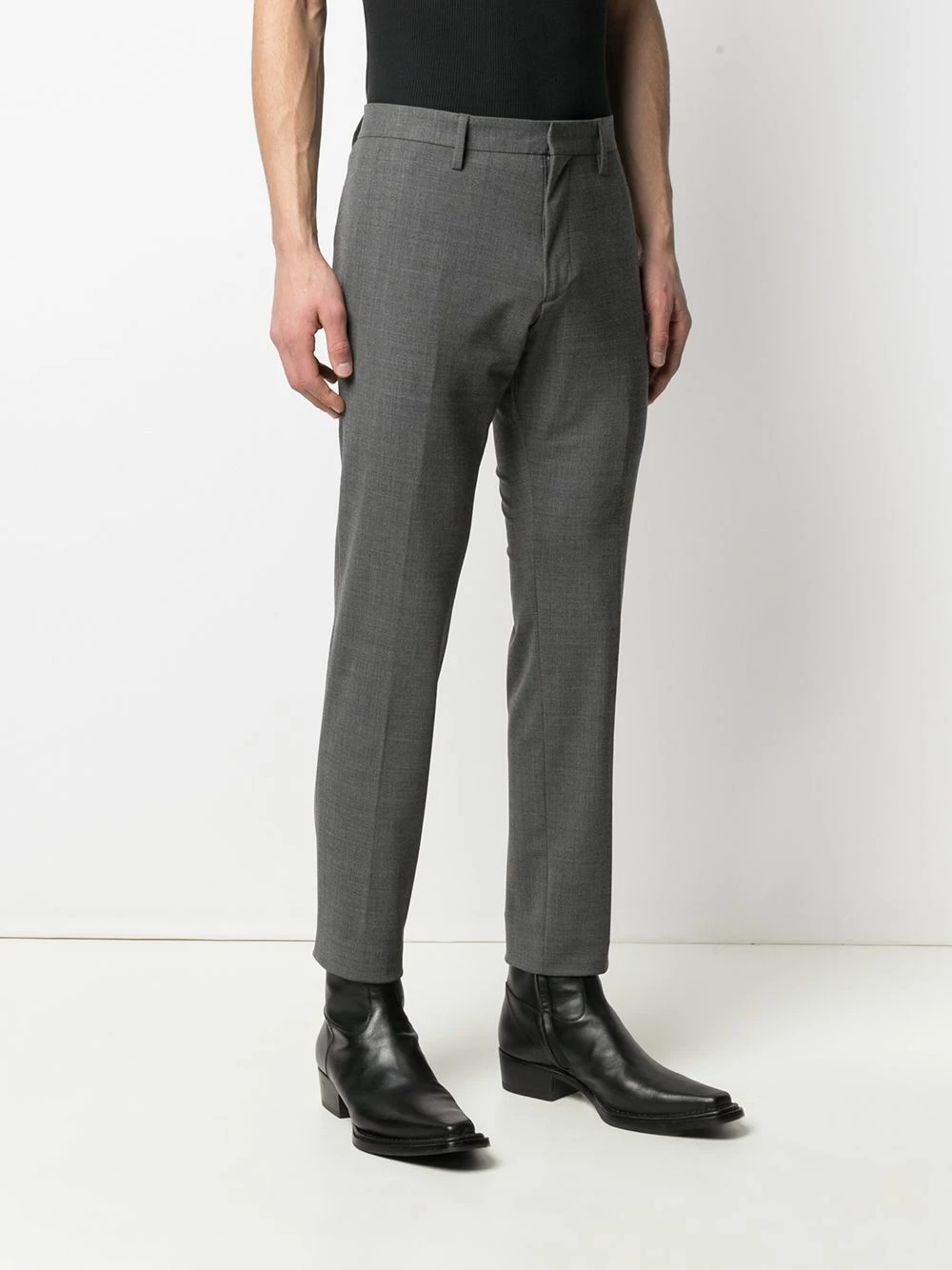 Passants de ceinture, fermeture dissimulée sur le devant, poches plaquées latérales, coutures ton sur ton, poches arrière passepoilées, coupe fuselée, coupe classique. Couleur : gris.