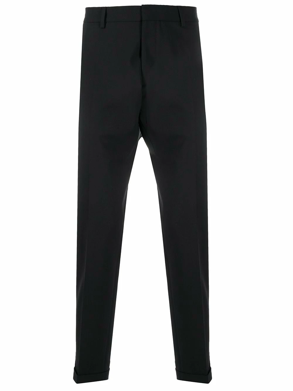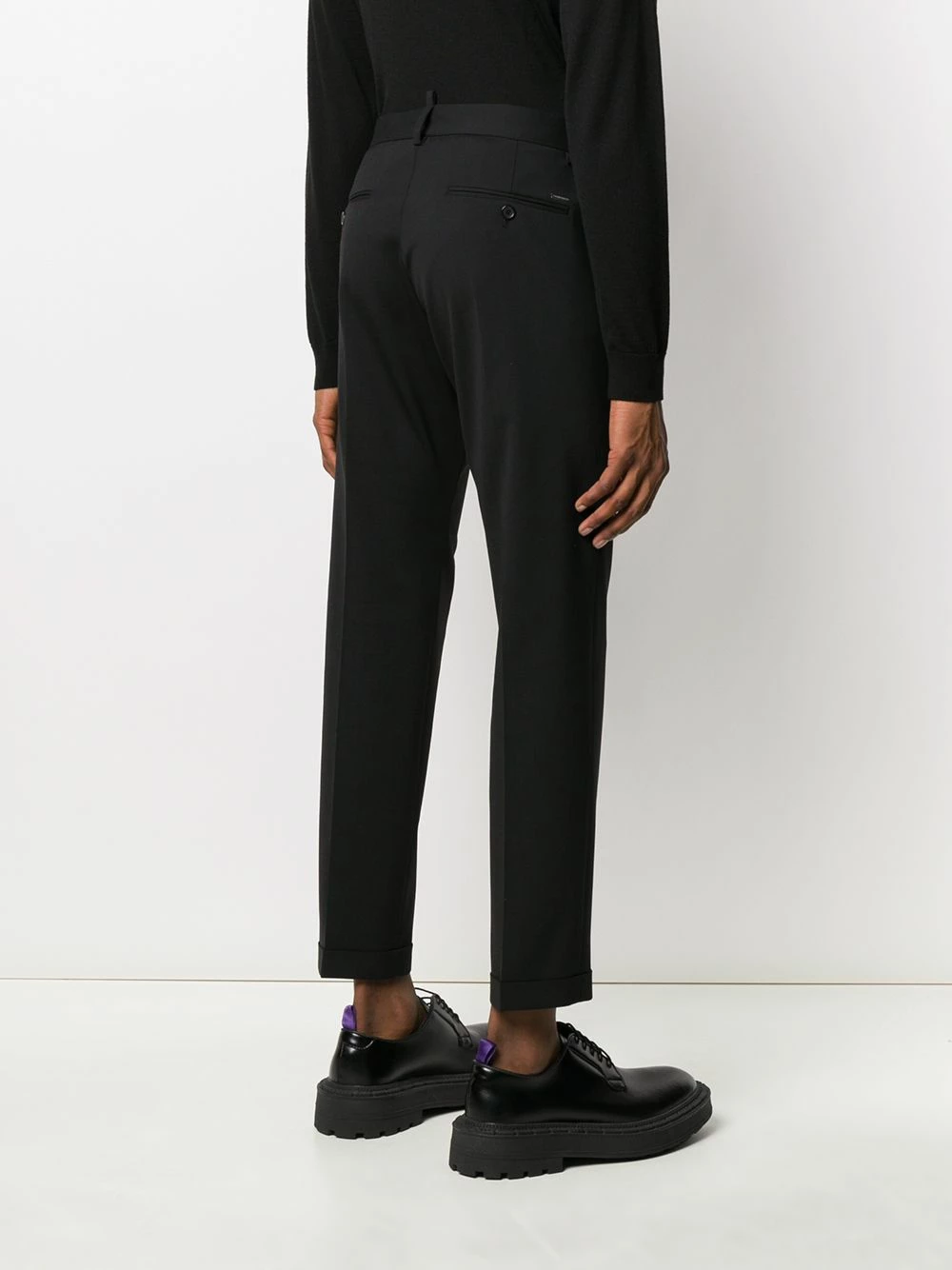 Pantalon de costume fuselé Dsquared2 avec design ajusté, taille normale, coupe fuselée, ourlet à revers, poches latérales fendues, poches arrière à rabat boutonné, plaque logo au dos, passants de ceinture et fermeture sur le devant. Couleur : noir.