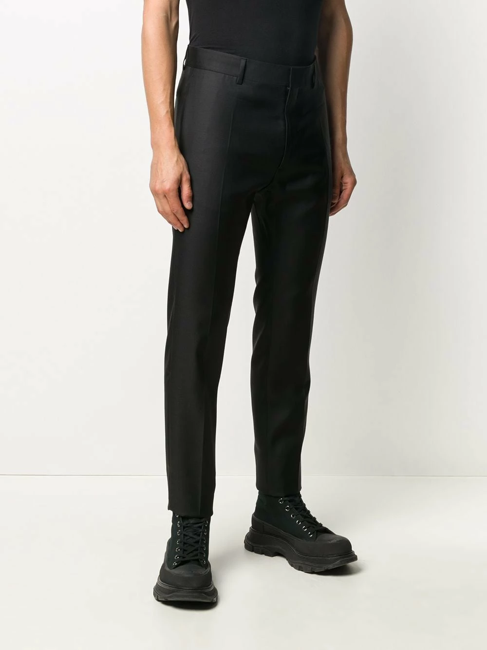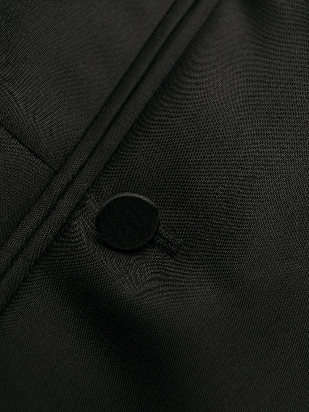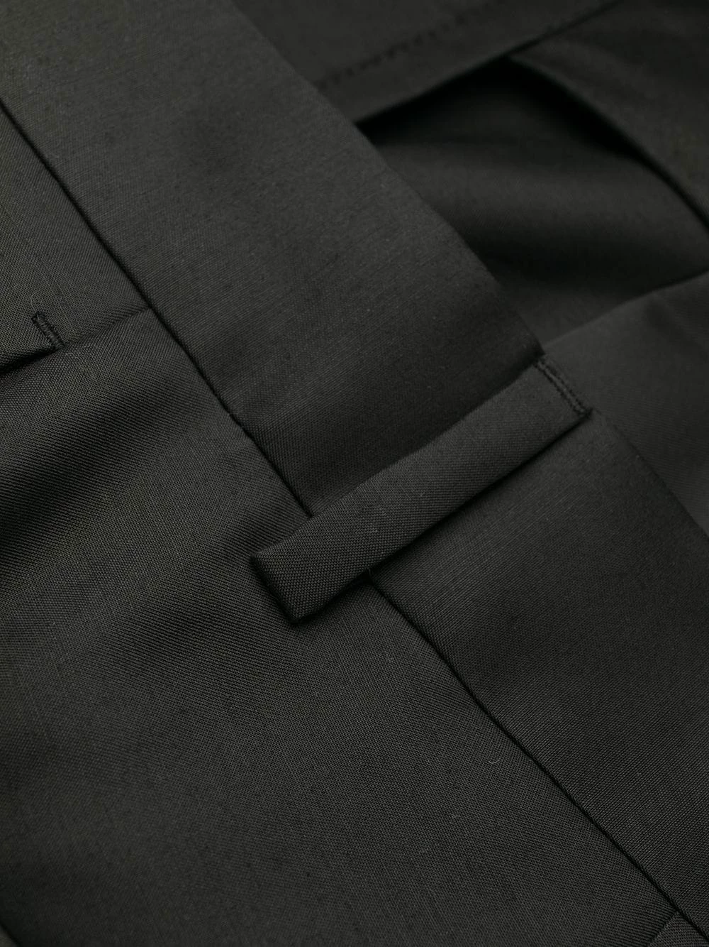 Taille normale, passants de ceinture, fermeture dissimulée sur le devant, deux poches latérales passepoilées, deux poches arrières boutonnées, coupe ajustée. Couleur : noir.
