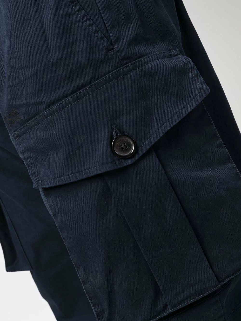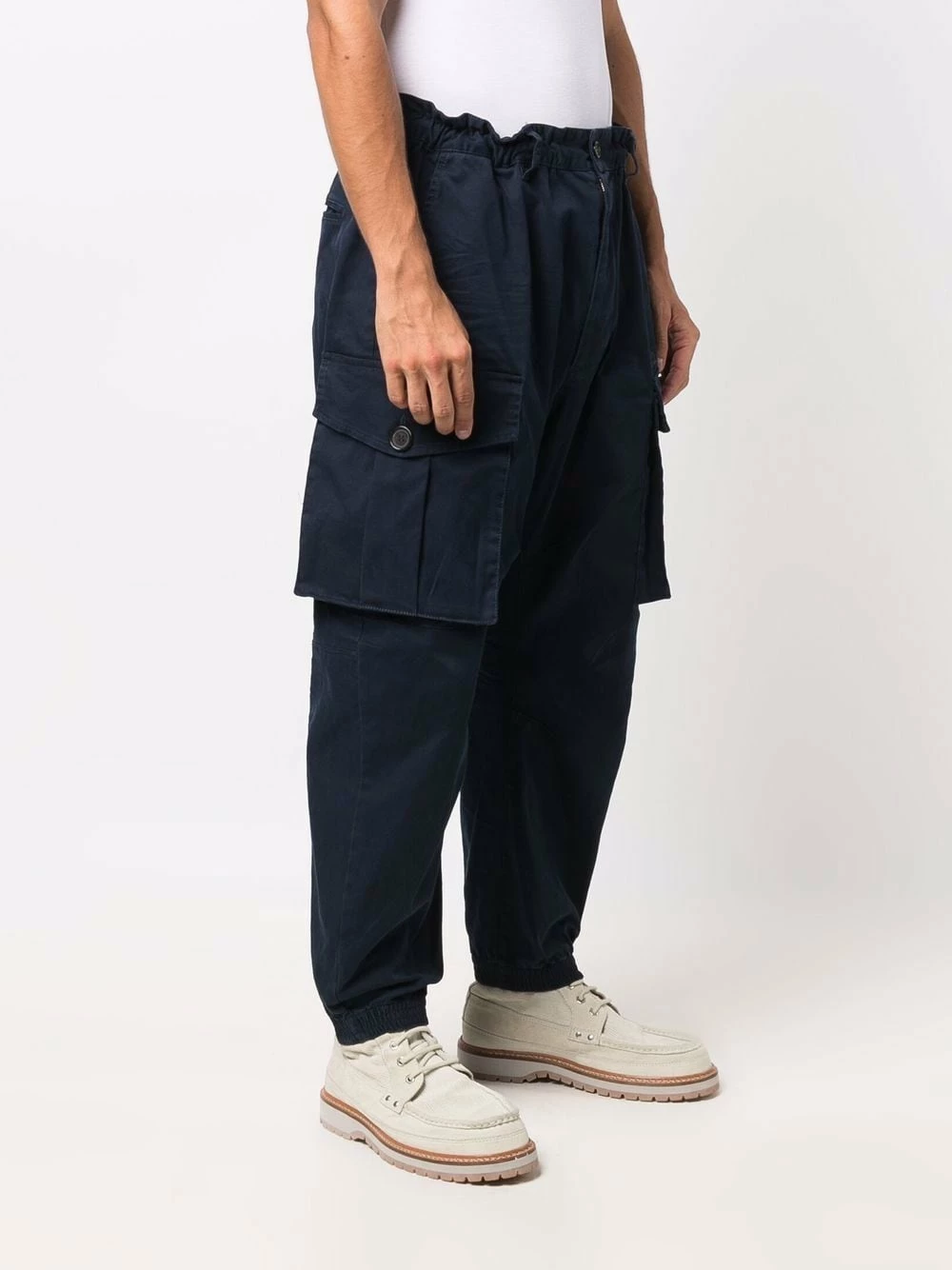 Ceinture élastique, fermeture à zip et boutons sur le devant, poches latérales à rabat, deux poches arrières boutonnées, coupe fuselée. Matière : coton mélangé.