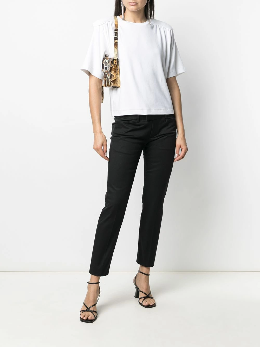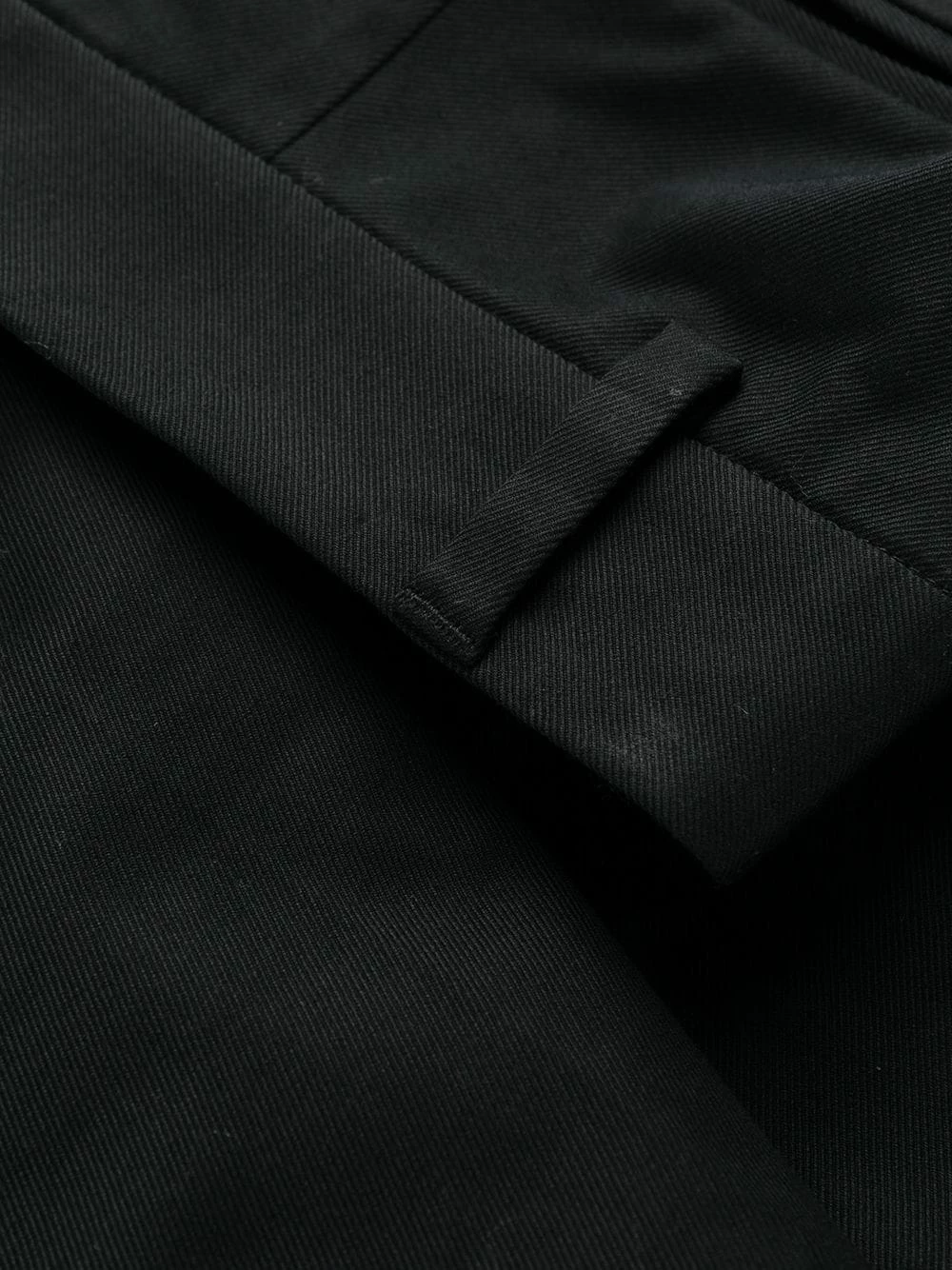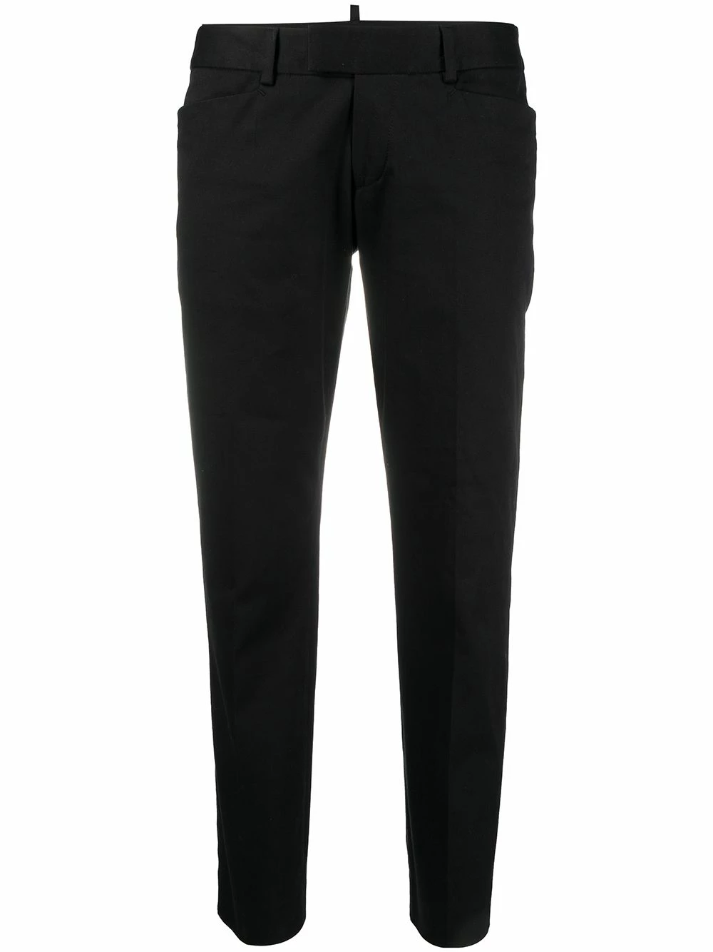 Taille basse, coupe ajustée, passants de ceinture, fermeture à zip et agrafes, deux poches passepoilées avant, poches arrière passepoilées. Couleur : noir.