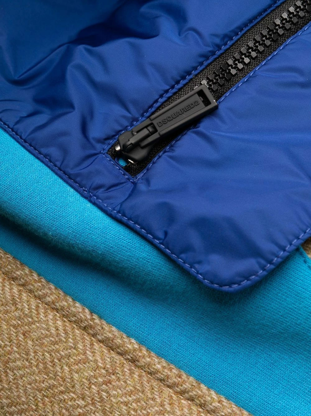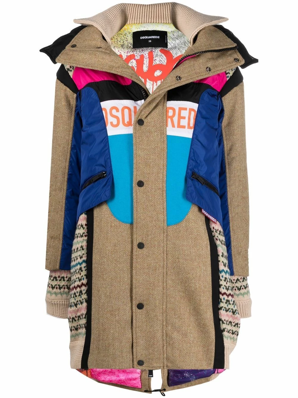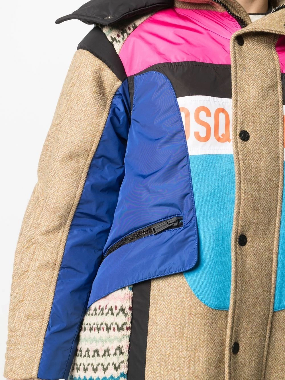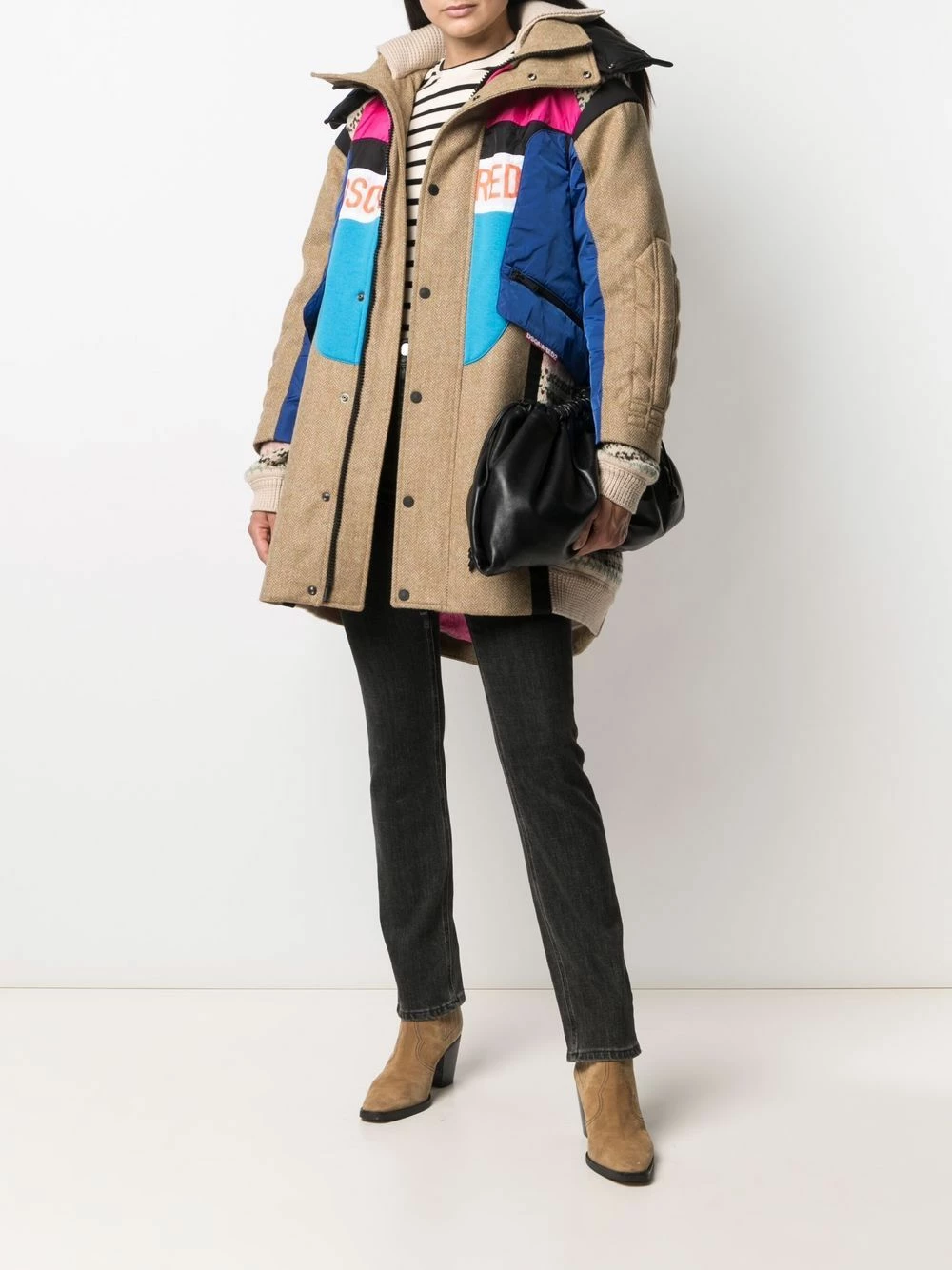 Design à empiècements, motif de chevrons, capuche détachable, col montant, fermeture dissimulée sur le devant, fermeture à boutons pression sur le devant, manches longues, deux poches zippées, ourlet incurvé au dos, ourlet à lien de resserrage.