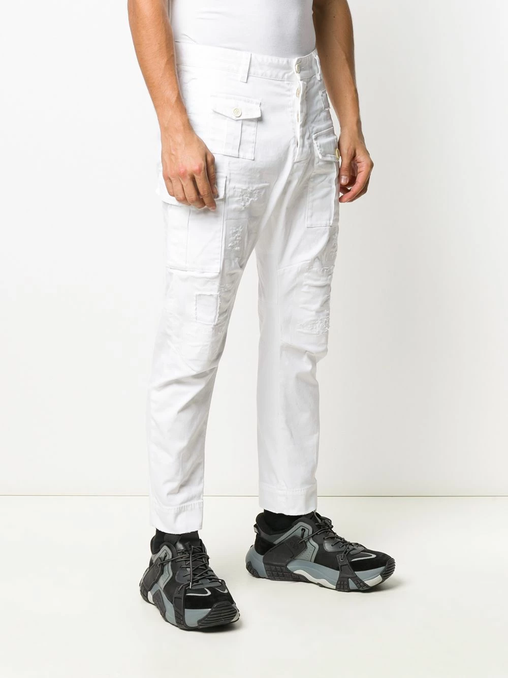 Boutonnière sur le devant, passants de ceinture, deux poches latérales passepoilées, deux poches latérales à rabat, coupe fuselée. Couleur : blanc. Matière : coton.