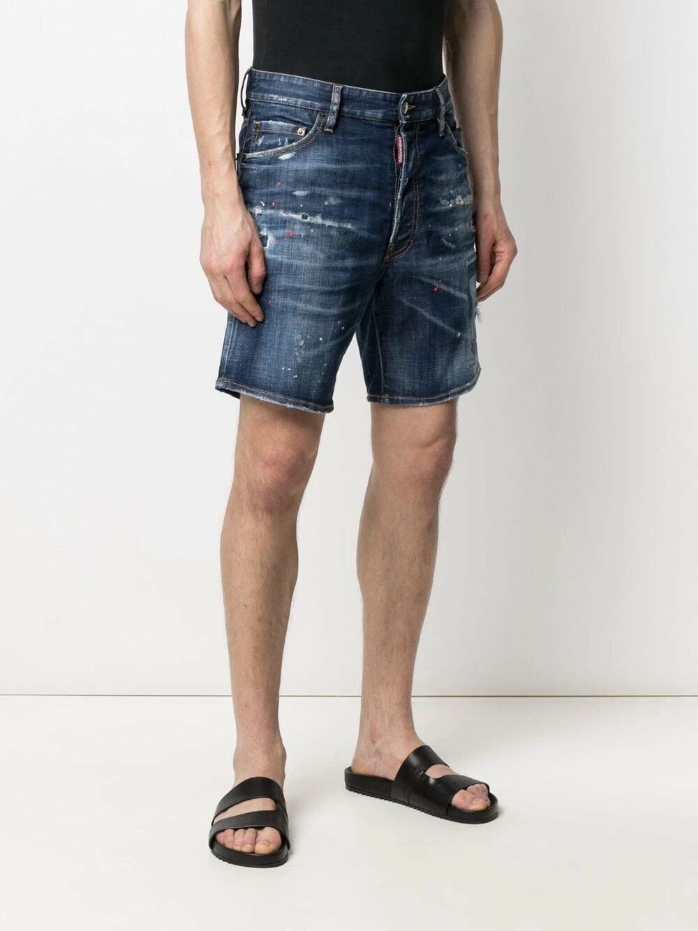 Effet usé, finitions effilochées, passants de ceinture, fermeture dissimulée sur le devant, 5 poches classiques, patch logo sur l’arrière, hauteur genou. Matière : coton mélangé.