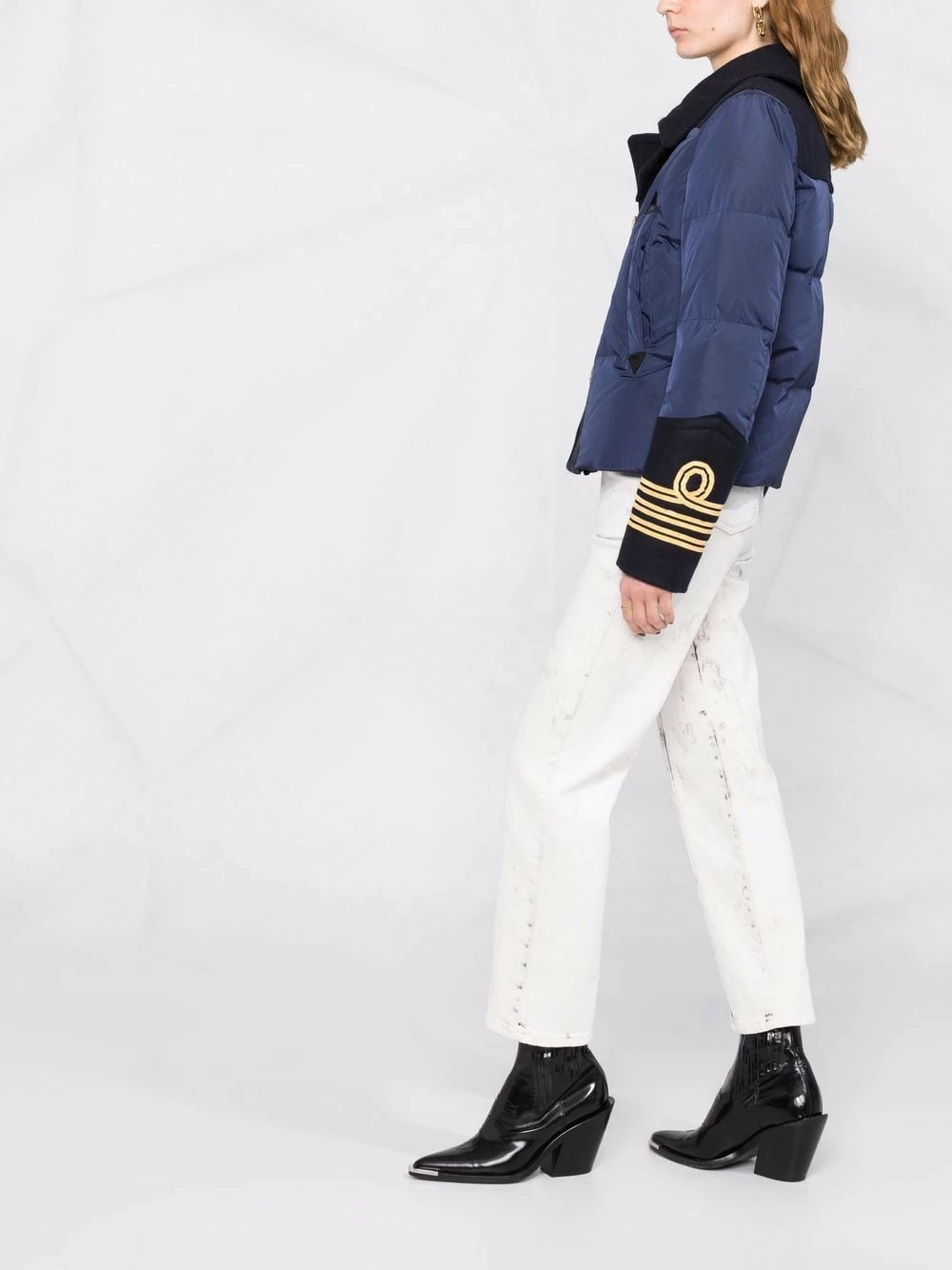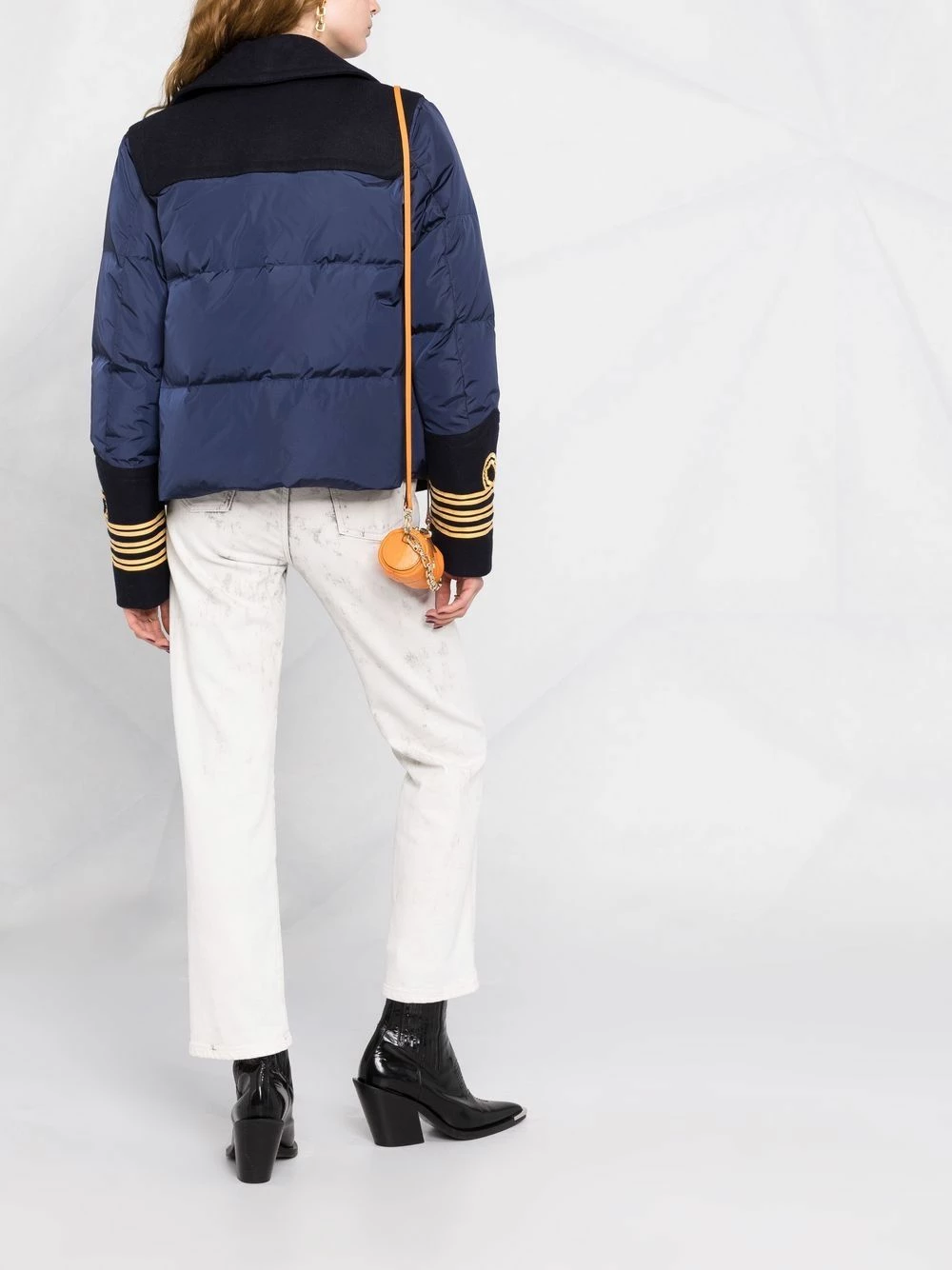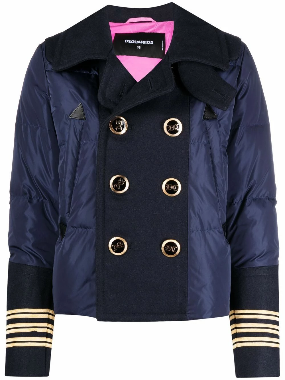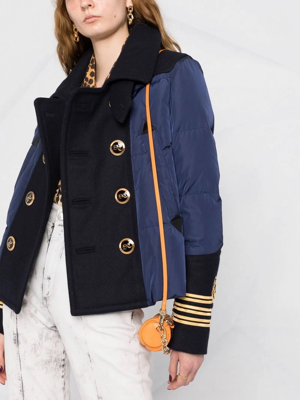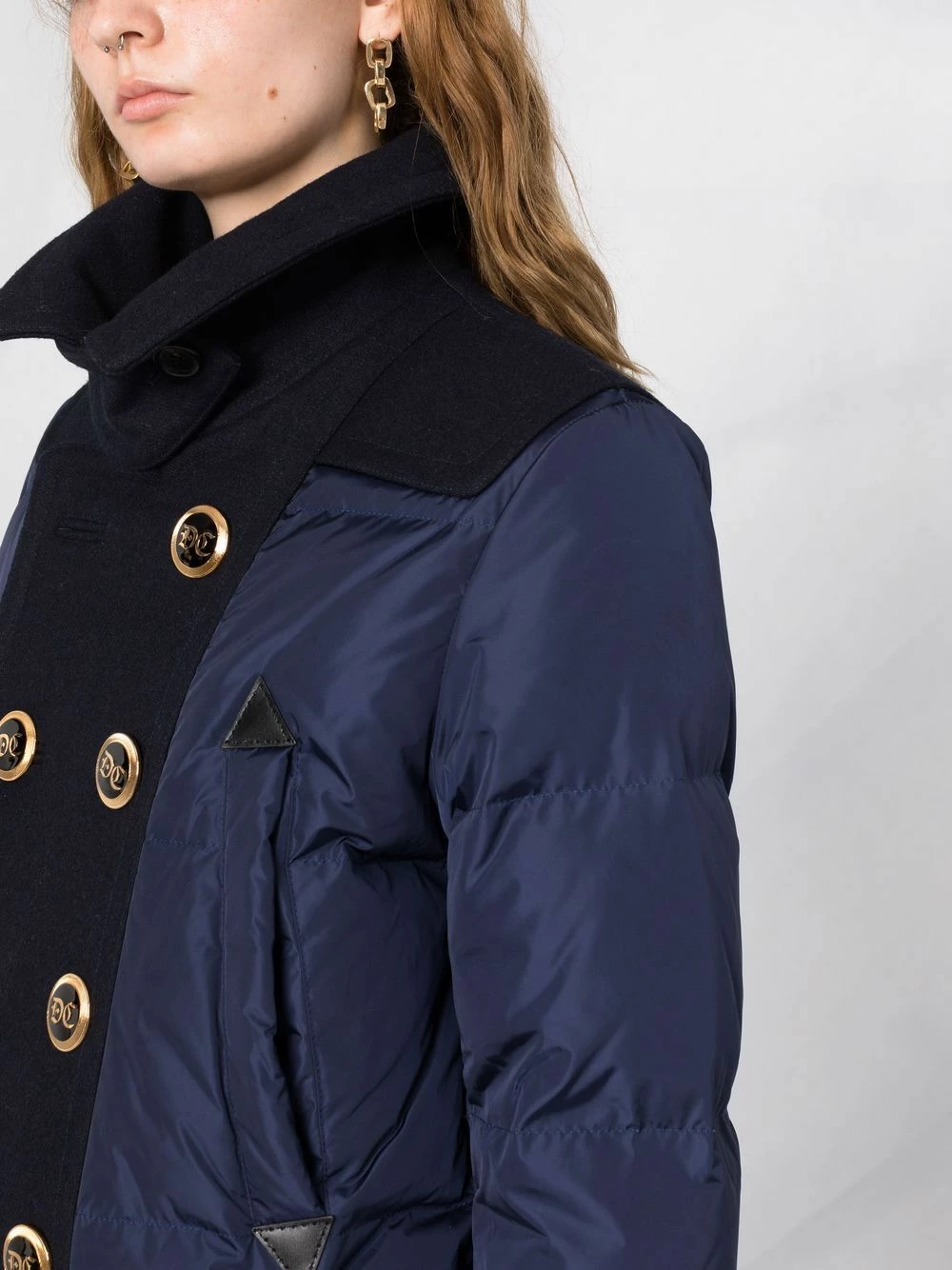 Design à empiècements, design matelassé, design matelassé, boutonnière sur le devant, détail de rayure latérale, boutons dorés à détails embossés, deux poches latérales zippées, ourlet droit. Couleur : bleu. Matière : laine.