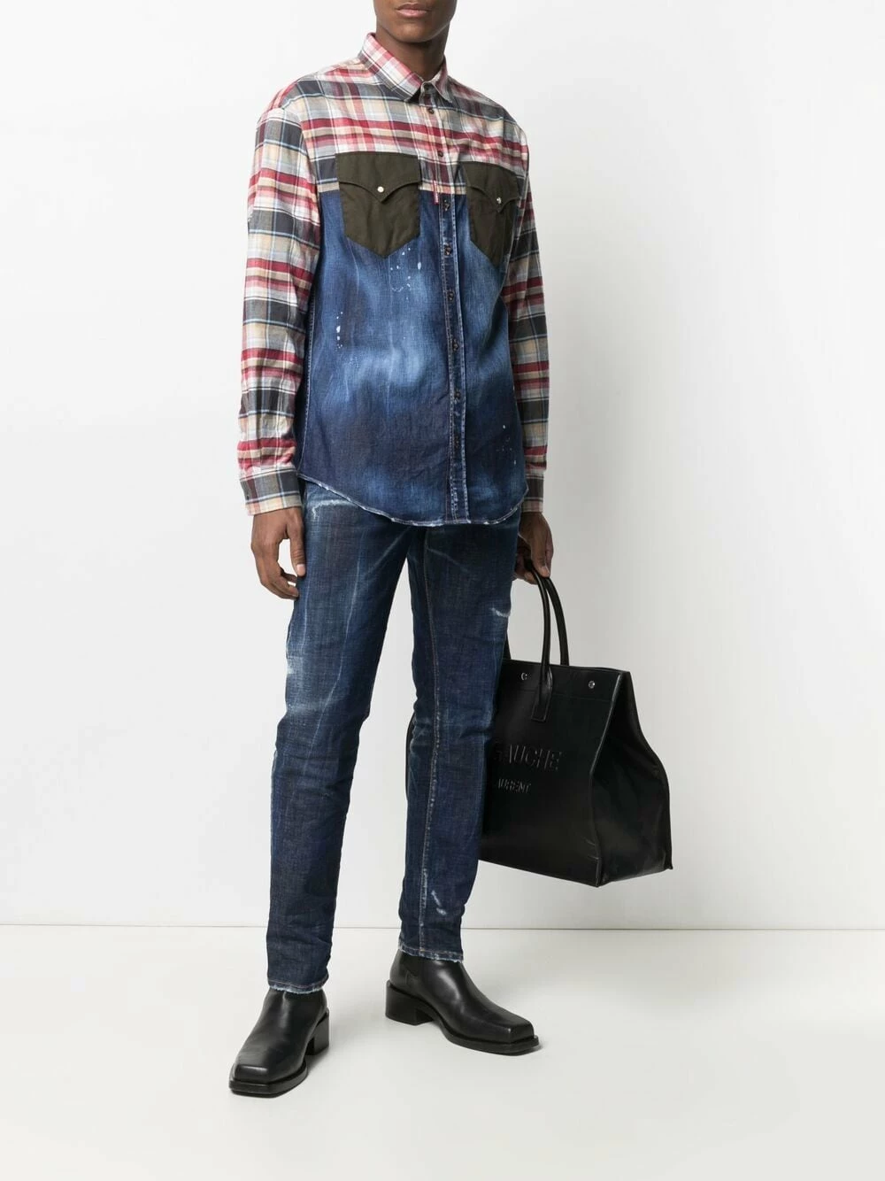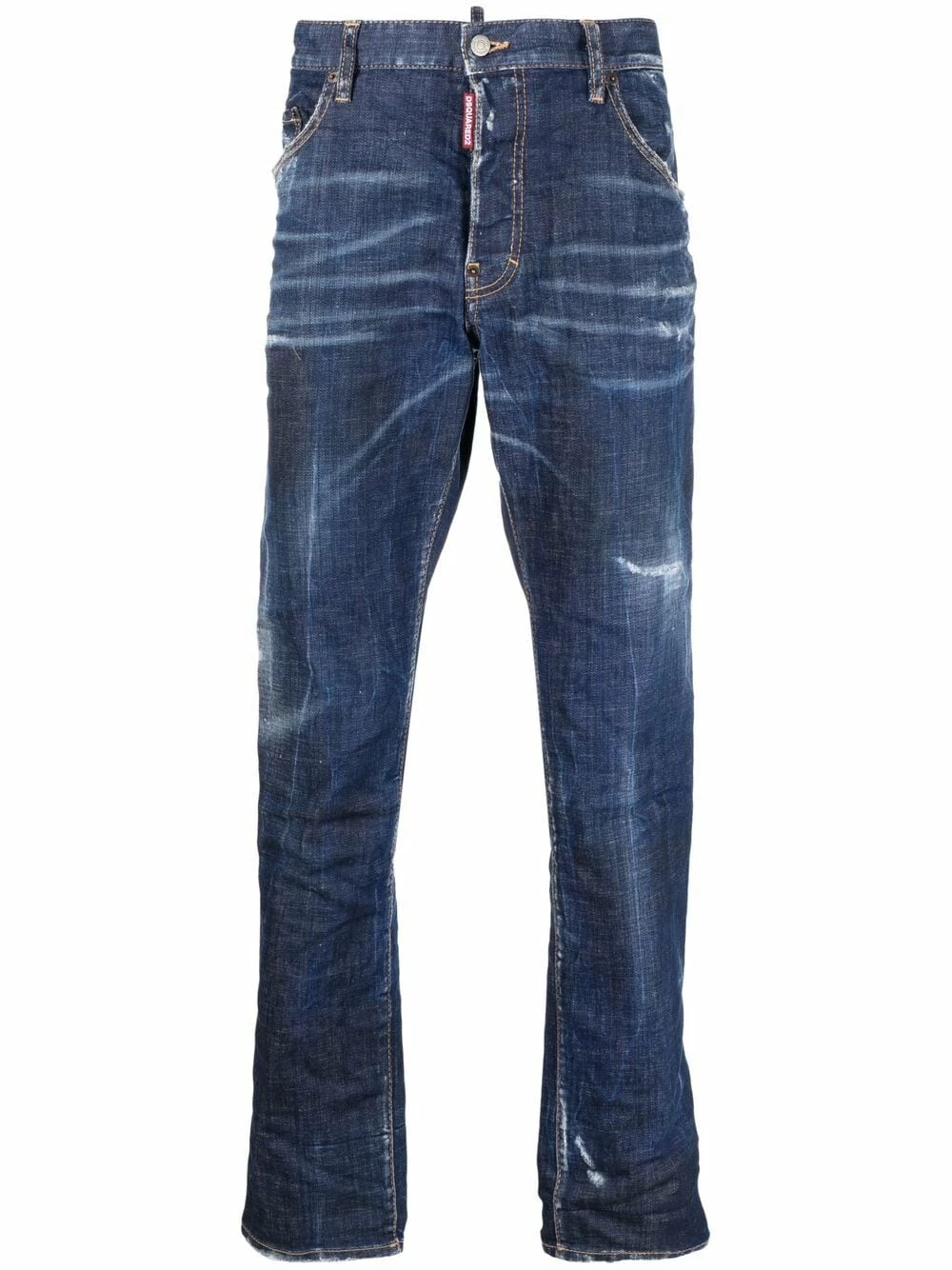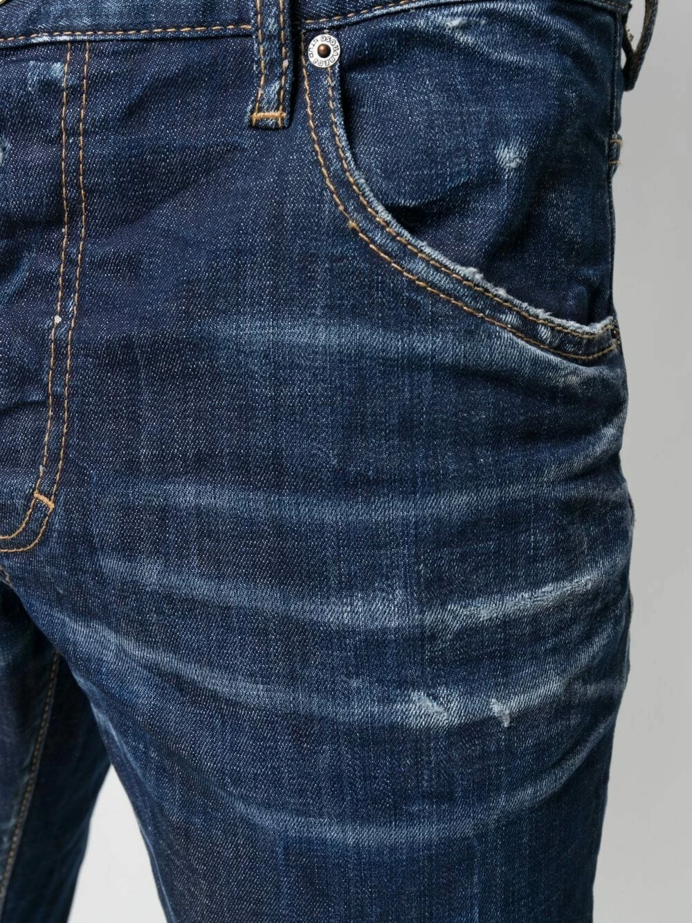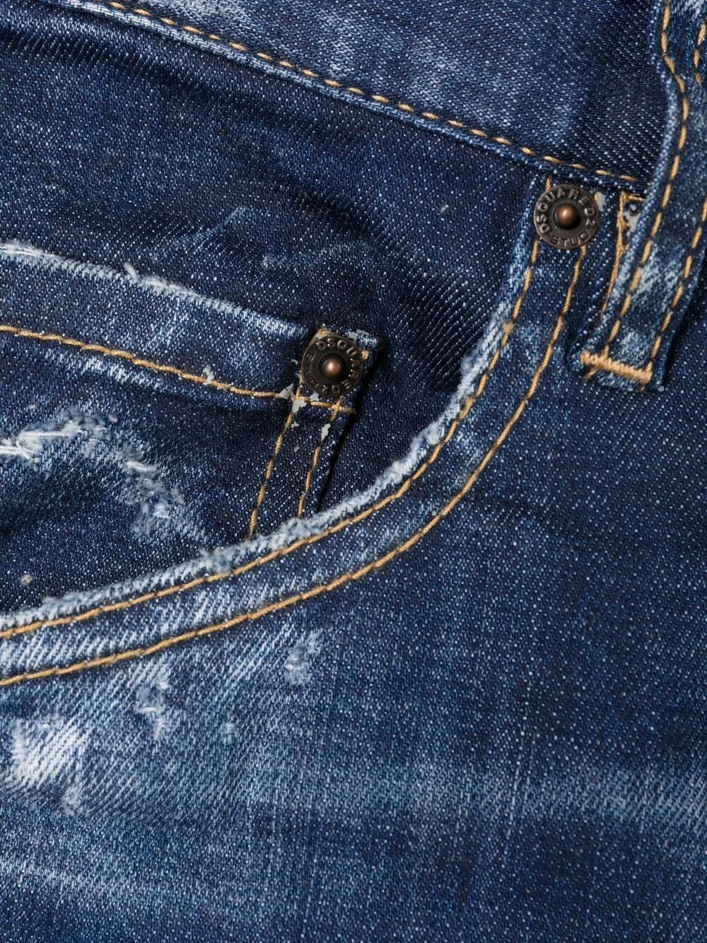 Effet délavé, détails de franges, boutonnière sur le devant, passants de ceinture, 5 poches classiques, coupe skinny. Couleur : bleu.