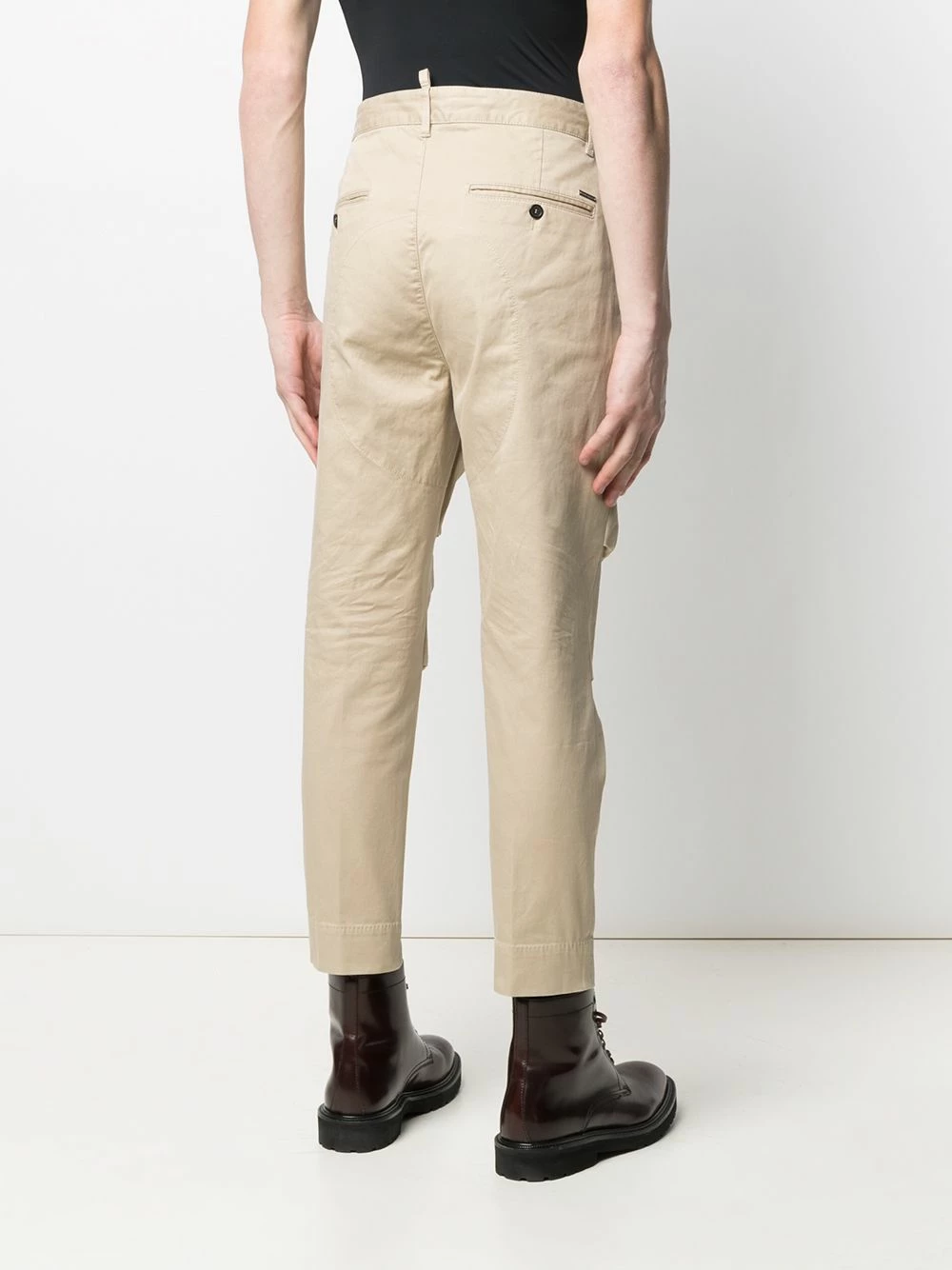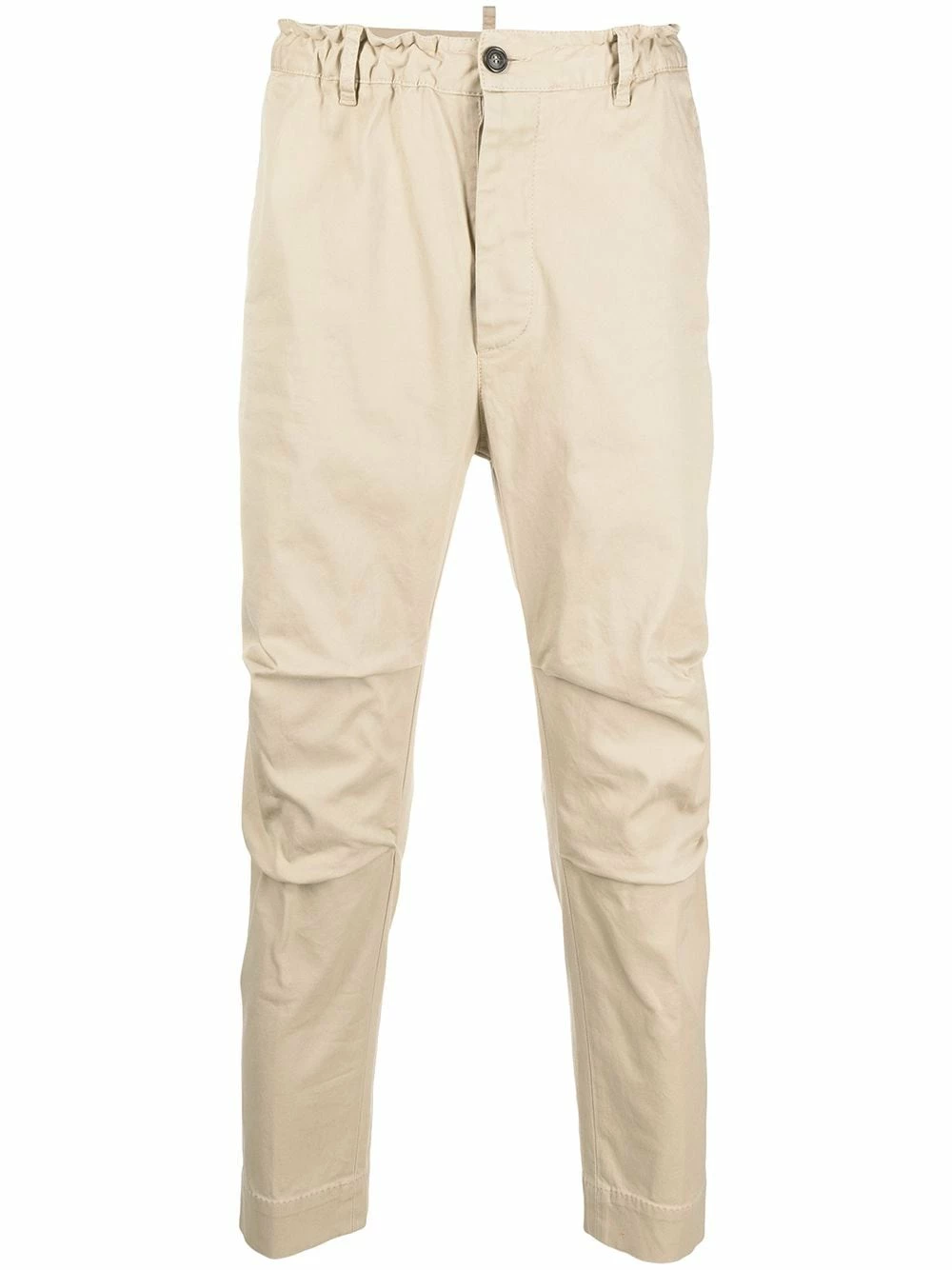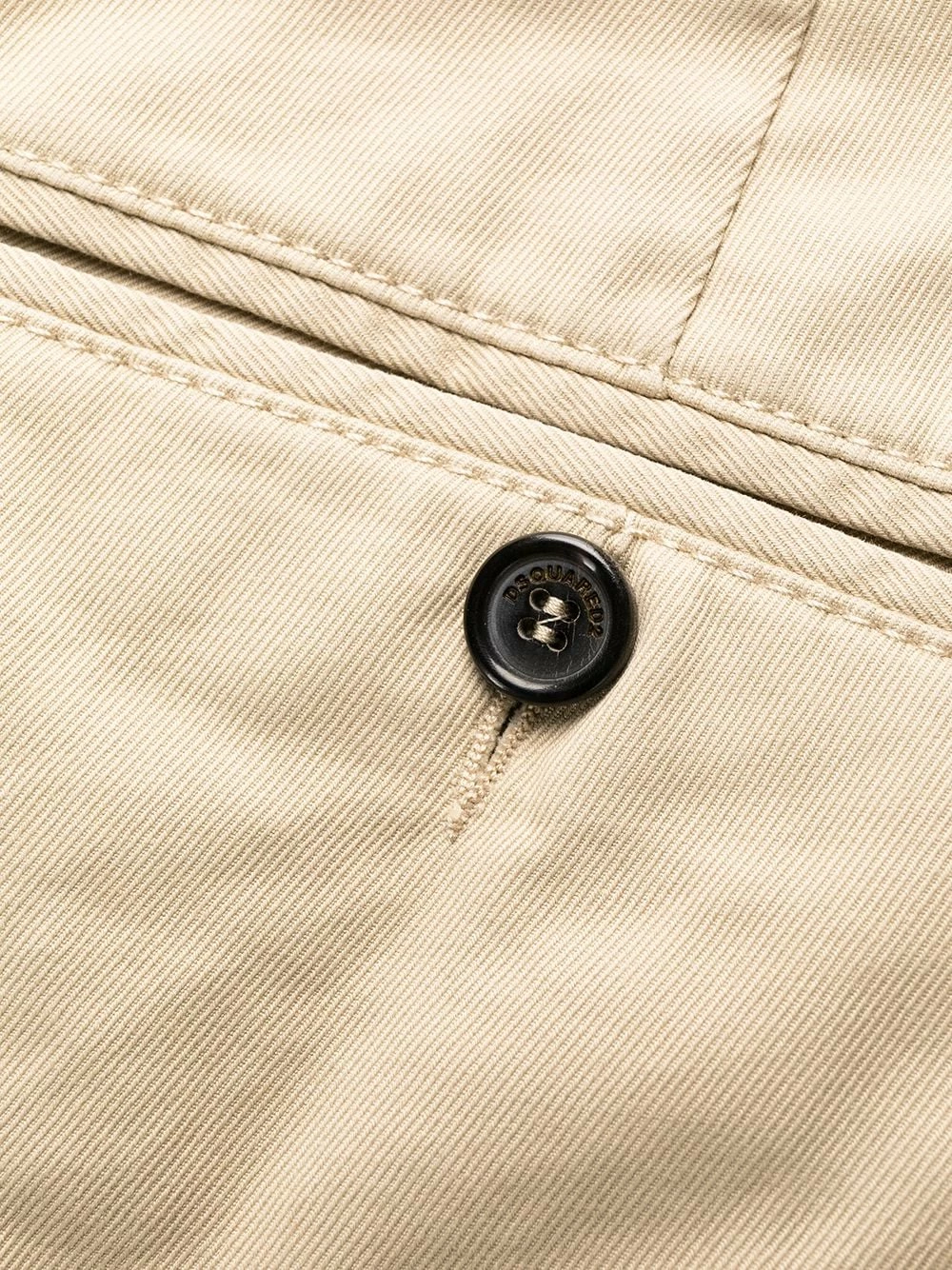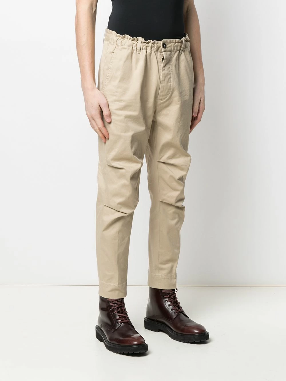 Plis marqués, coutures ton sur ton, taille haute froncée, passants de ceinture, fermeture à zip et boutons sur le devant, poches latérales fendues, poches arrière passepoilées.