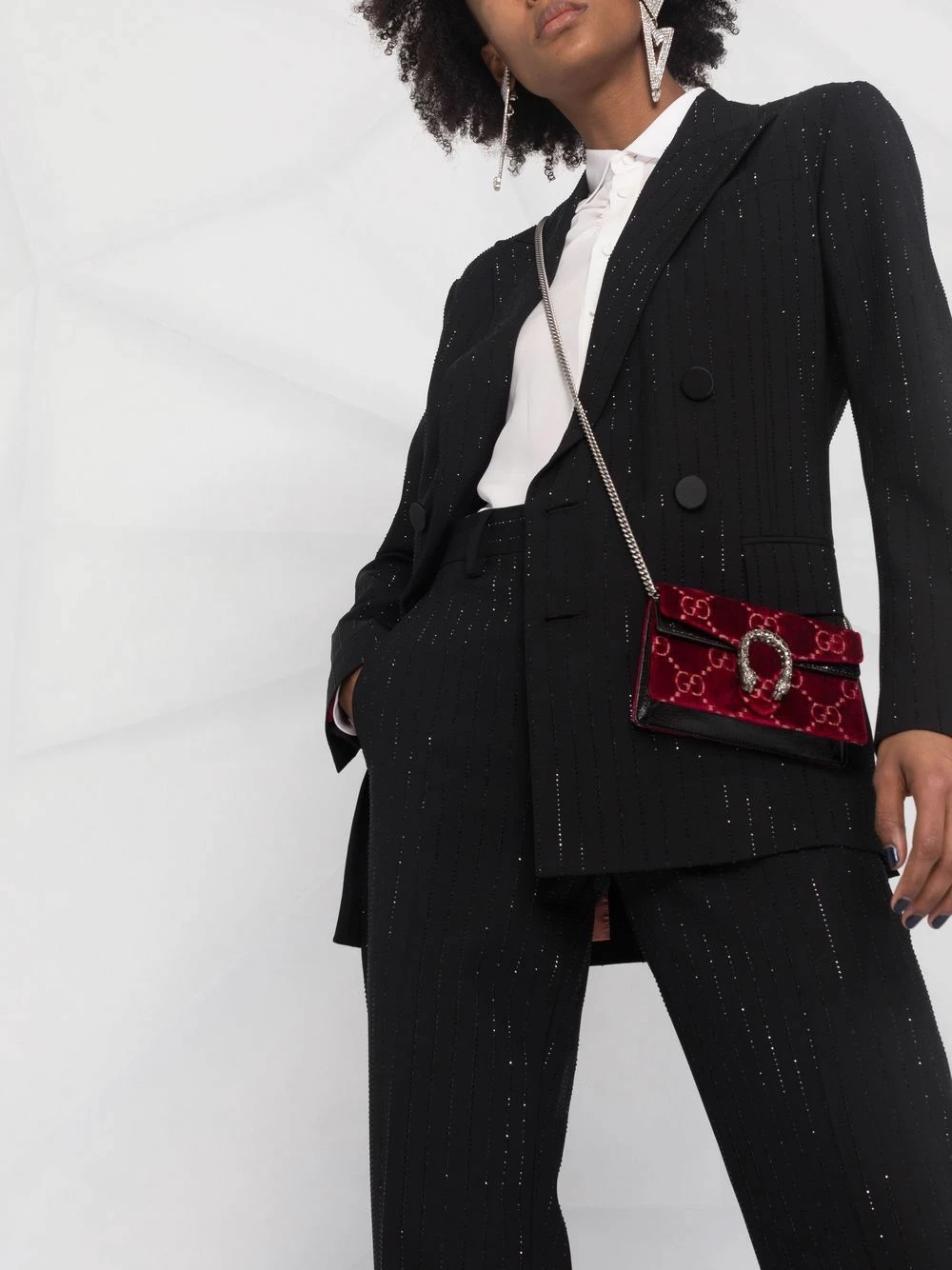 Revers pointus, ornements en sequins, boutonnière croisée, manches longues, deux poches à rabat sur le devant, passants de ceinture, taille haute, coupe droite. Couleur : noir. Matière : laine vierge.