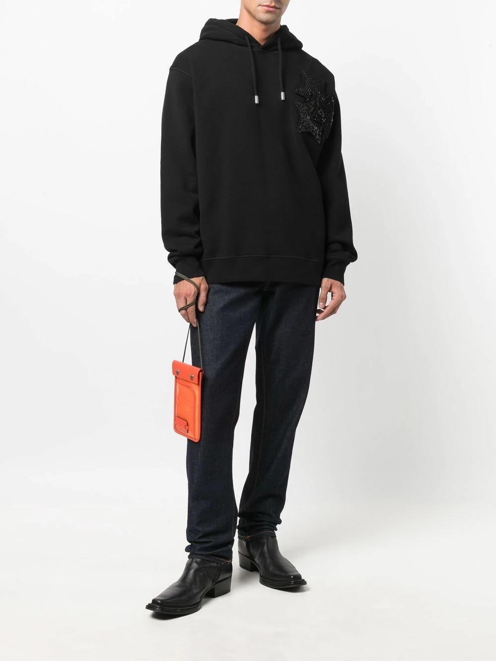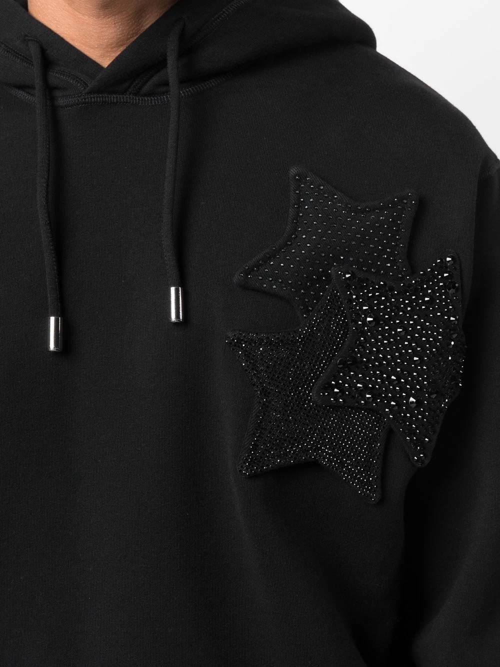 Capuche à lien de resserrage, patch étoile, manches longues, poignets nervurés, ourlet nervuré. Couleur : noir. Matière : coton.