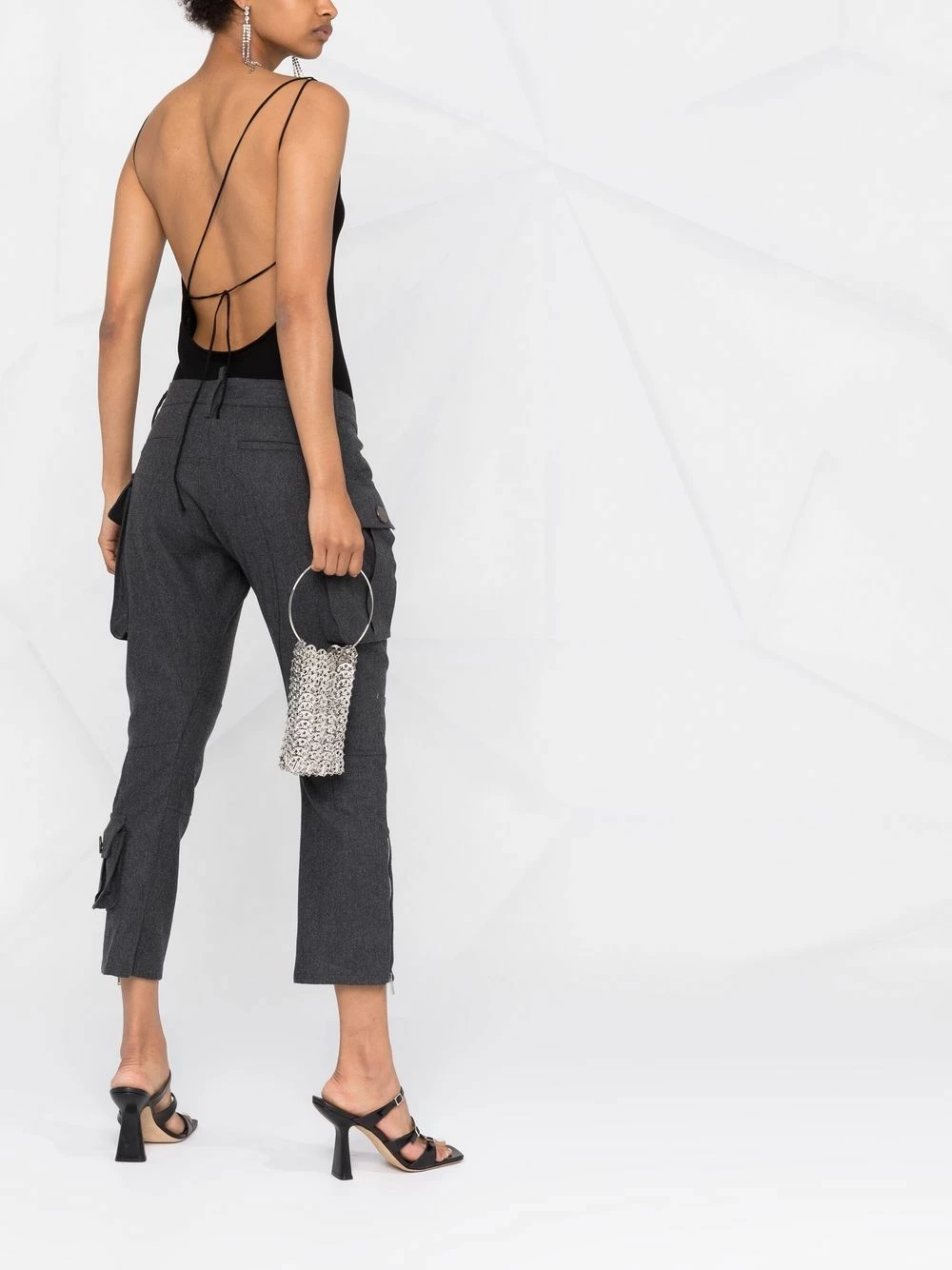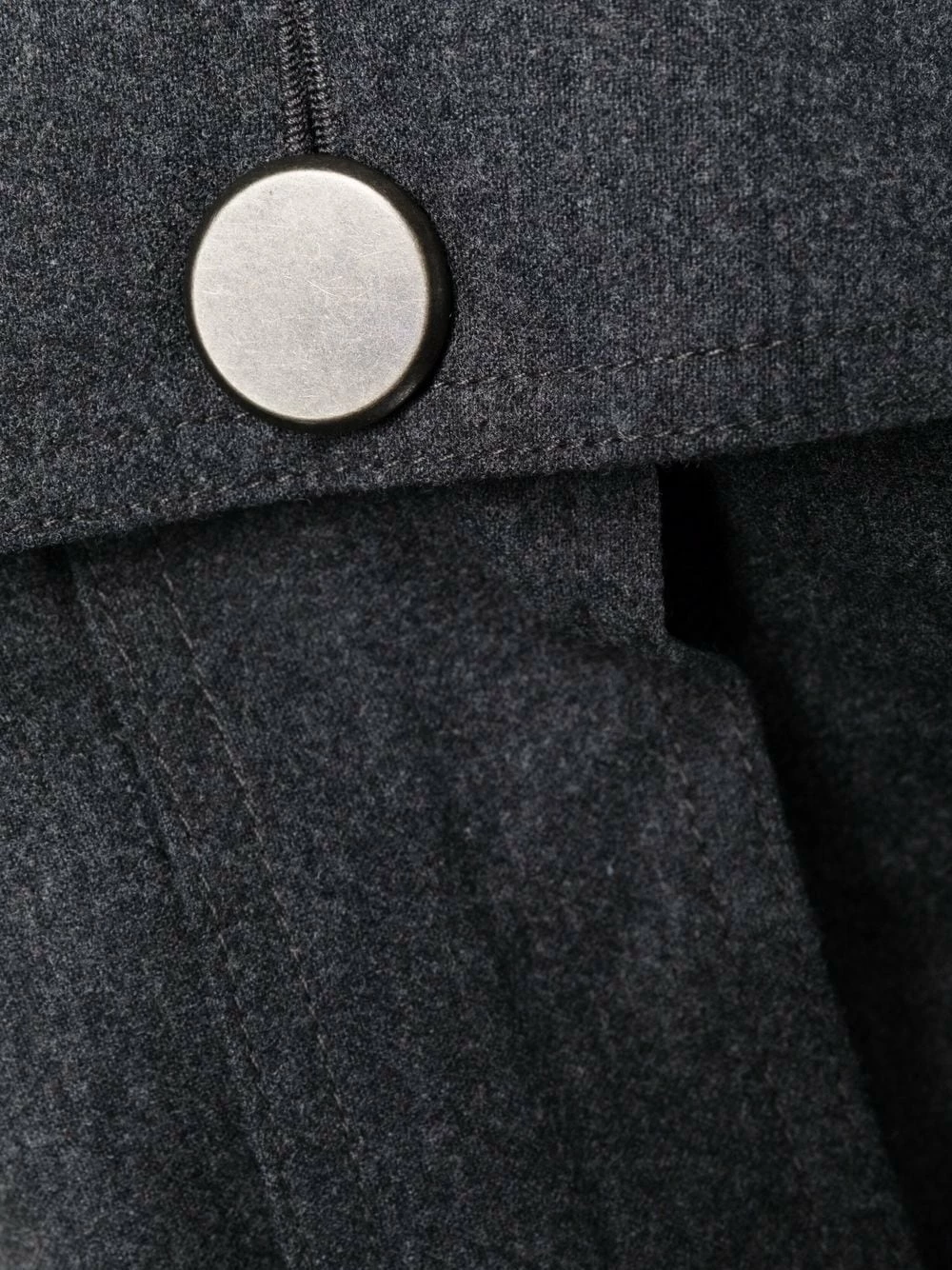 Poches cargo multiples, fermeture dissimulée sur le devant, passants de ceinture, deux poches latérales fendues, poche arrière passepoilée, longueur crop. Couleur : gris. Matière : laine vierge.