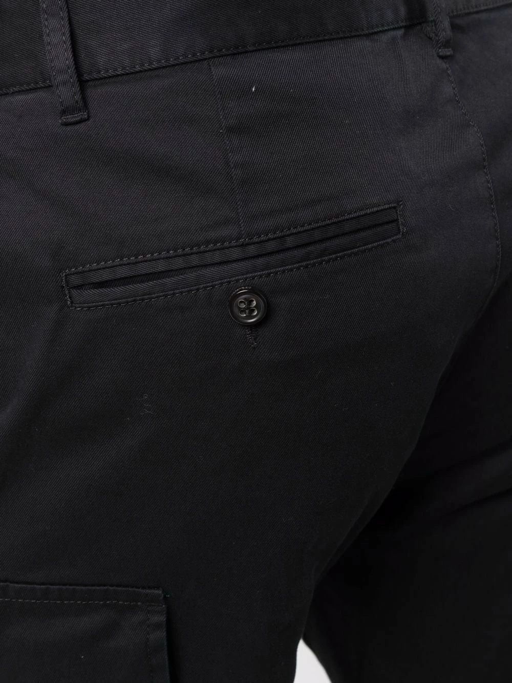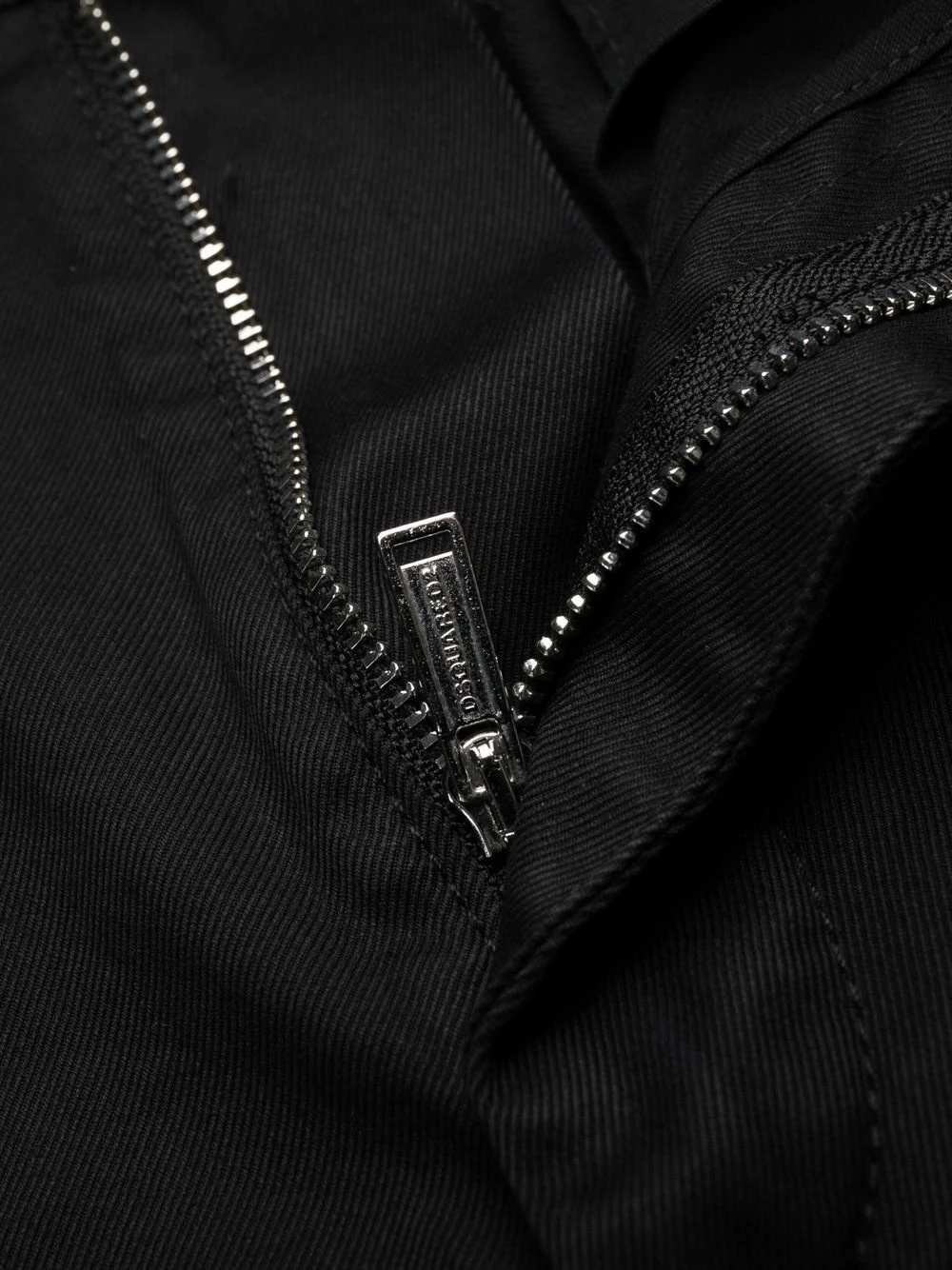 Coupe droite, fermeture à zip et boutons sur le devant, poches latérales fendues, deux poches latérales à rabat.