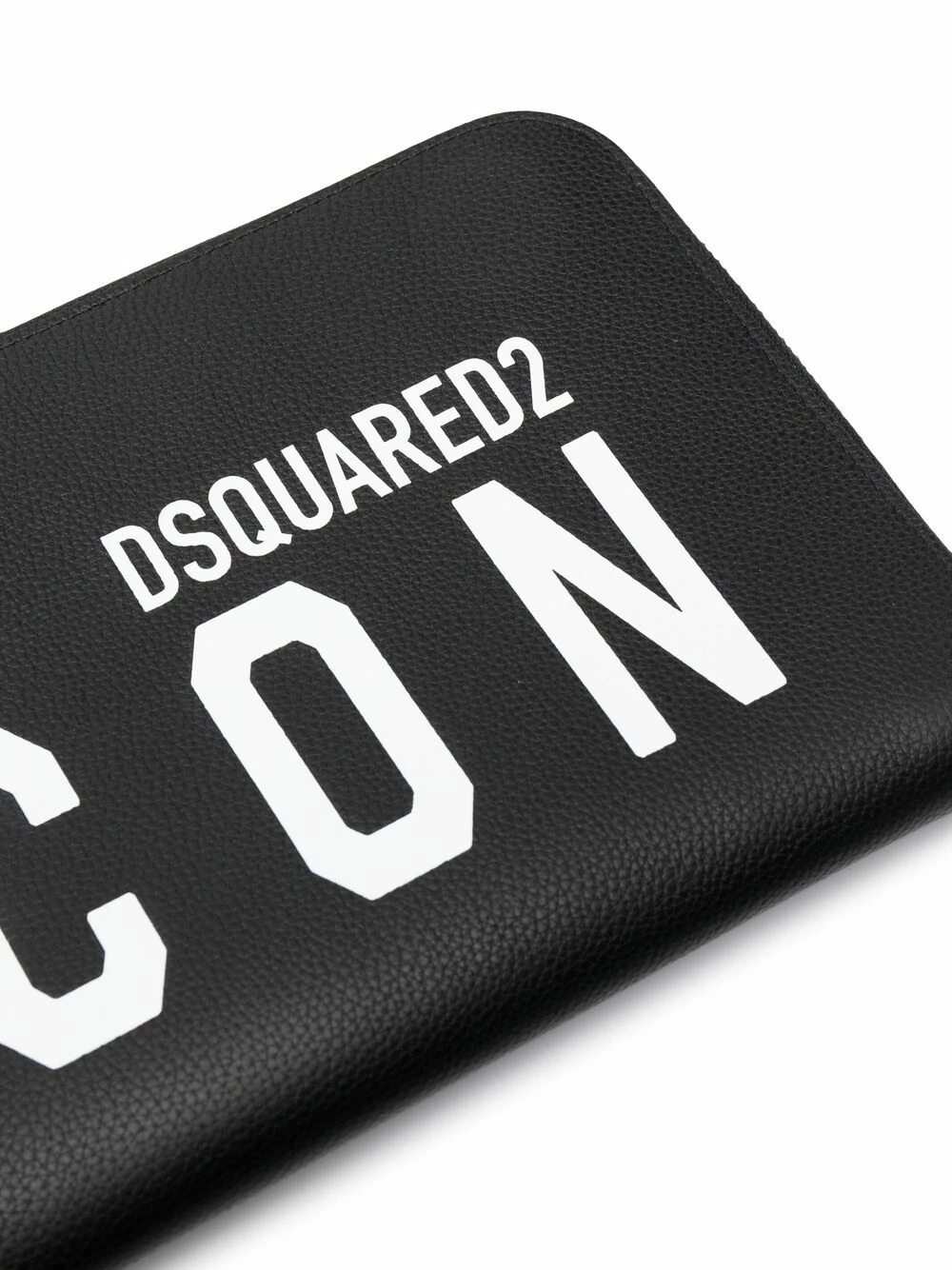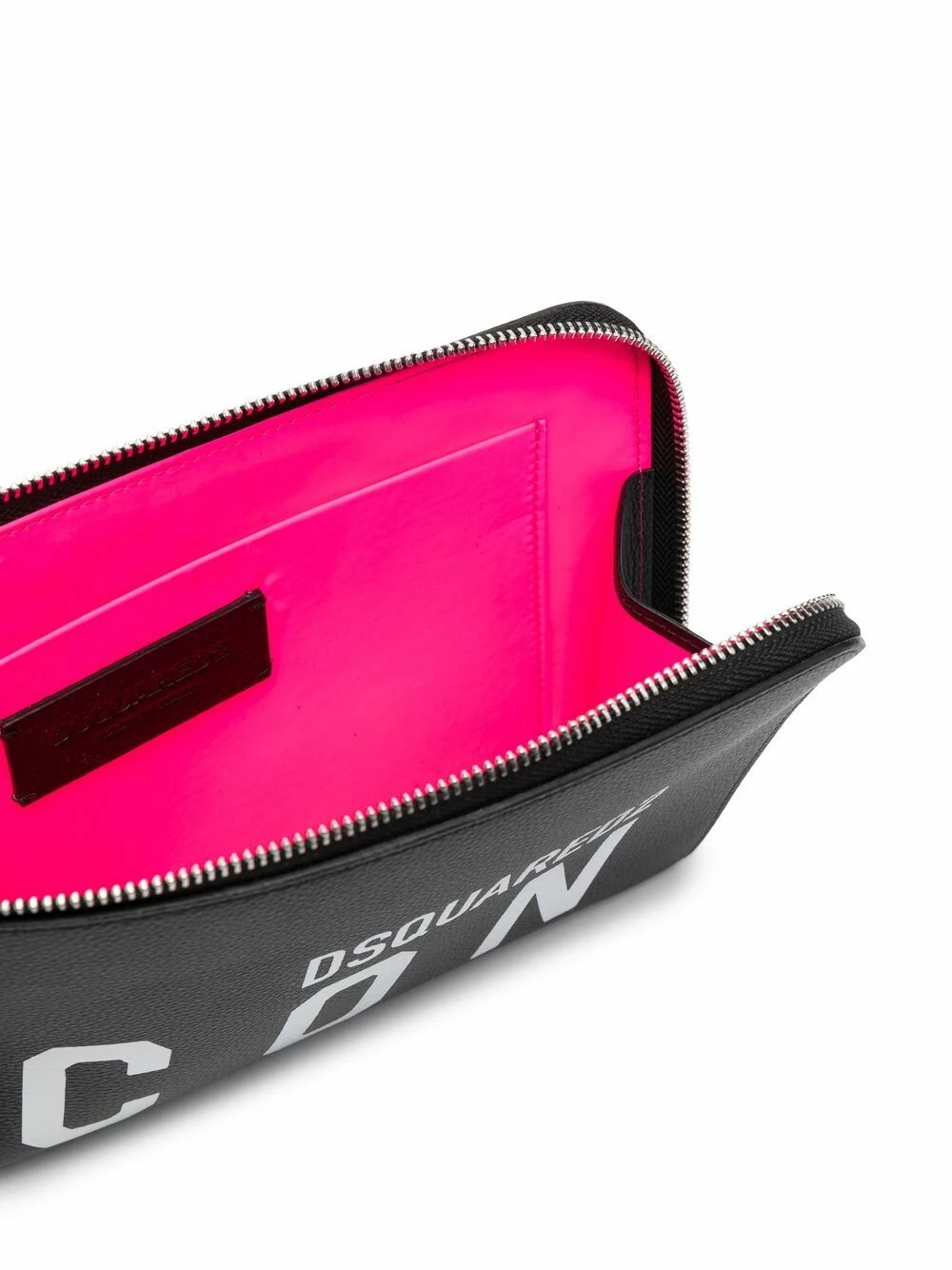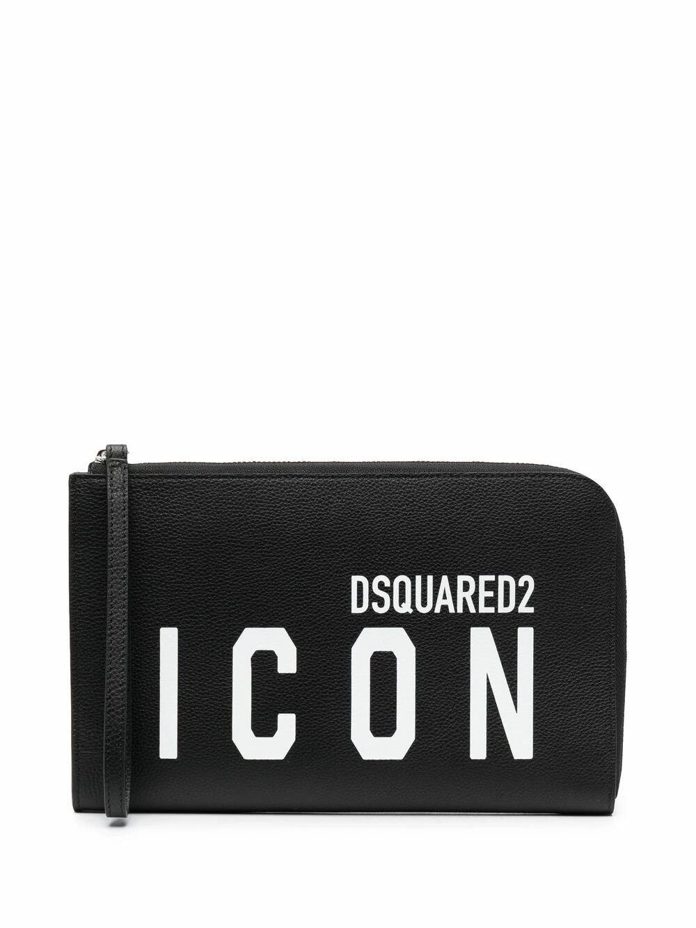 Modèle bicolore, logo imprimé sur le devant, texture grainée, fermeture zippée sur le dessus, compartiment principal, bride porté poignet. Matière : cuir.