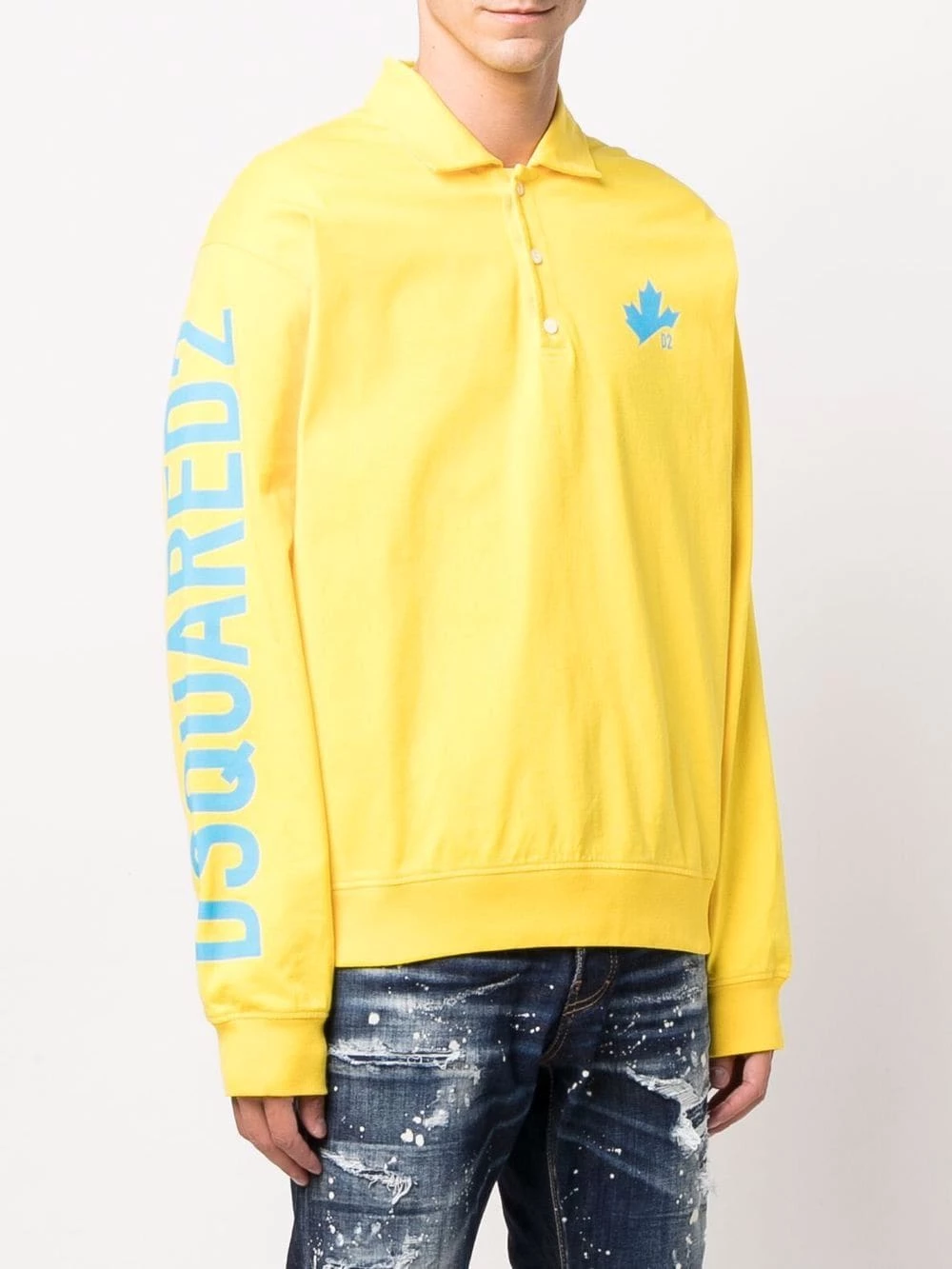 Col polo, boutonnière sur le devant, manches longues, logo imprimé sur la manche, détail nervuré. Couleur : jaune. Matière : coton.