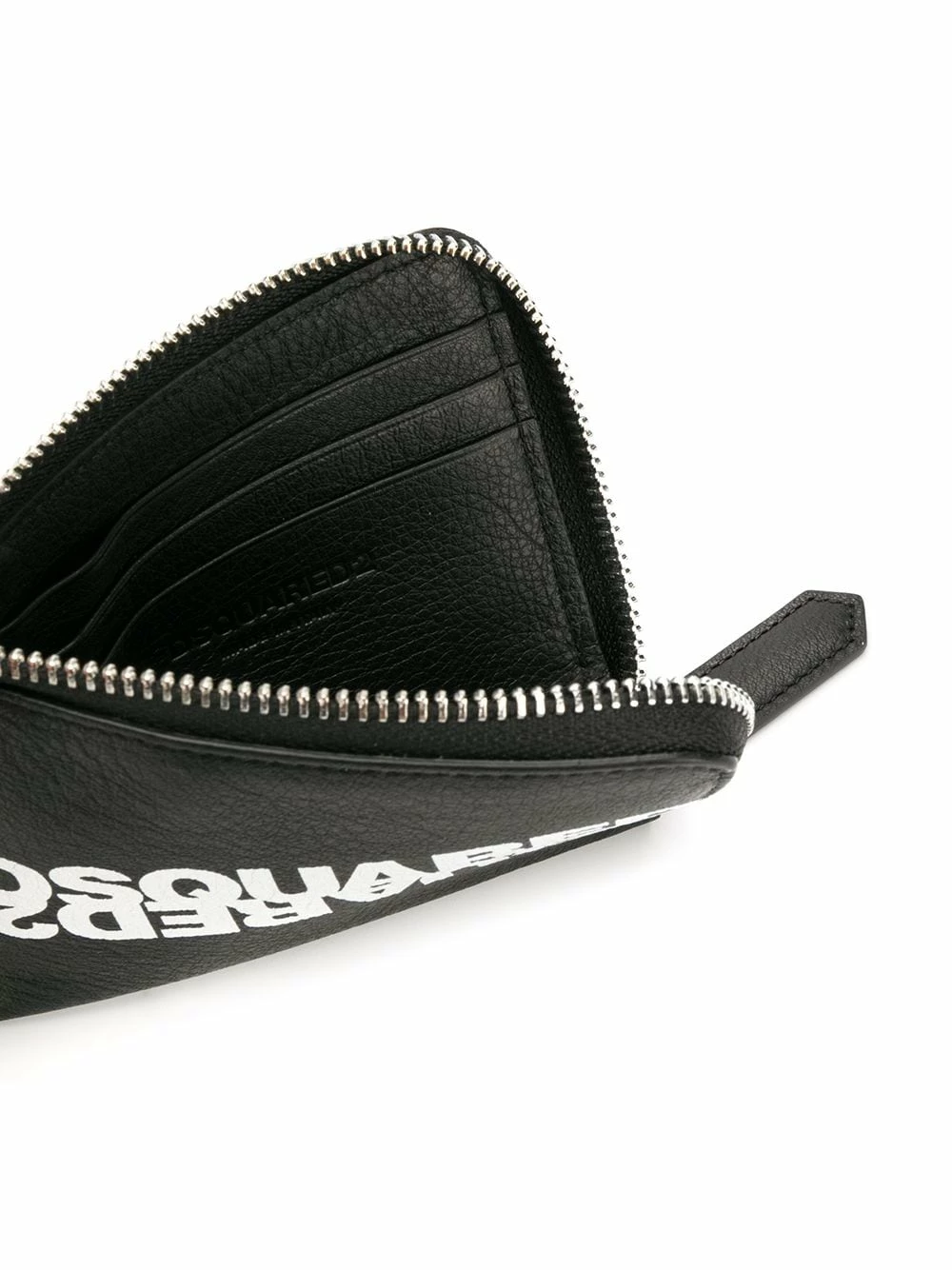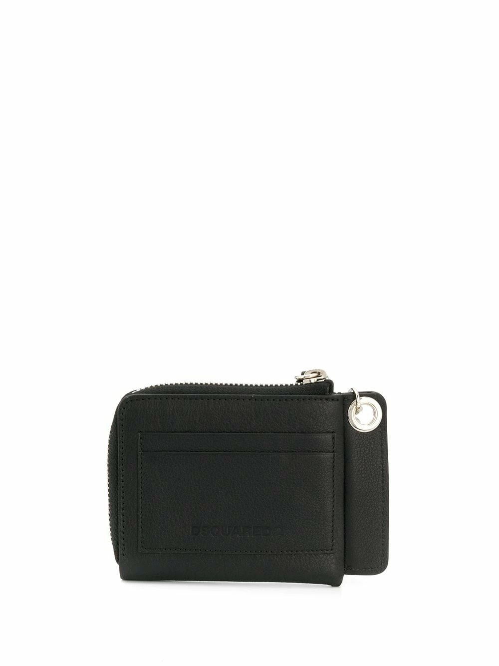 Portefeuille à détail de chaînette en cuir de veau Dsquared2 avec fermeture zippée tout autour, logo imprimé sur le devant, bordure à chaîne argentée, porte-clés attaché, multiple interior card slots et logo embossé à l’arrière. Couleur : noir.