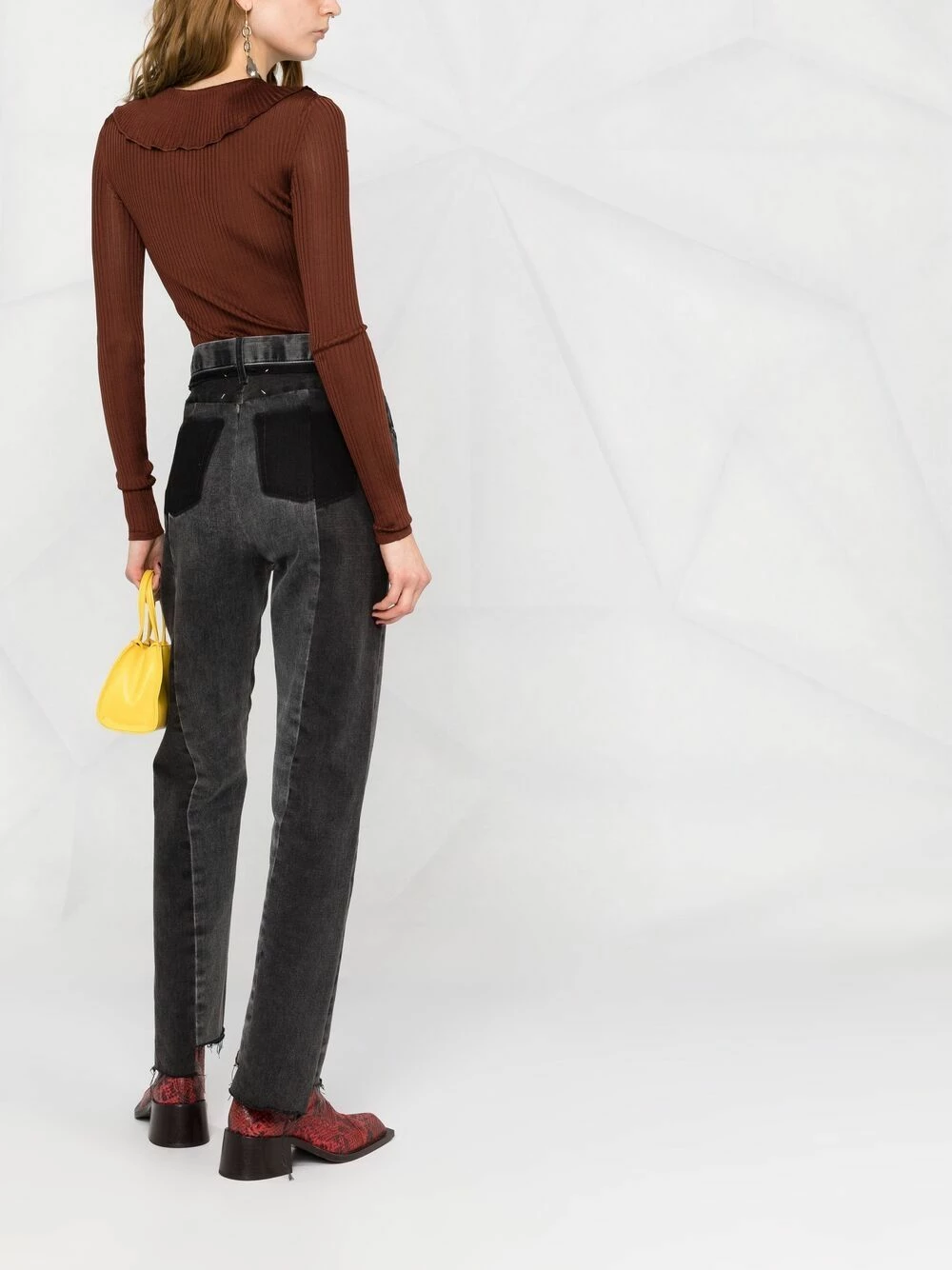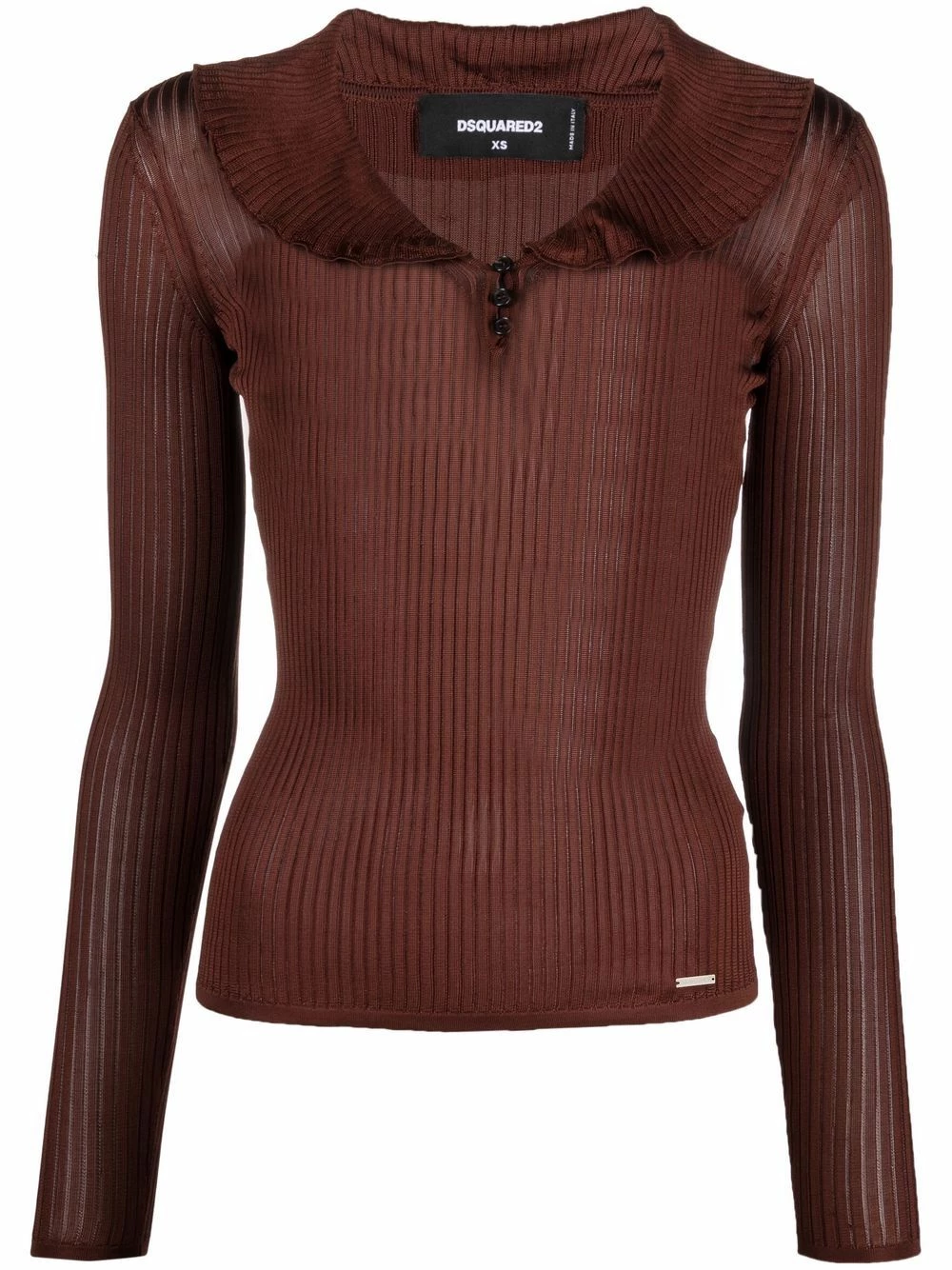 Patch logo sur le devant, maille nervurée, col marin, col v, boutonnière sur le devant, manches longues, ourlet droit. Couleur : marron. Matière : soie.