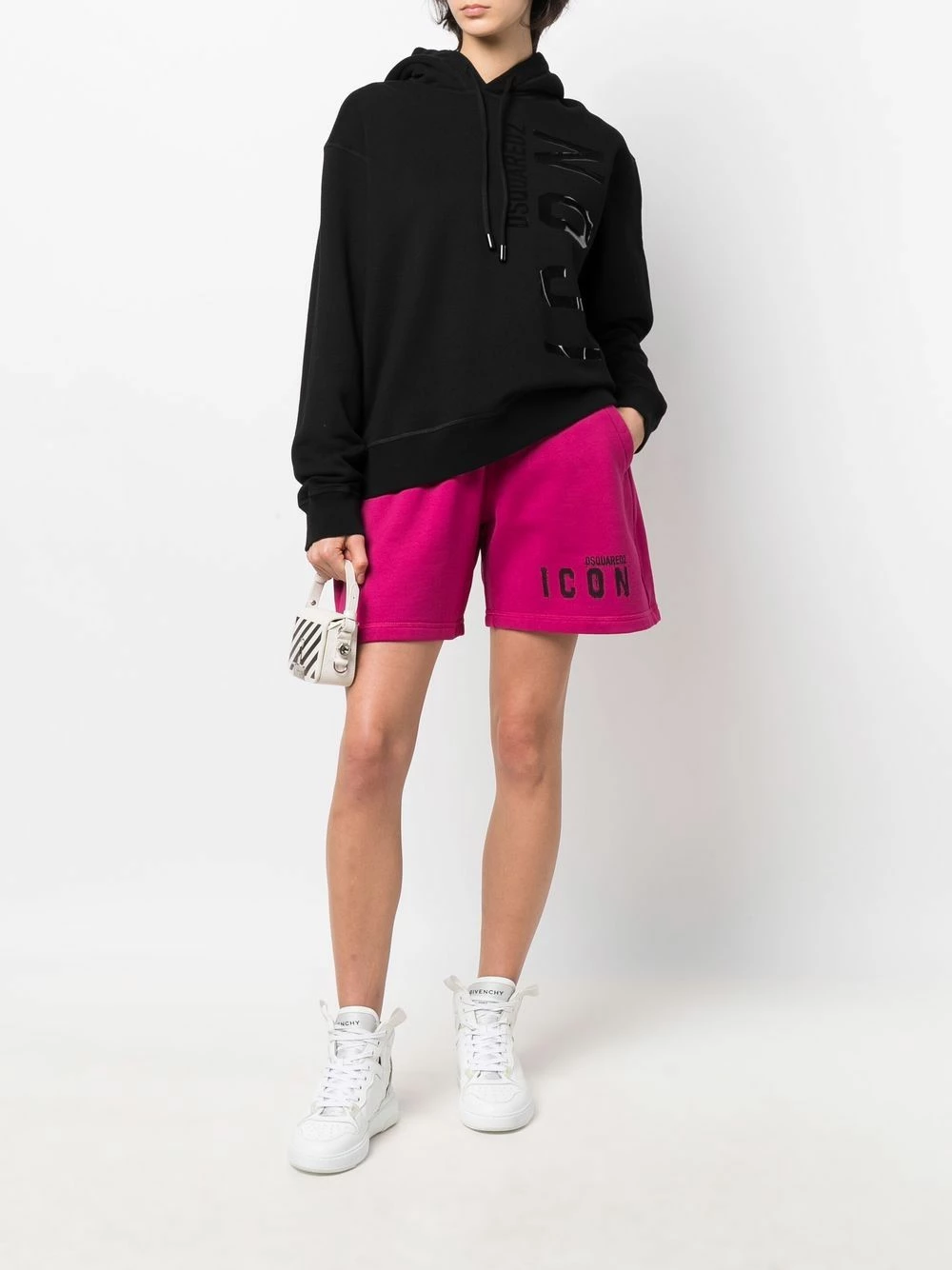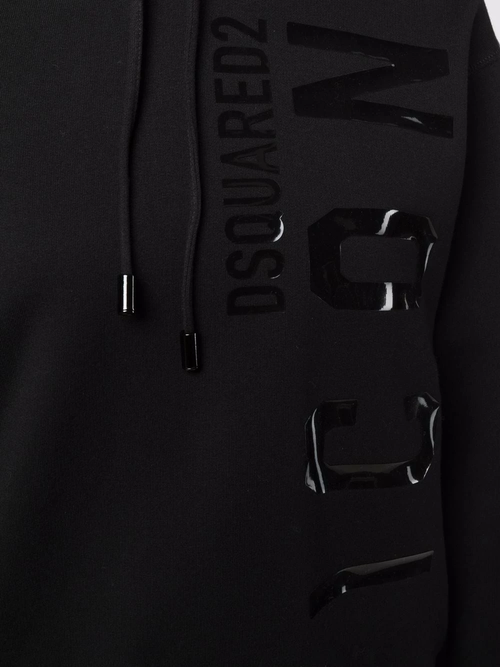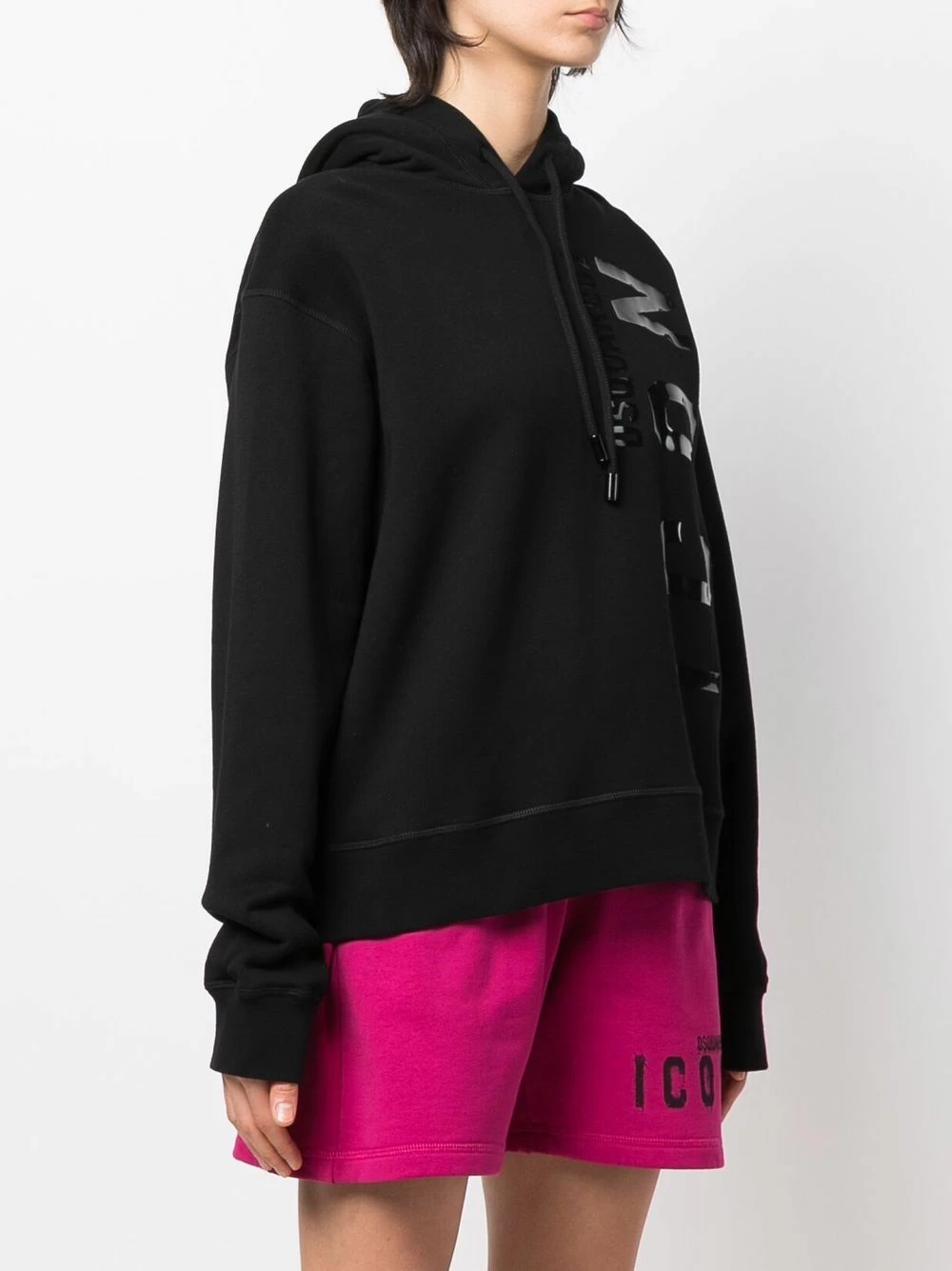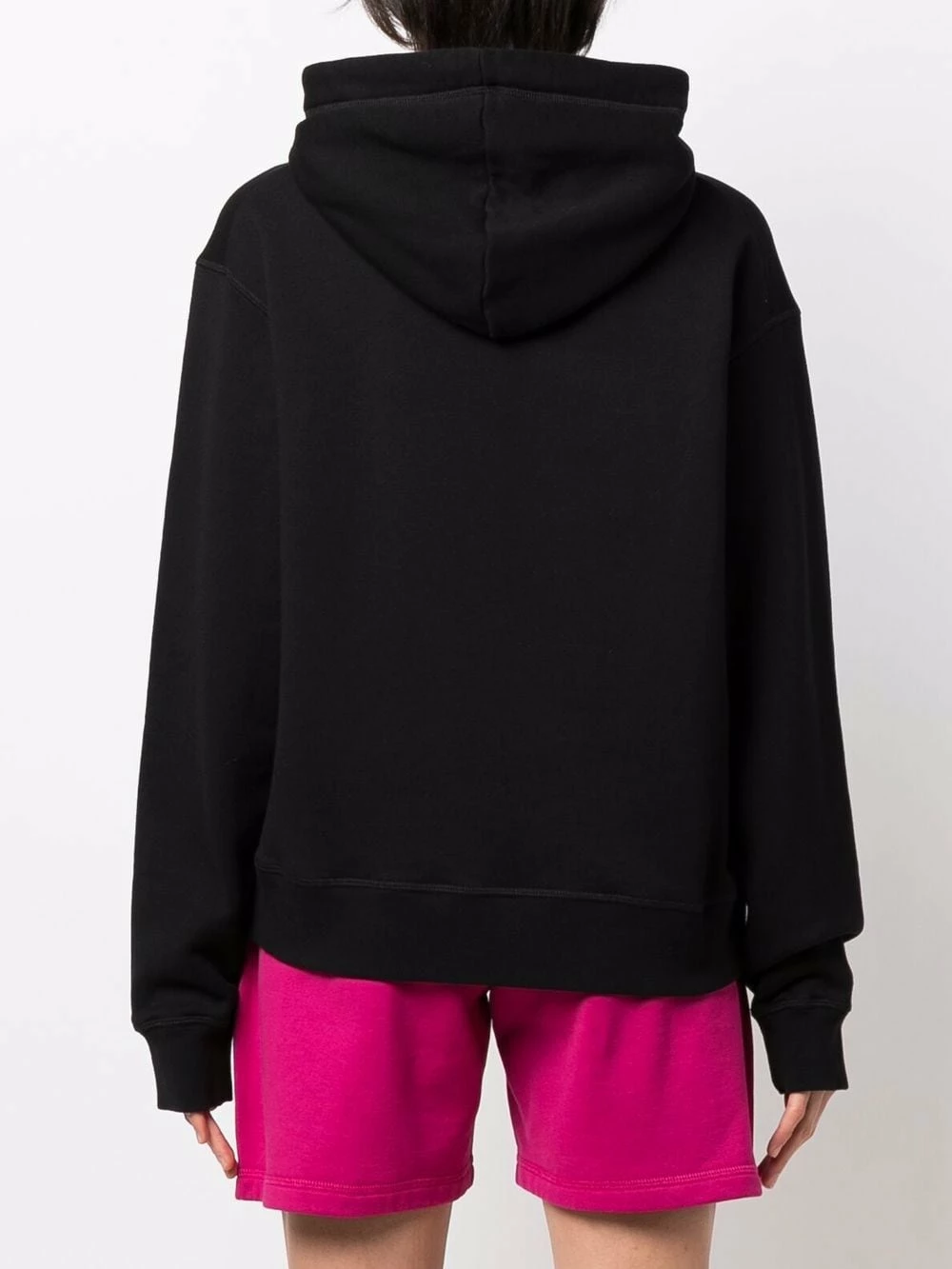 Logo imprimé sur le devant, design ton sur ton, capuche à lien de resserrage, manches longues, ourlet droit. Couleur : noir. Matière : coton.