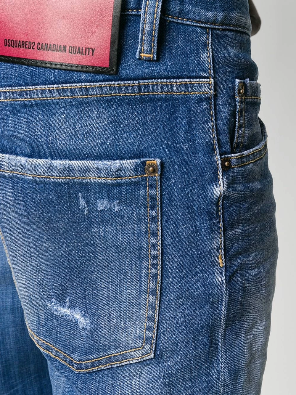 Jean slim à effet usé Dsquared2 avec passants de ceinture, fermeture devant dissimulée, coupe classique cinq poches et effet délavé usé. Couleur : bleu.