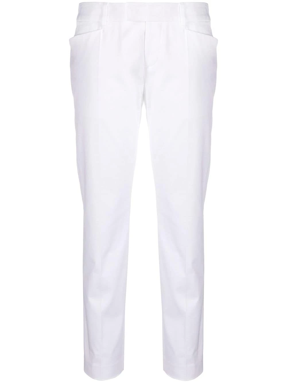 Coupe ajustée, coupe fuselée, taille basse, passants de ceinture, fermeture dissimulée sur le devant, deux poches passepoilées avant, poches arrière passepoilées. Couleur : blanc.