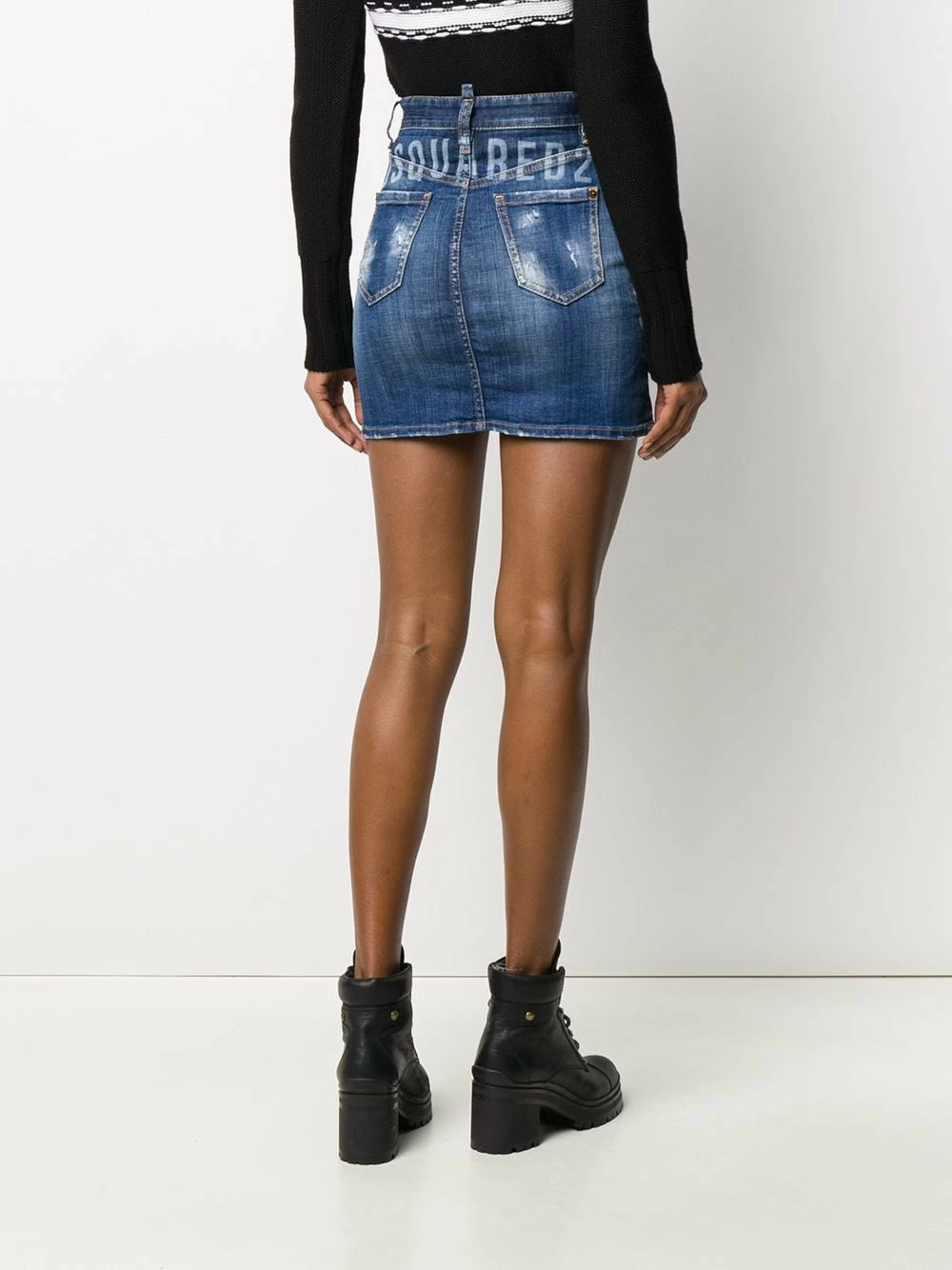Jupe ajustée en jean à logo imprimé Dsquared2 avec effet délavé, taille haute, passants de ceinture à la taille, bouton et zip, étiquette logo, coupe classique cinq poches, effet usé, logo imprimé à l’arrière et coupe courte. Couleur : bleu.