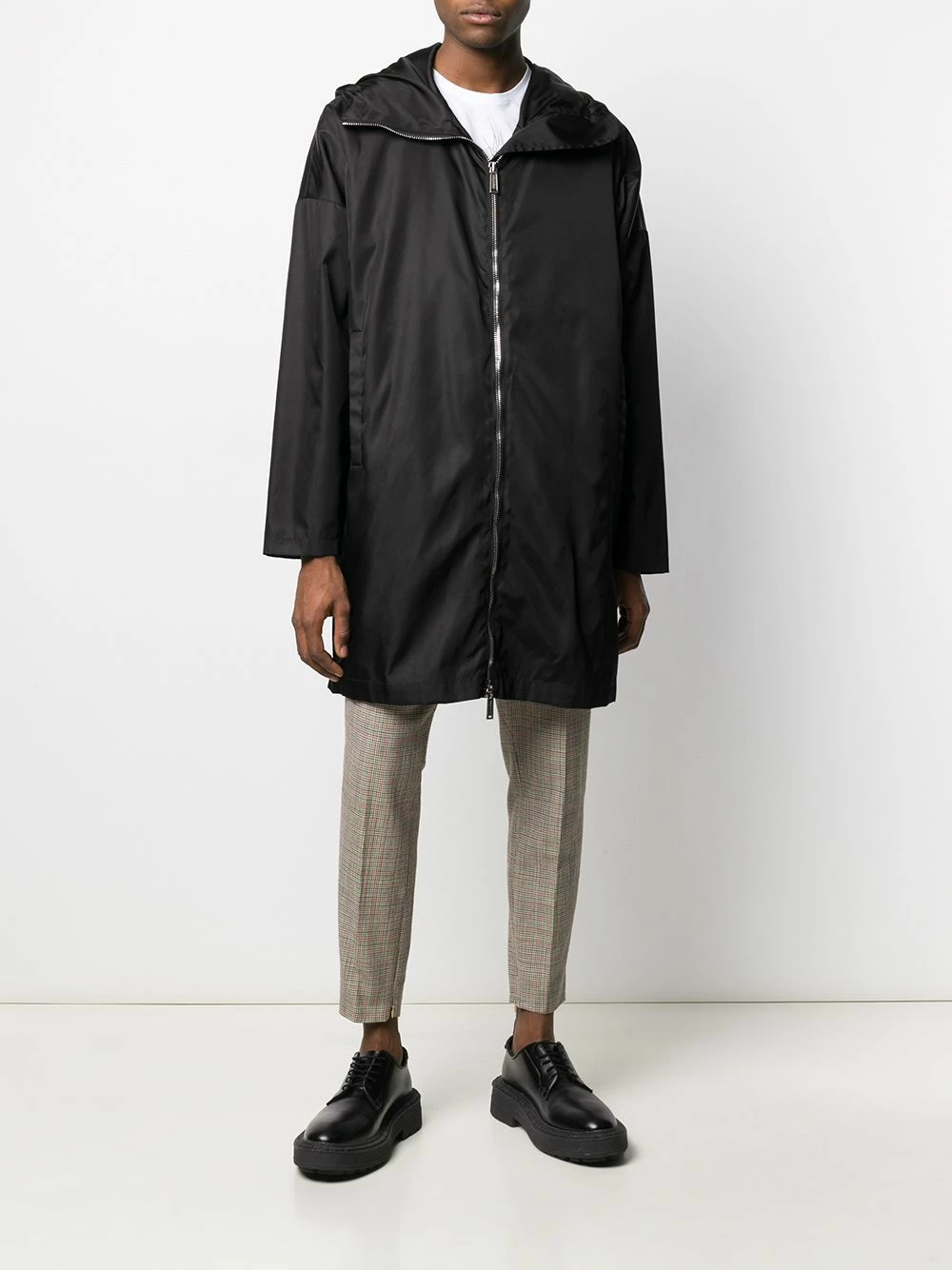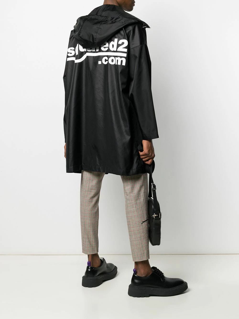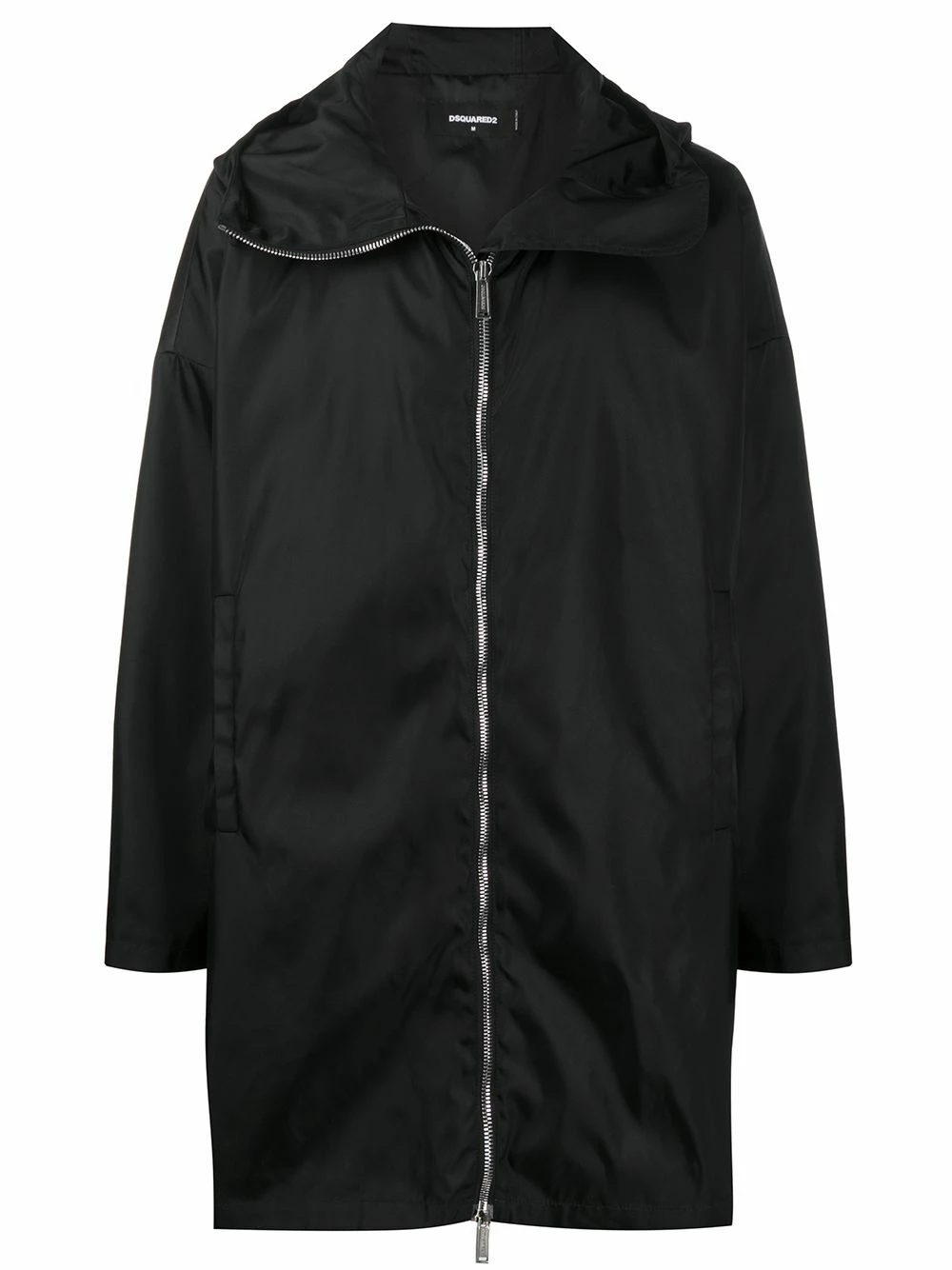 Manteau zippé à capuche Dsquared2 avec logo au dos, capuche, fermeture zippée devant, manches longues et longueur medium. Couleur : noir.