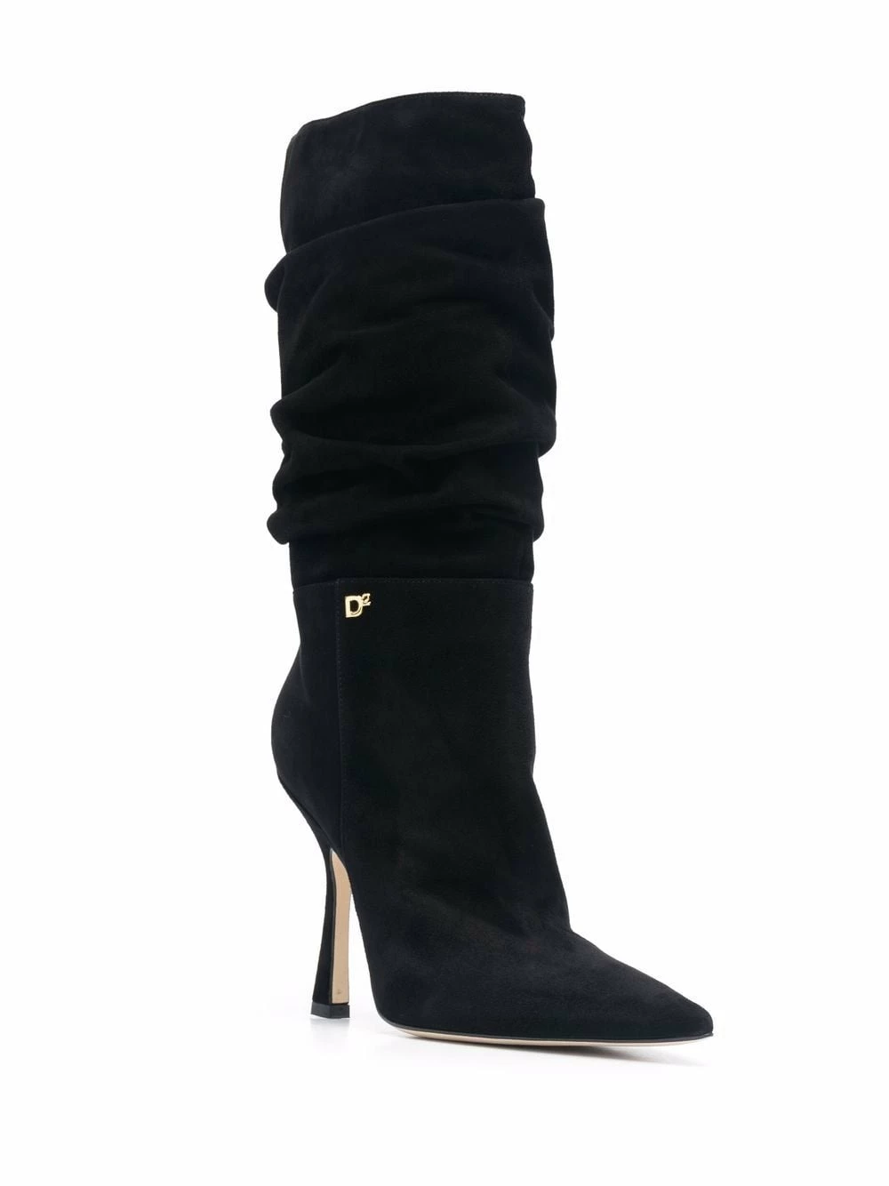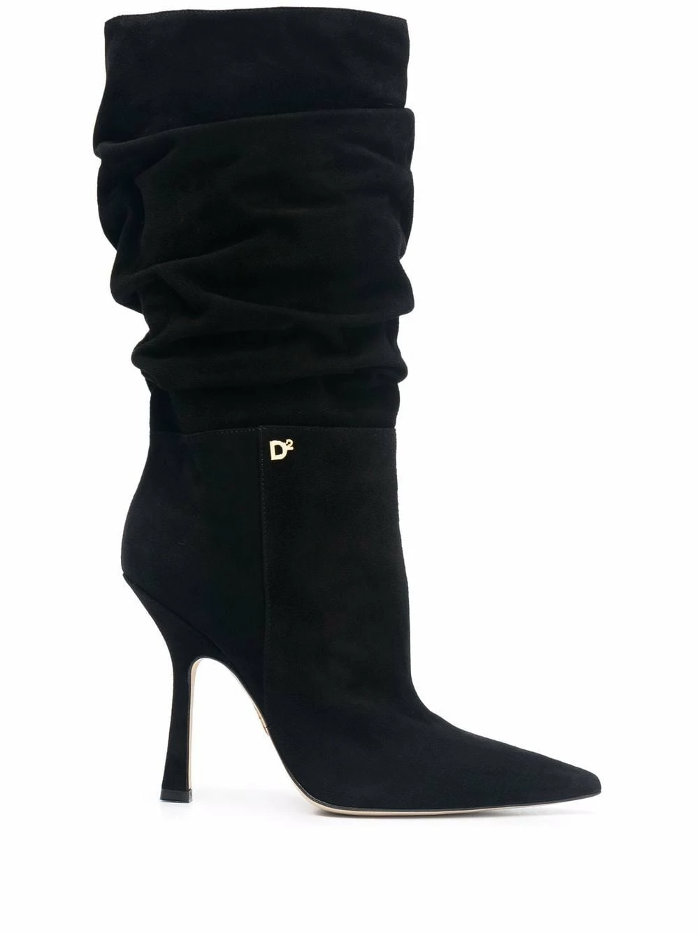 Bout pointu, plaque logo dorée, longueur au dessous du genou, talon haut, détails de fronces. Couleur : noir. Matière : cuir.