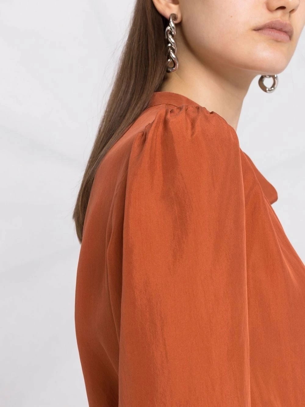 Détails de fronces, fermeture à nouer sur le devant, manches bouffantes longues, ourlet droit.
