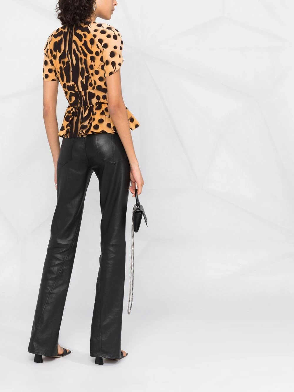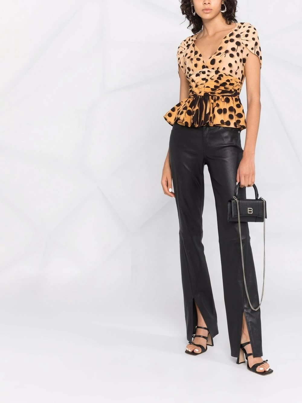 Imprimé à pois, imprimé graffiti, détails de plis, col v, manches courtes, ourlet péplum.