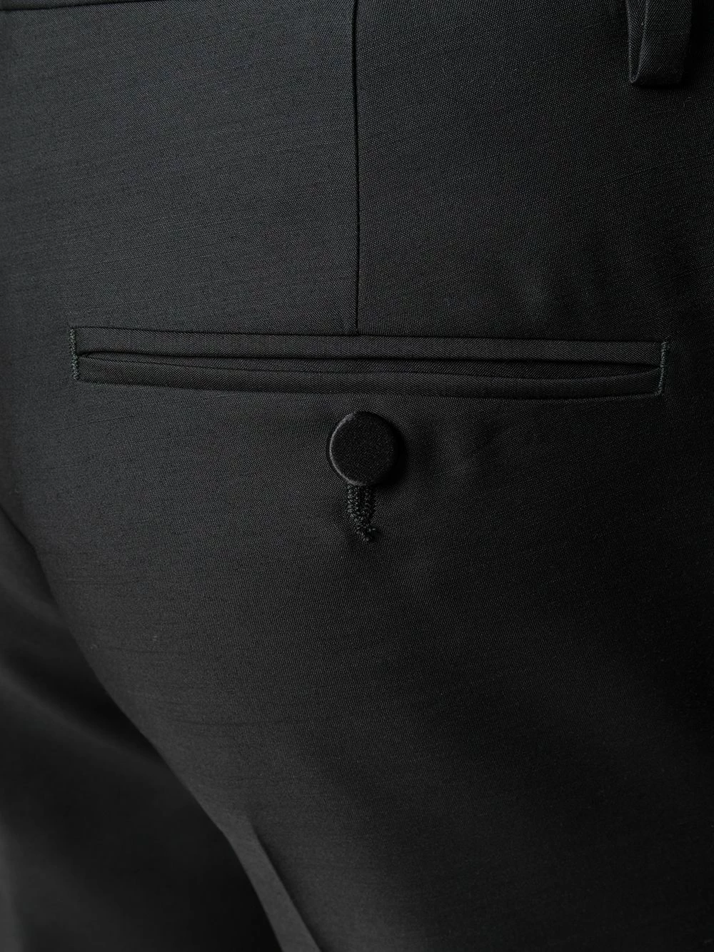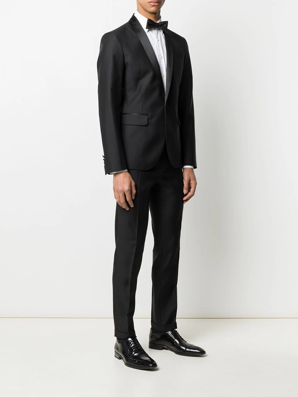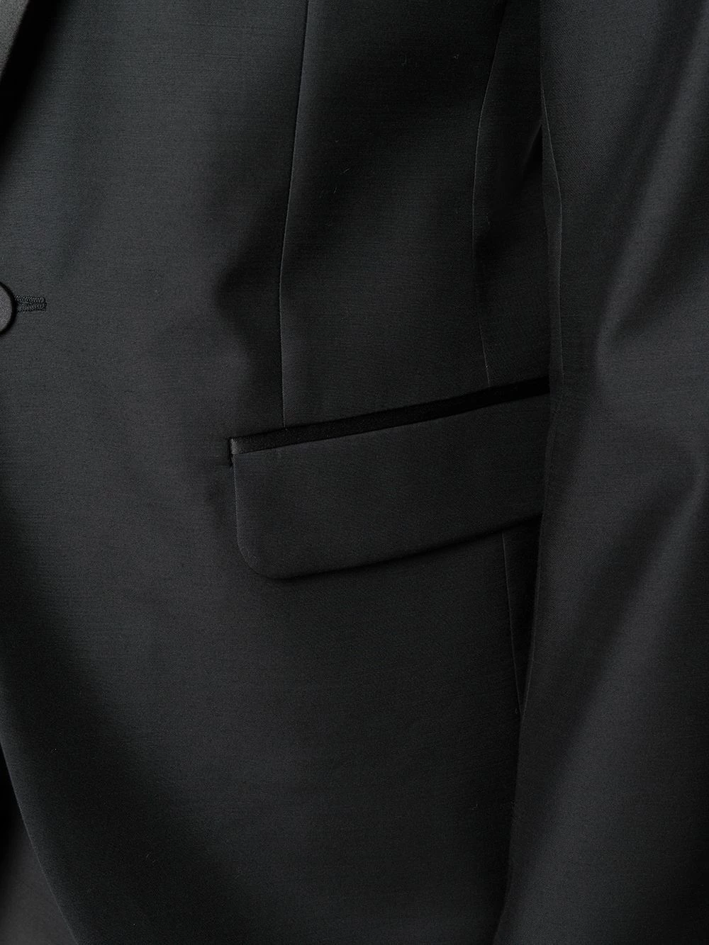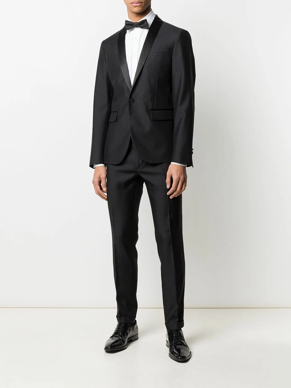 Costume classique Dsquared2 avec revers classiques, fixation à boutons, poches latérales, manches longues, longueur classique et passants de ceinture à la taille. Couleur : noir.