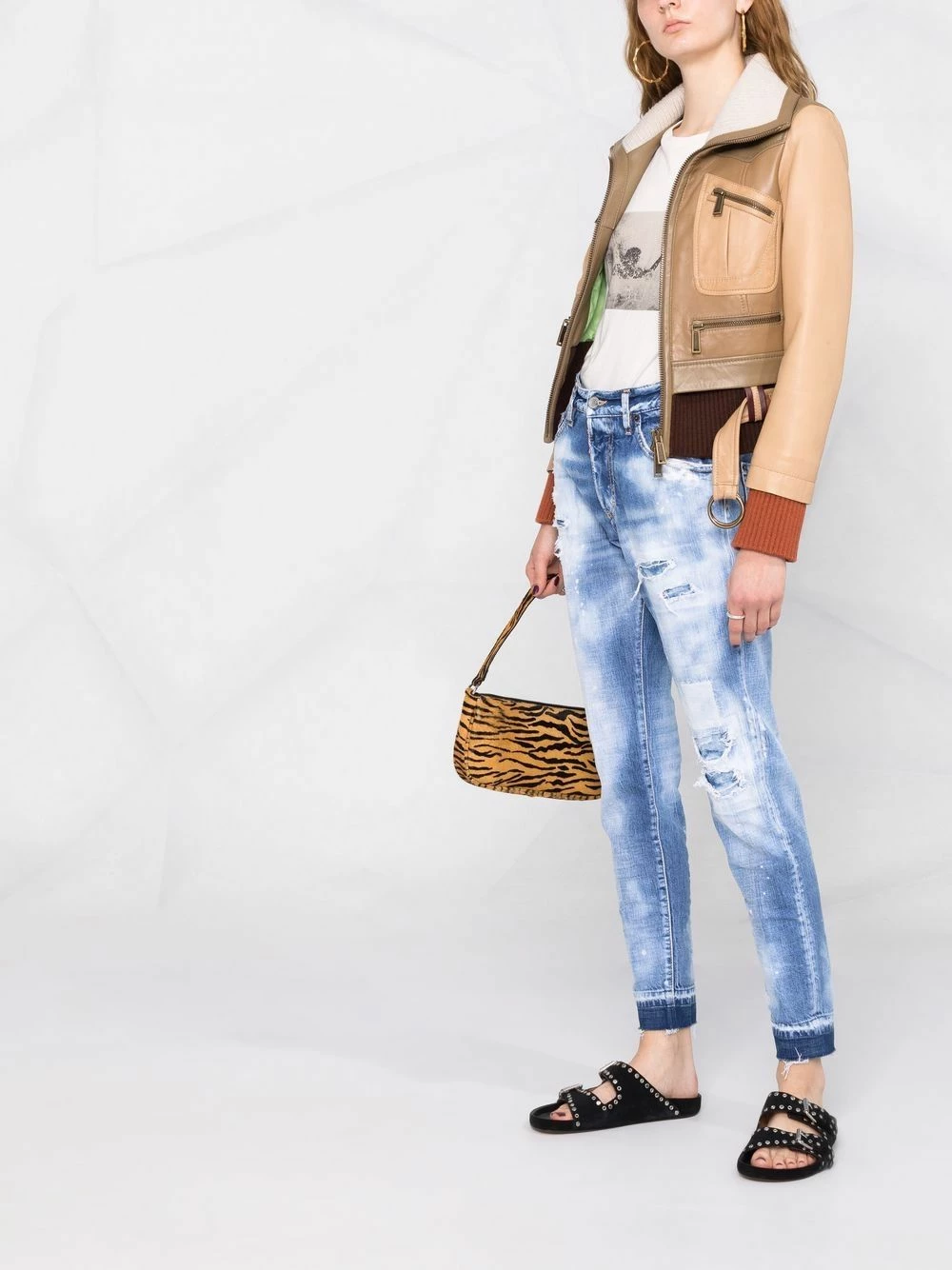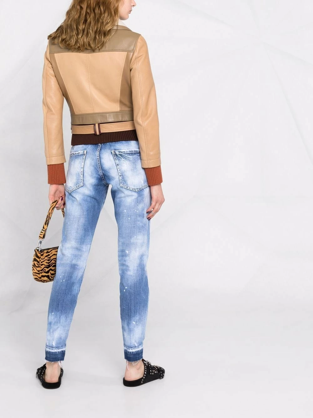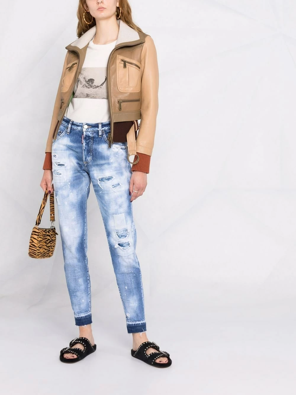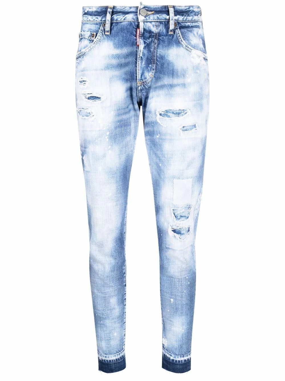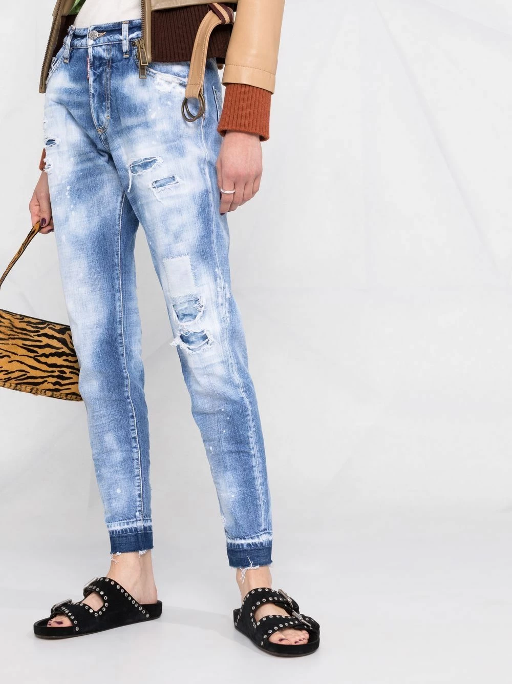 Effet délavé, effet usé, coupe slim, passants de ceinture, fermeture dissimulée sur le devant, cinq poches classiques. Couleur : bleu.
