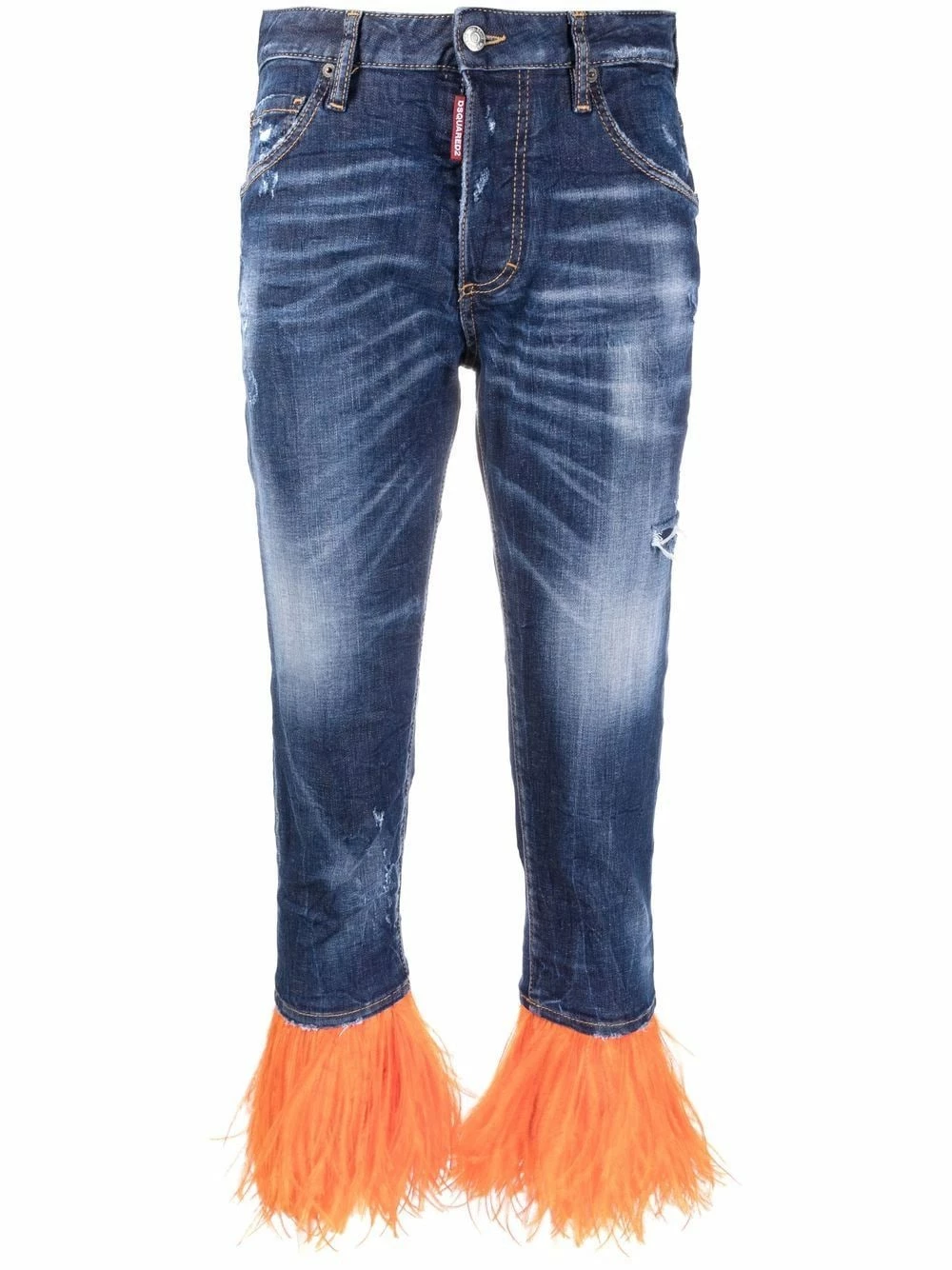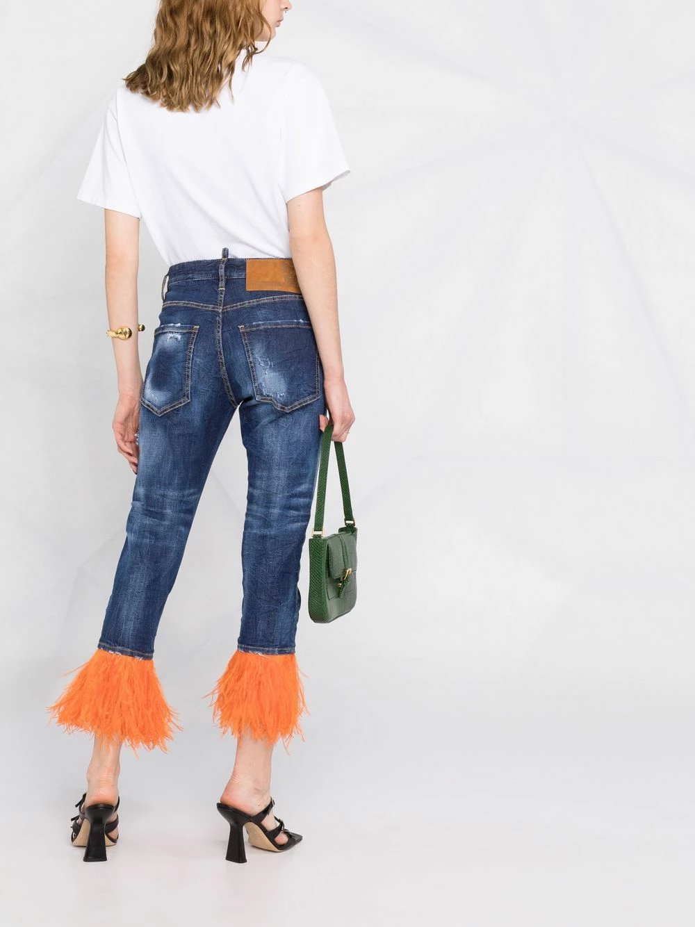 Finitions en plumes, effet délavé, effet usé, finitions à effet usé, taille mi-haute, longueur crop, passants de ceinture, fermeture dissimulée sur le devant, cinq poches classiques.