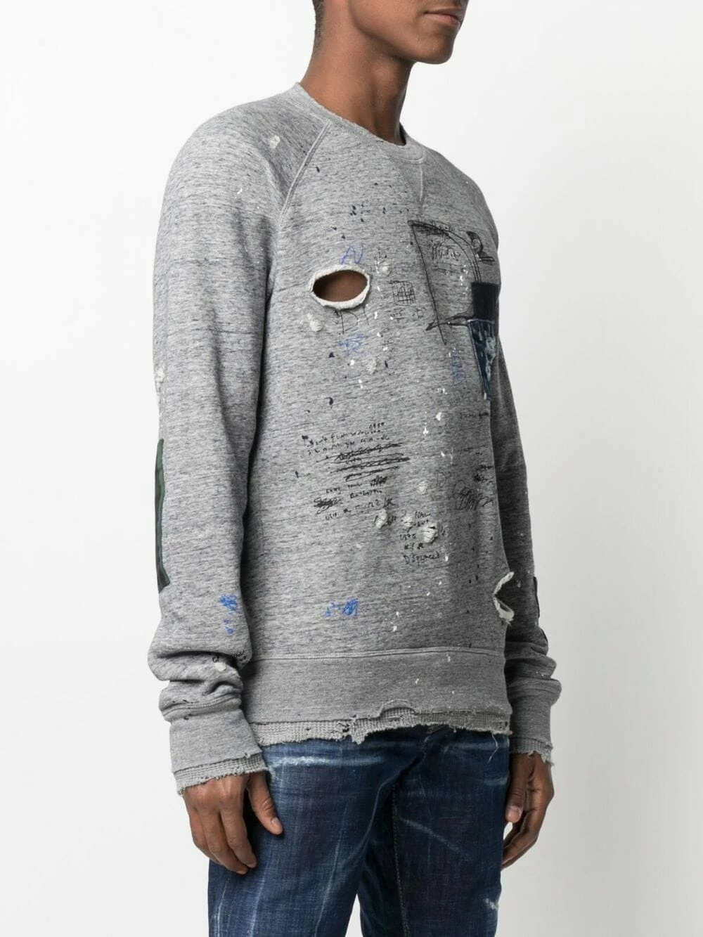 Design patchwork, effet usé, encolure ras du cou, manches longues, ourlet droit, bordures nervurées. Couleur : gris. Matière : coton.