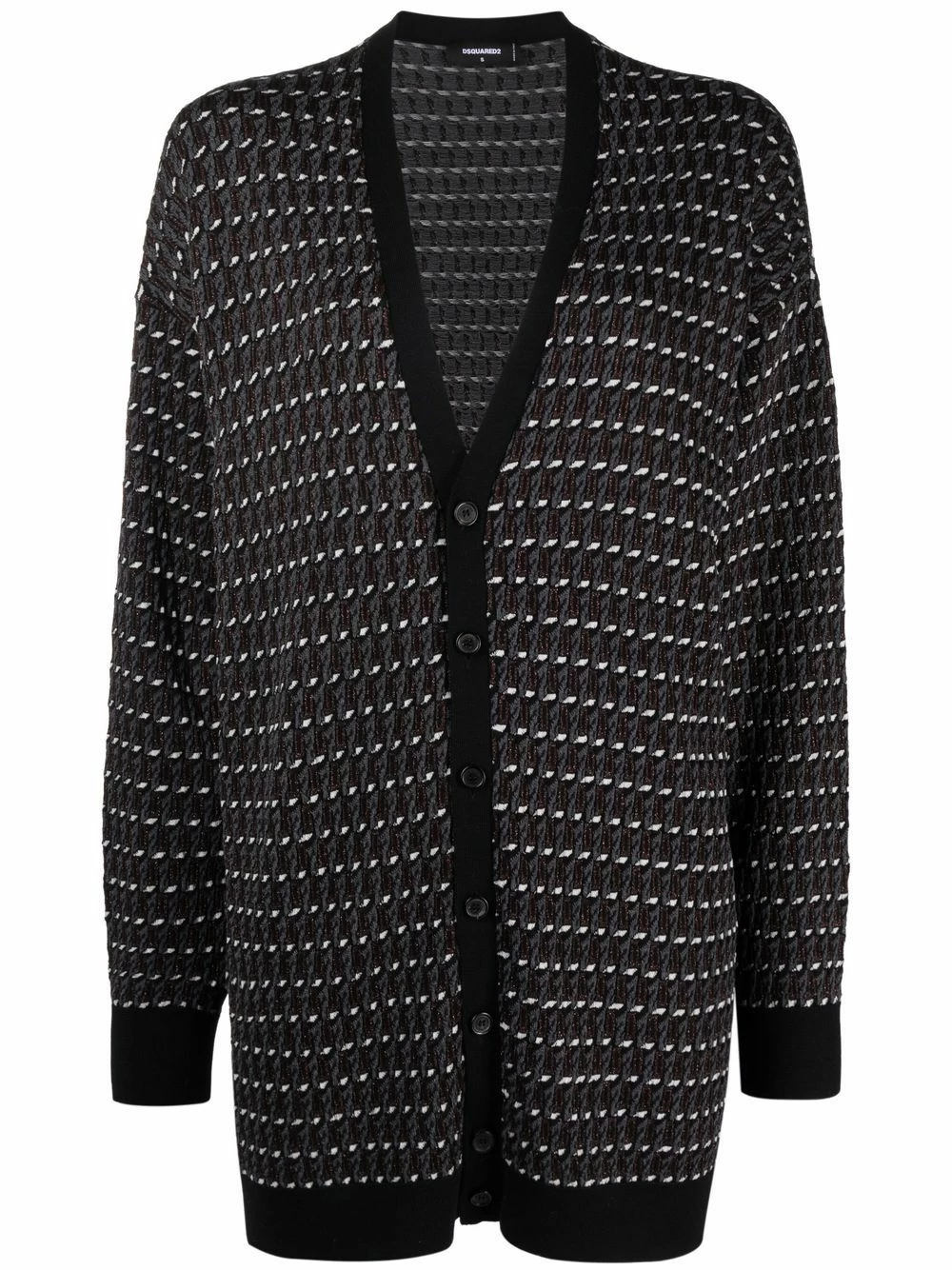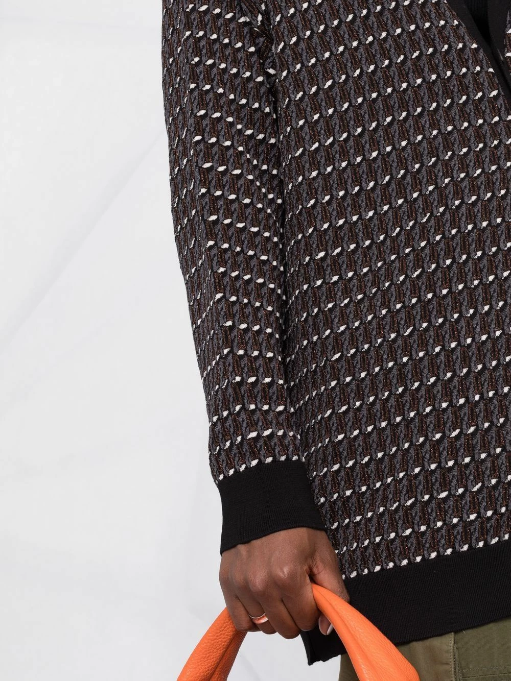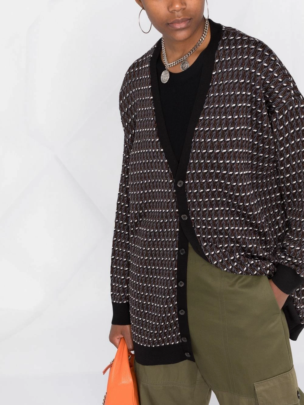 Motif géométrique, col v, manches longues, boutonnière sur le devant, ourlet droit.