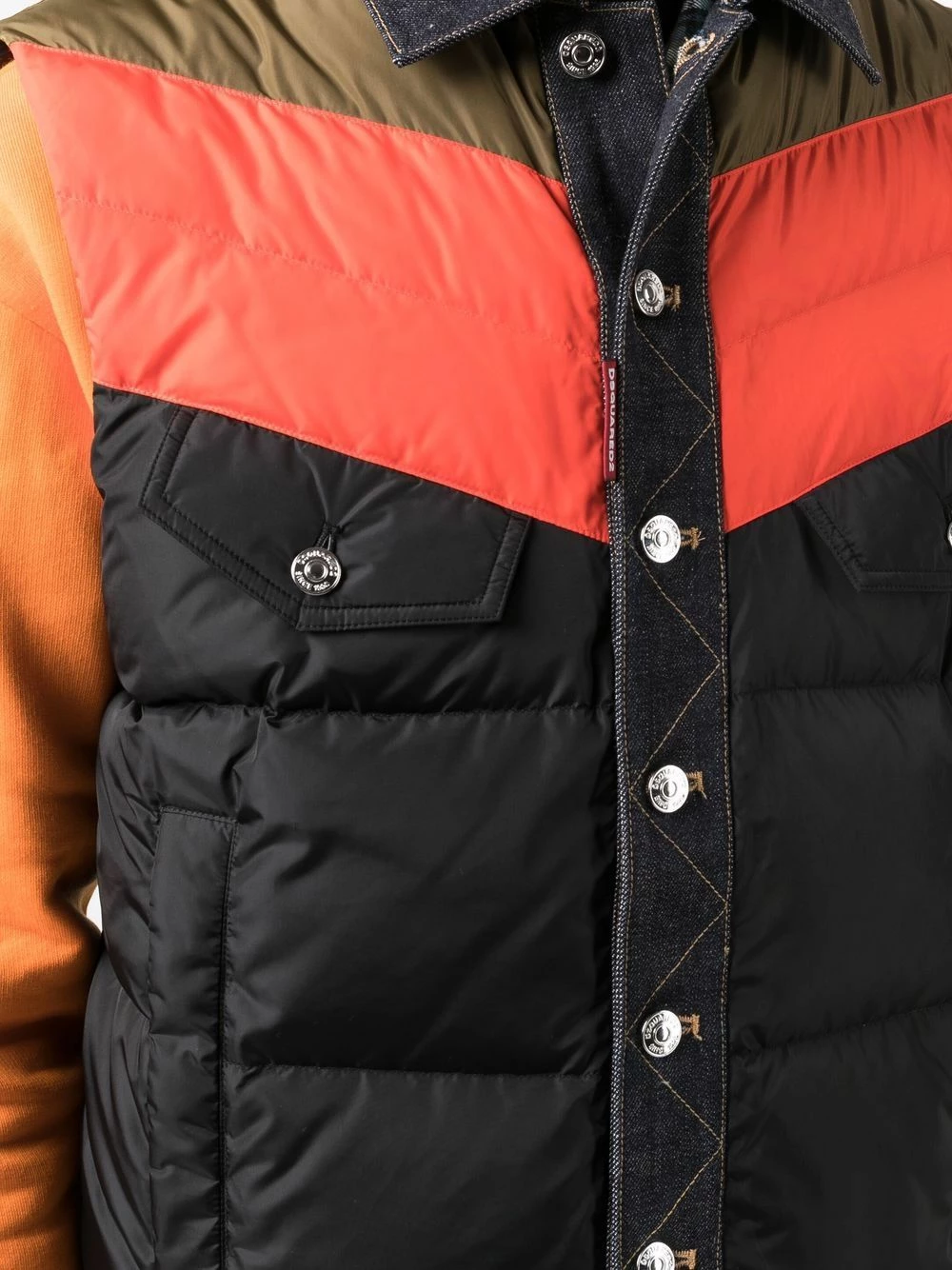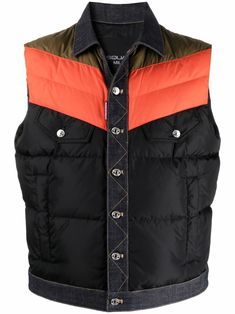 Design à empiècements colour block, design matelassé, col classique, boutonnière sur le devant, design sans manches, deux poches poitrine à rabat, deux poches passepoilées avant.