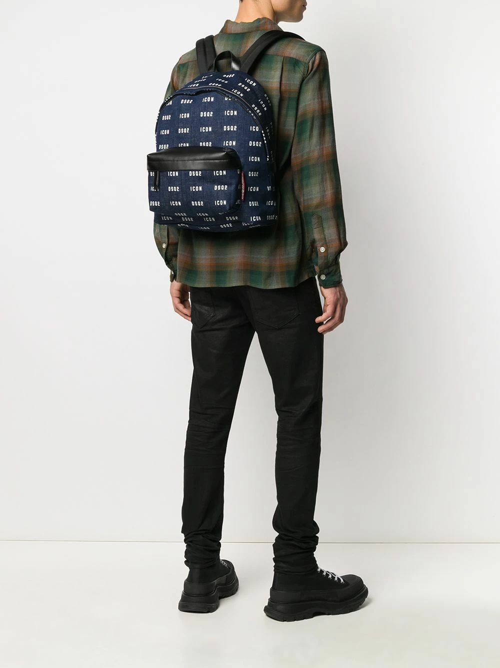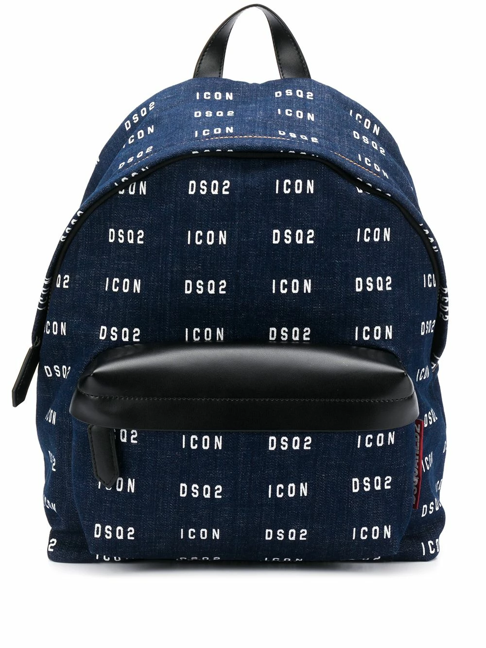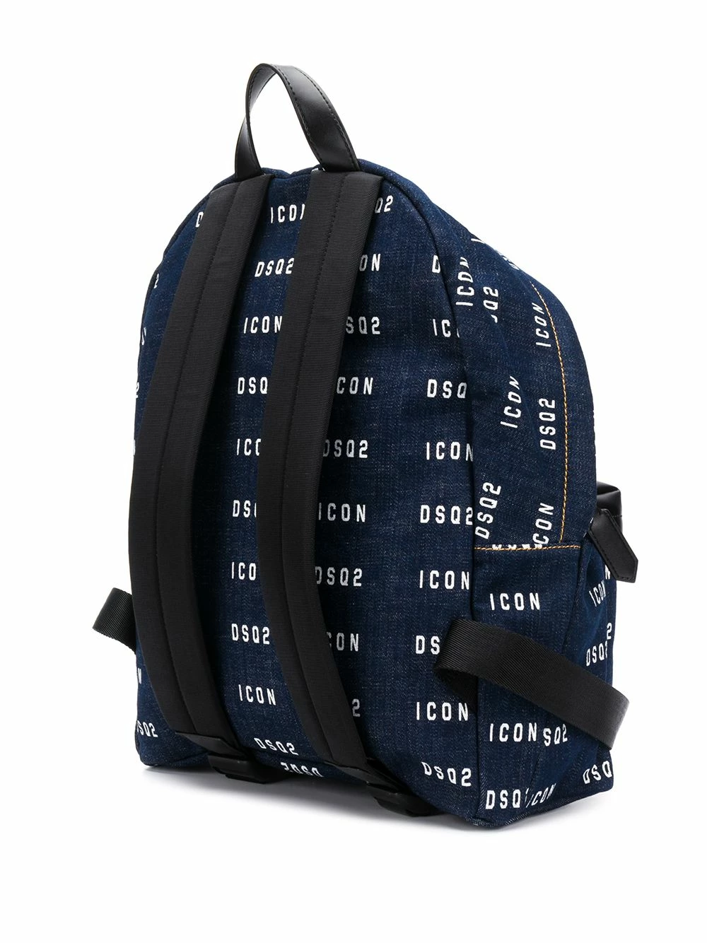 Sac à dos à logo imprimé en denim Dsquared2 avec anse sur le dessus, bretelles ajustables, fermeture zippée sur le dessus, poche zippée devant et poche intérieure zippée. Couleur : bleu.