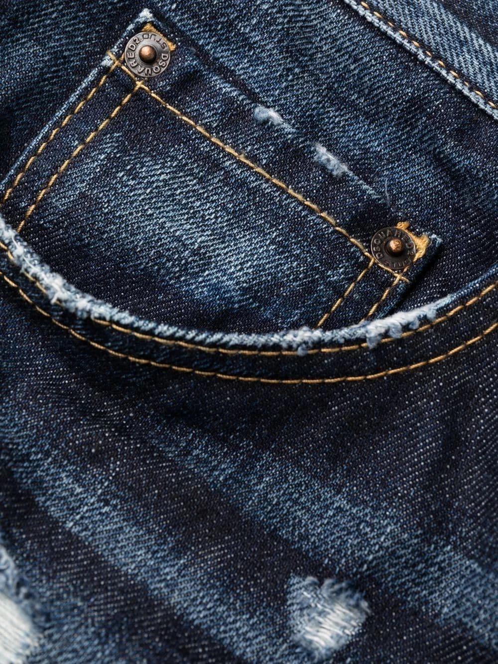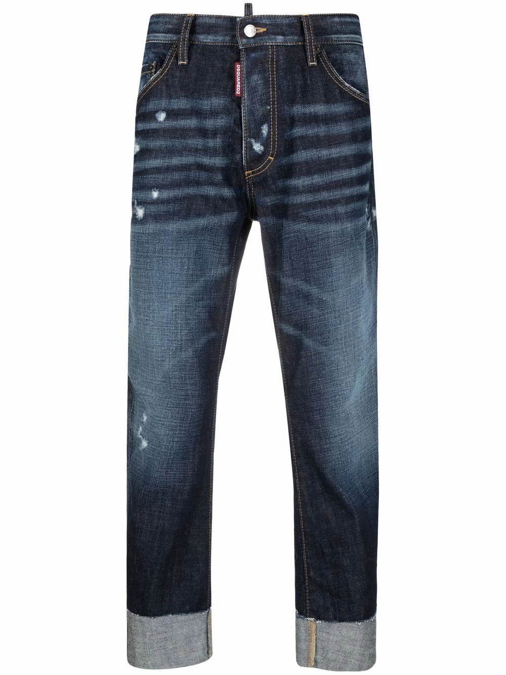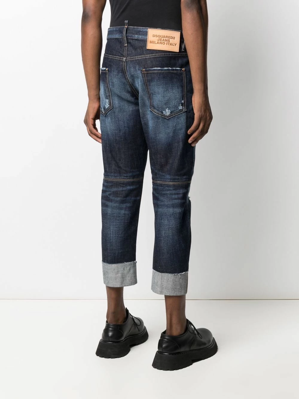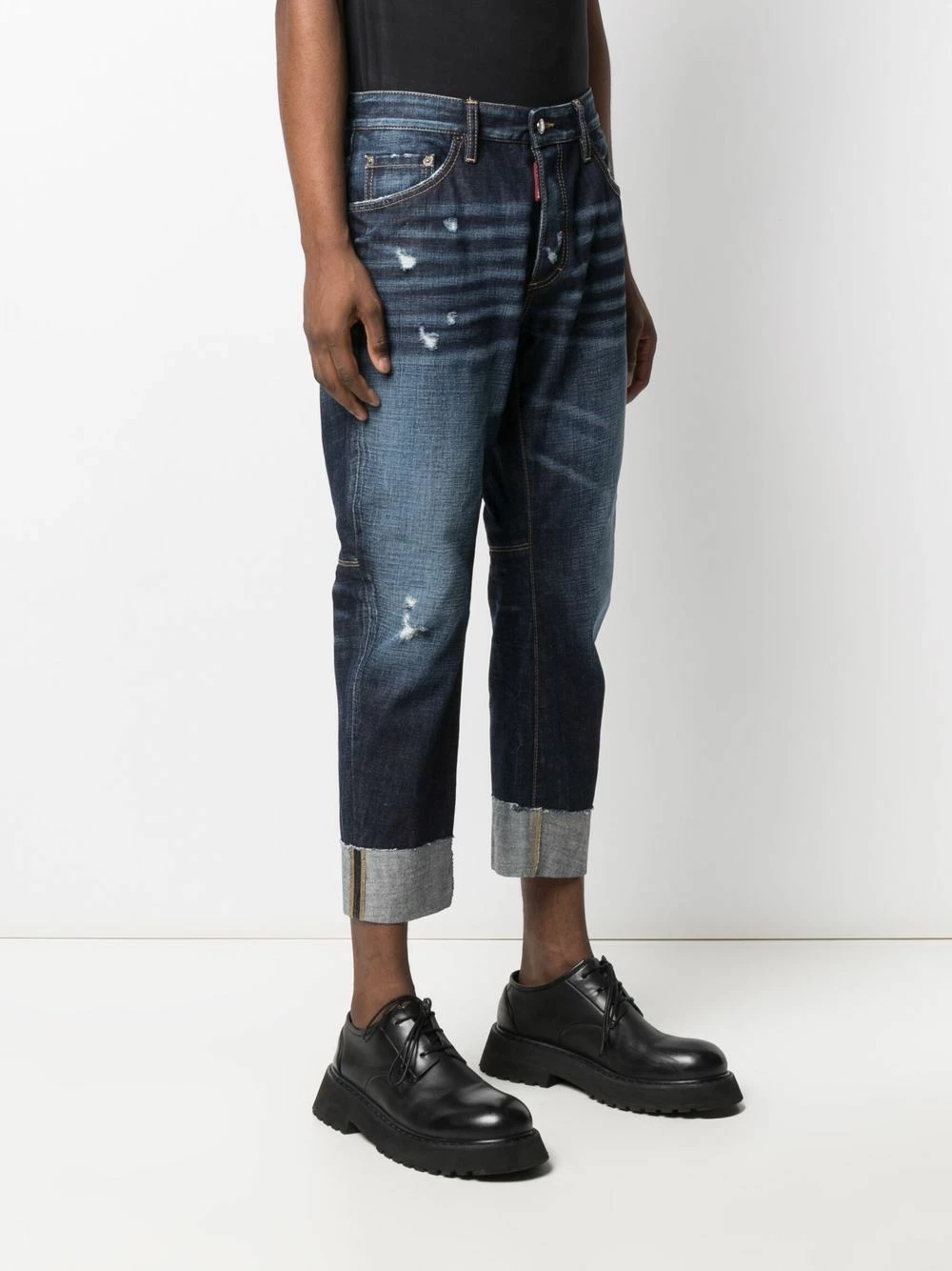 Effet usé, effet délavé, taille mi-haute, passants de ceinture, fermeture à zip et boutons sur le devant, coupe droite, longueur crop. Couleur : bleu. Matière : coton.