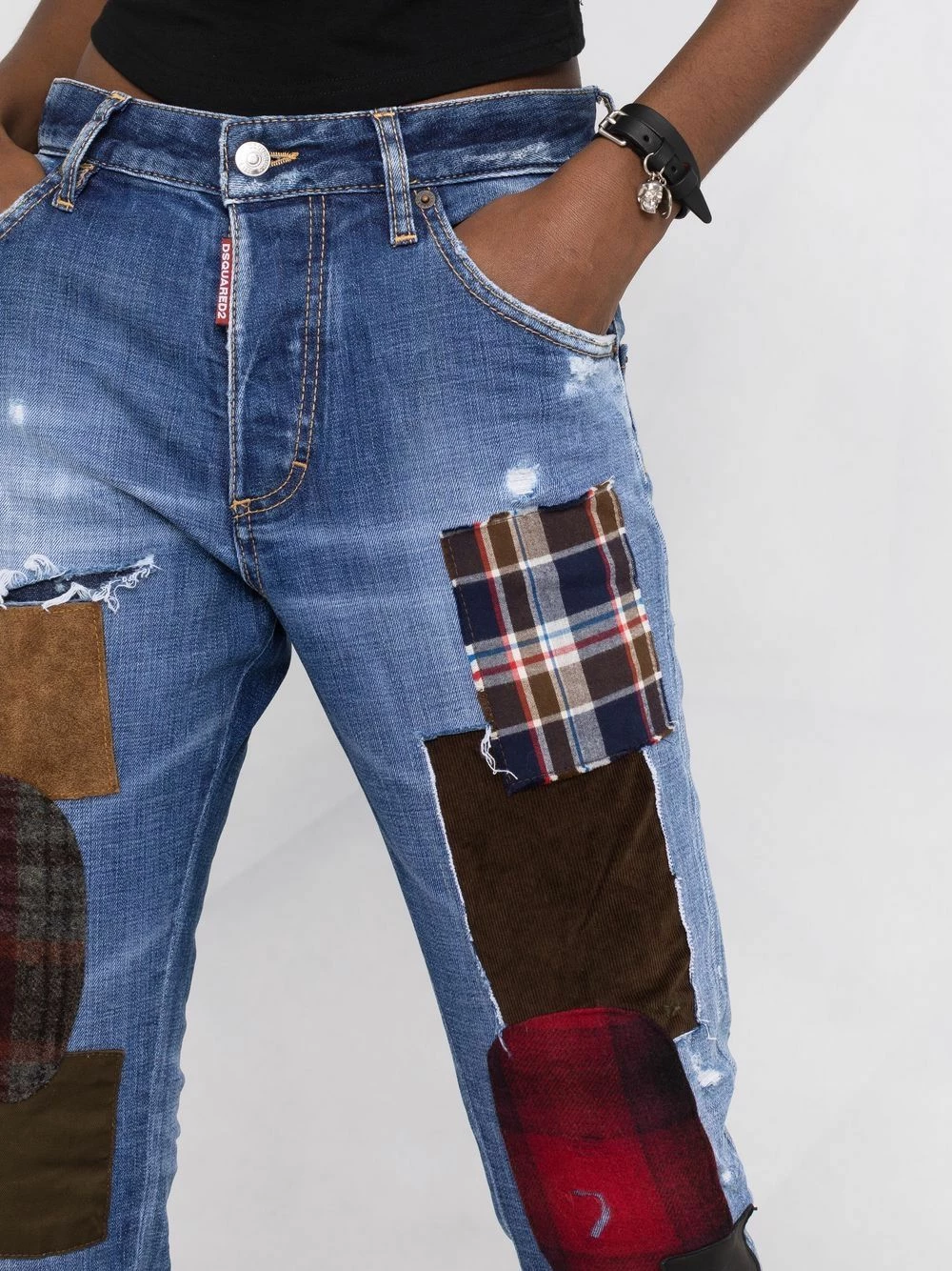 Design patchwork, effet usé, taille mi-haute, longueur crop, passants de ceinture, fermeture dissimulée sur le devant, cinq poches classiques. Couleur : bleu.