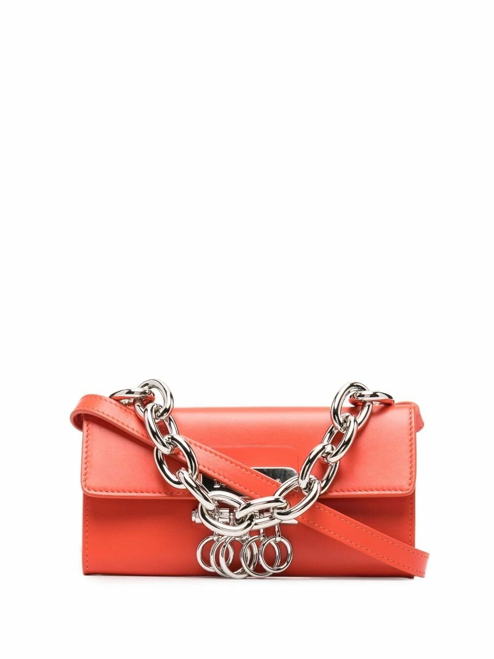 Logo gravé, porte-clés pendant, rabat sur le devant, fermeture magnétique, bride porté épaule en chaîne, bride porté épaule détachable et ajustable, compartiments intérieurs pour carte. Matière : cuir de veau.