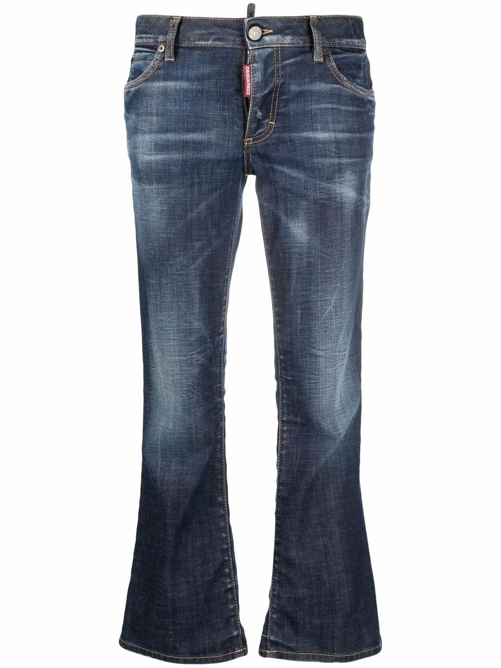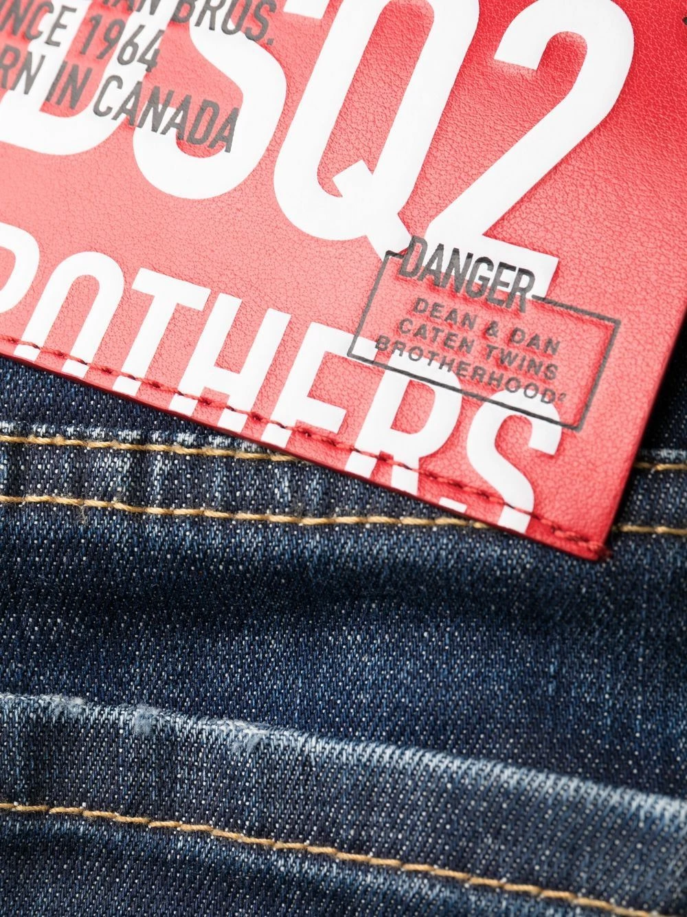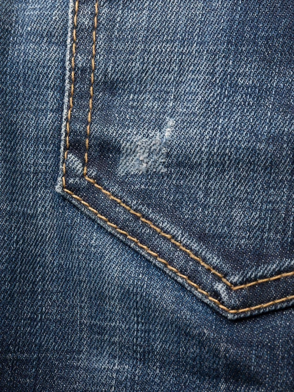 Taille basse, passants de ceinture, coutures contrastantes, cinq poches classiques, finitions à effet usé, effet délavé, patch logo sur l’arrière, coupe évasée, coupe courte. Couleur : bleu.